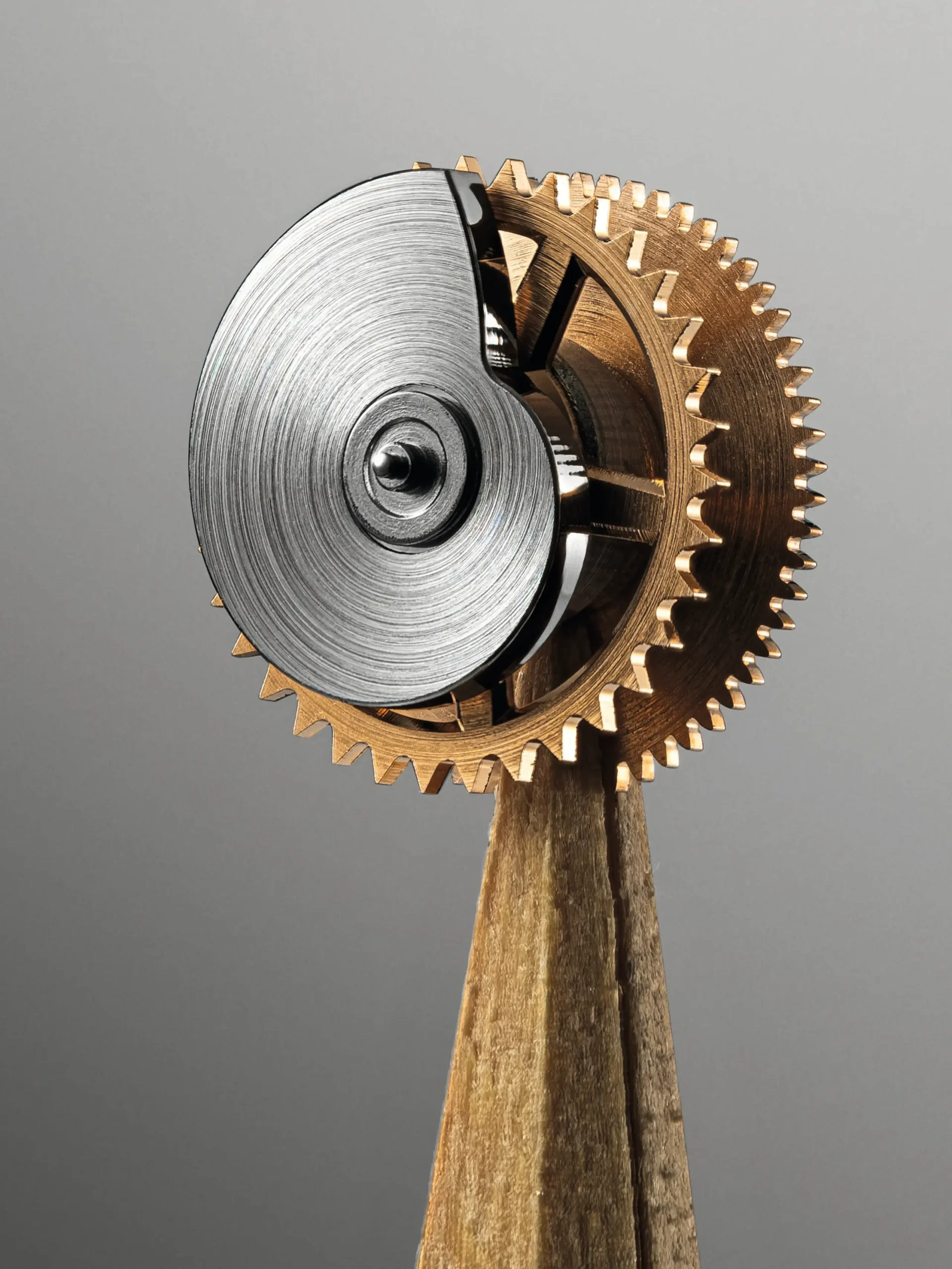 가장자리에는 1부터 31까지 숫자가 적인 링이 고정되어 있다. 오늘 날짜를 가리키는 초승달 모양의 인디케이터는 매일 한 칸씩 앞으로 나아간다. 스위스 르 로클의 장인 안드레 마르티네즈가 수작업으로 페인팅한 두 개의 디스크를 겹쳐서 날짜와 요일을 구분한다. 안트라사이트 컬러는 평일을, 골드 컬러는 주말을 의미한다. 6시 방향에는 4개의 점이 자리한다. 31일과 1일 사이에 있는 이 점을 통해 애니데이는 5주를 표시하는 셈이다. 31일과 1일이 나란히 붙어 있을 경우 사용자는 자칫 날짜를 혼동할 수 있다. 크래용은 시각적 완충 장치이자 일시 정지 역할을 하는 점을 이용해 문제를 해결하는 동시에 이미 지나간 시간과 앞으로 시작할 시간을 연결하여 한 달이 분절되지 않고 이어지는 것처럼 느껴지게 만들었다.