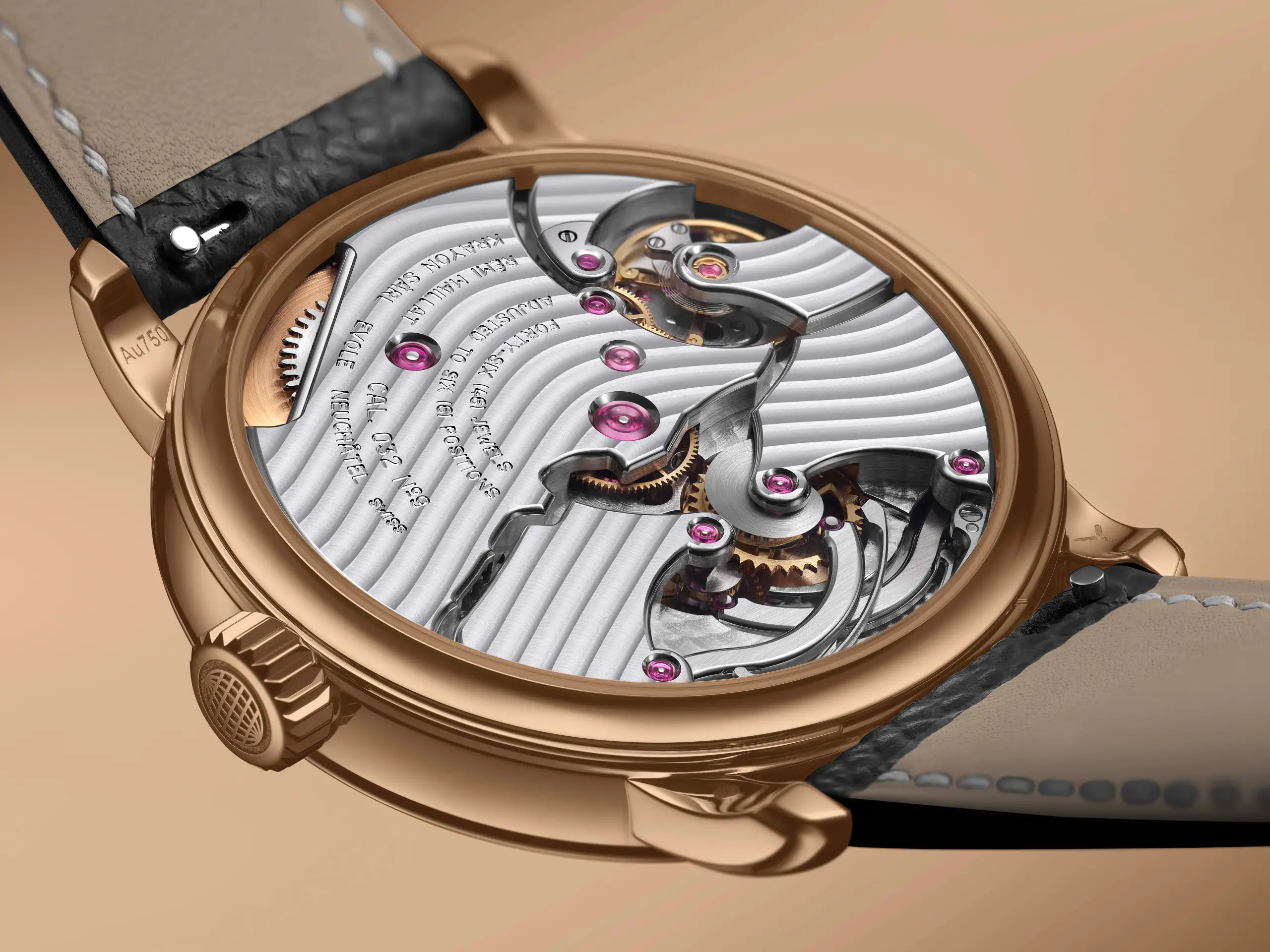 화려한 피니싱을 보여주는 핸드와인딩 칼리버 C032는 378개의 부품으로 이루어졌다. 브리지는 예리한 챔퍼링, 독특한 물결무늬 패턴으로 장식했다. 선명하고 큼지막한 주얼, 미러 폴리싱한 이스케이프 휠 콕, 블레이드 클릭, 프리스프렁 밸런스, 페를라주를 빼곡히 채운 플레이트 등 모든 부품을 고전적인 방식으로 아름답게 가공했다. 시간당 진동수는 21,600vph(3Hz), 파워리저브는 72시간이다.