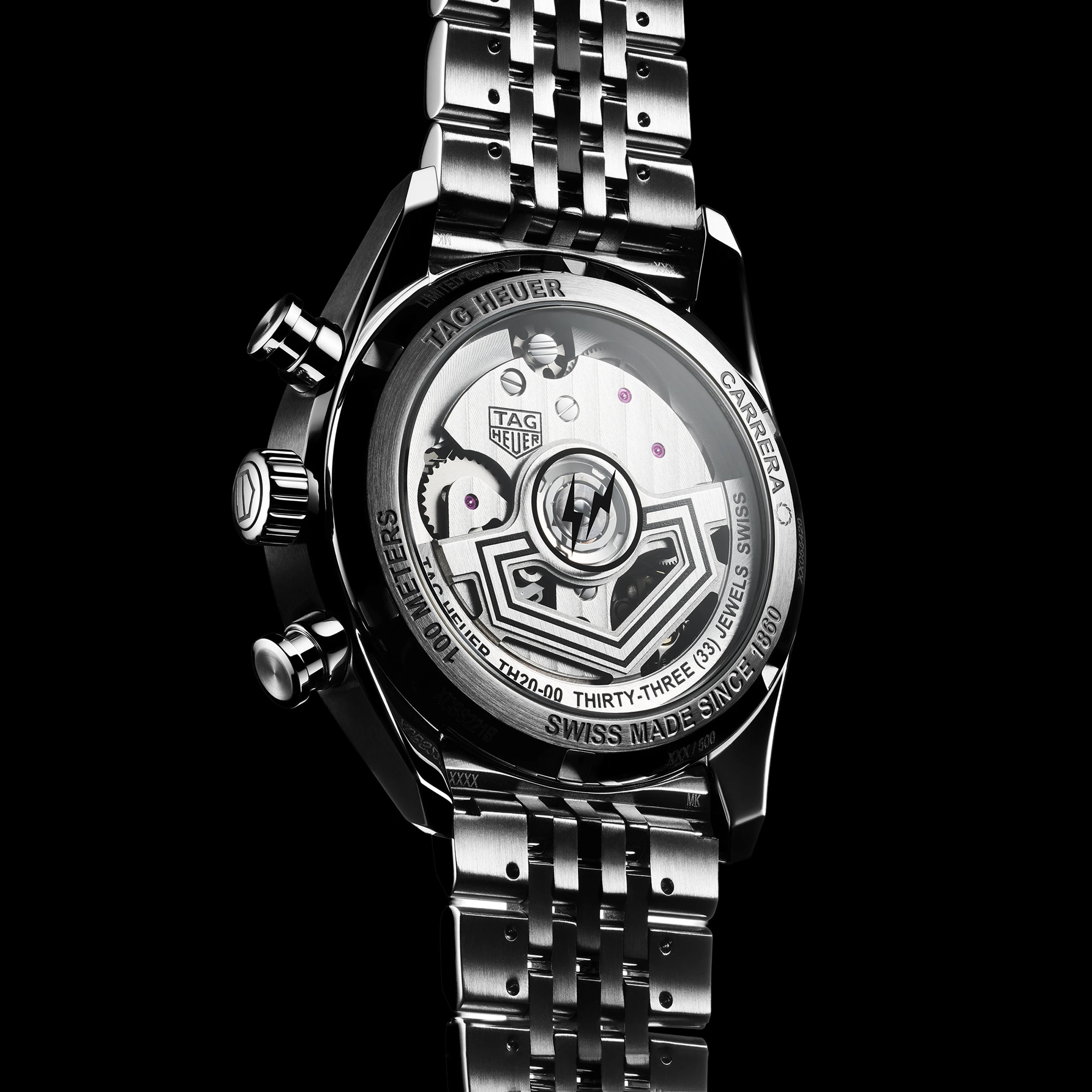 무브먼트는 파워리저브가 80시간이나 되는 칼리버 TH20-00을 사용했다. 방패 모양의 오픈워크 로터는 프래그먼트 스타일로 변주했다. 컬럼 휠과 수직 클러치의 조합이라는 현대 크로노그래프 무브먼트의 방정식을 따른다. 브리지는 제네바 스트라이프로 마감했다. 모노톤을 유지하기 위해 톱니바퀴도 실버 컬러로 처리했다. 시간당 진동수는 28,800vph(4Hz)다.