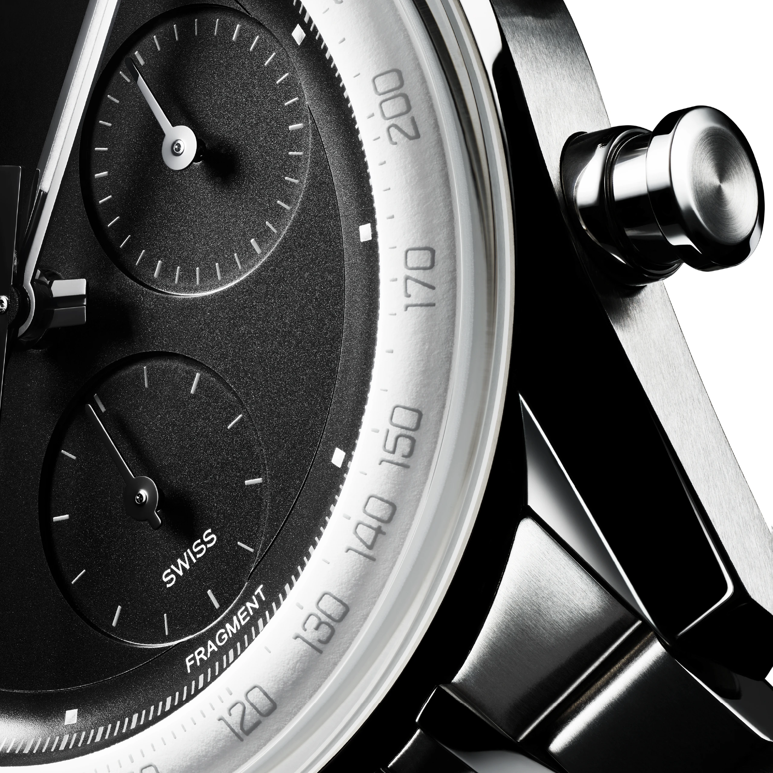 프래그먼트 리미티드 에디션 답게 미니멀한 디자인과 세련된 스타일을 추구한다. 글래스박스를 기반으로 한 스테인리스 스틸 케이스의 지름은 39mm, 두께는 13.9mm다. 브러시드와 폴리시드 가공을 교차 적용해 입체적이고 고급스러운 분위기를 살렸다. 글래스박스 특유의 베젤이 없는 디자인은 독특한 인상을 준다. 돔형 사파이어 크리스털 글라스 아래로 타키미터 스케일을 새긴 플랜지가 드러난다. 덕분에 개방감이 느껴지고, 가독성도 뛰어나다. 펌프 푸셔 스타일의 크로노그래프 버튼은 현대적인 시계에 빈티지한 감성을 한 스푼 추가하는 감초 같은 역할을 한다. 승리의 화환(Victory Wreath)이 새겨진 사파이어 크리스털 글라스백에는 프래그먼트의 번개 로고를 프린트했다. 방수는 100m다.