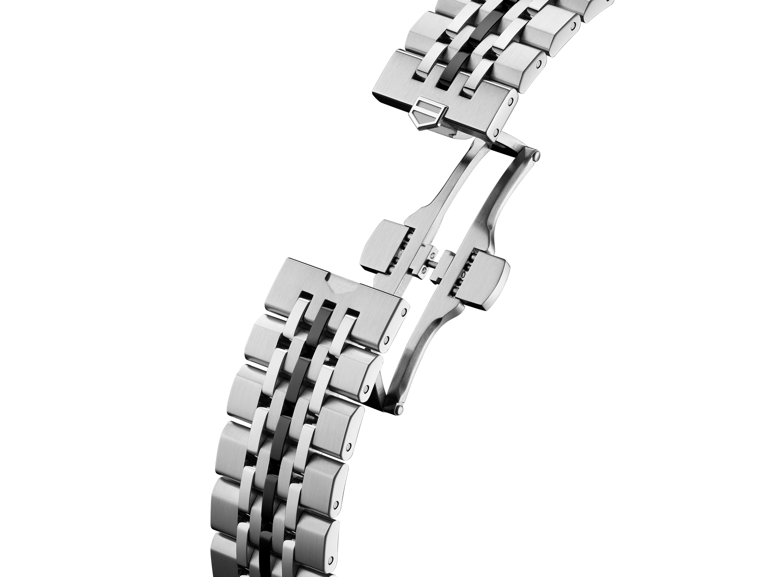 올해 새롭게 선보인 7열 비즈 오브 라이스 브레이슬릿도 프래그먼트의 디자인 언어로 재구성했다. 가운데 링크를 블랙 PVD 코팅 처리해 전체적인 디자인 기조를 이어간다. 양방향으로 열고 닫는 구조의 폴딩 버클은 태그호이어의 방패 로고로 기교를 부렸다.