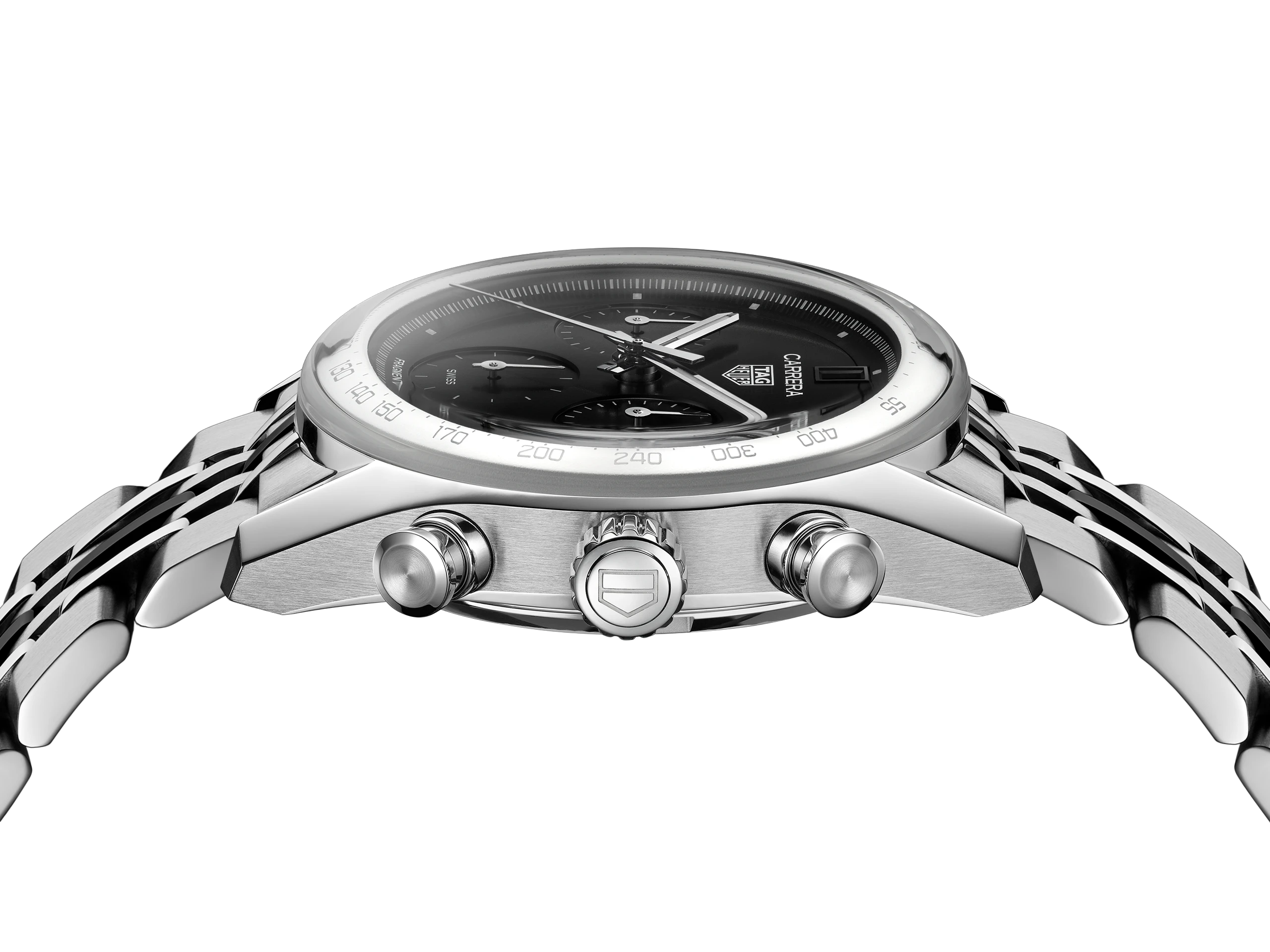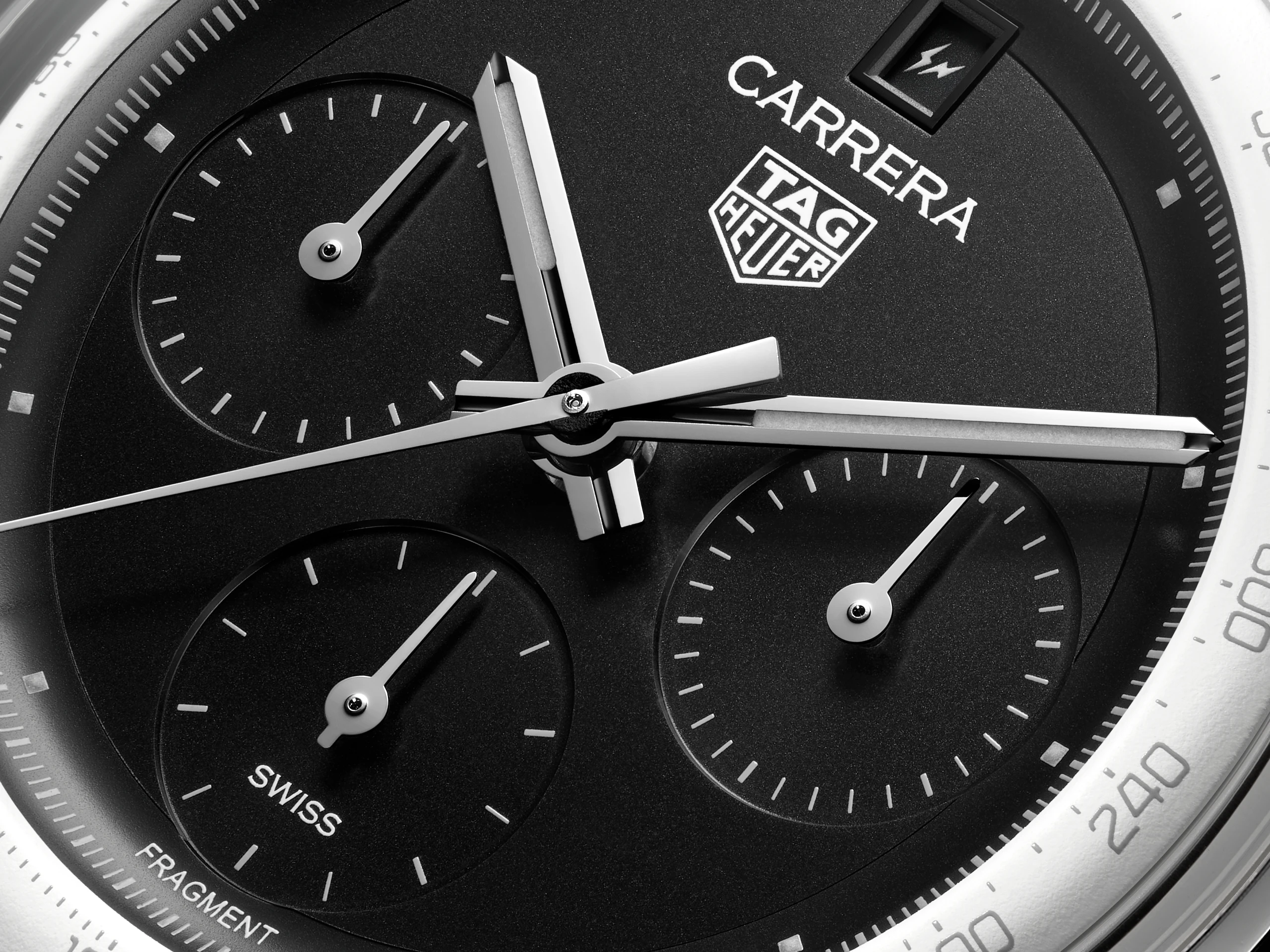 플랜지와 블랙 오팔린 다이얼은 강렬한 흑백의 대비로 시선을 사로잡는다. 여기에 로듐 도금한 바늘과 실버 마감한 플랜지 및 카운터의 인덱스가 시계를 한층 더 세련되게 만든다. 눈금만으로 단순하게 처리한 카운터는 히로시 후지와라의 미니멀한 철학을 명확하게 보여준다. 3시 방향은 크로노그래프 30분 카운터, 9시 방향은 크로노그래프 12시간 카운터에 해당한다. 마지막으로, 6시 방향에는 스몰 세컨즈와 프래그먼트 문구가 있다. 태그호이어와 까레라의 로고 위로 날짜 창이 자리한다. 매월 1일과 11일에는 번개 모양의 프래그먼트 로고가 숫자를 대신해 날짜를 표시한다.