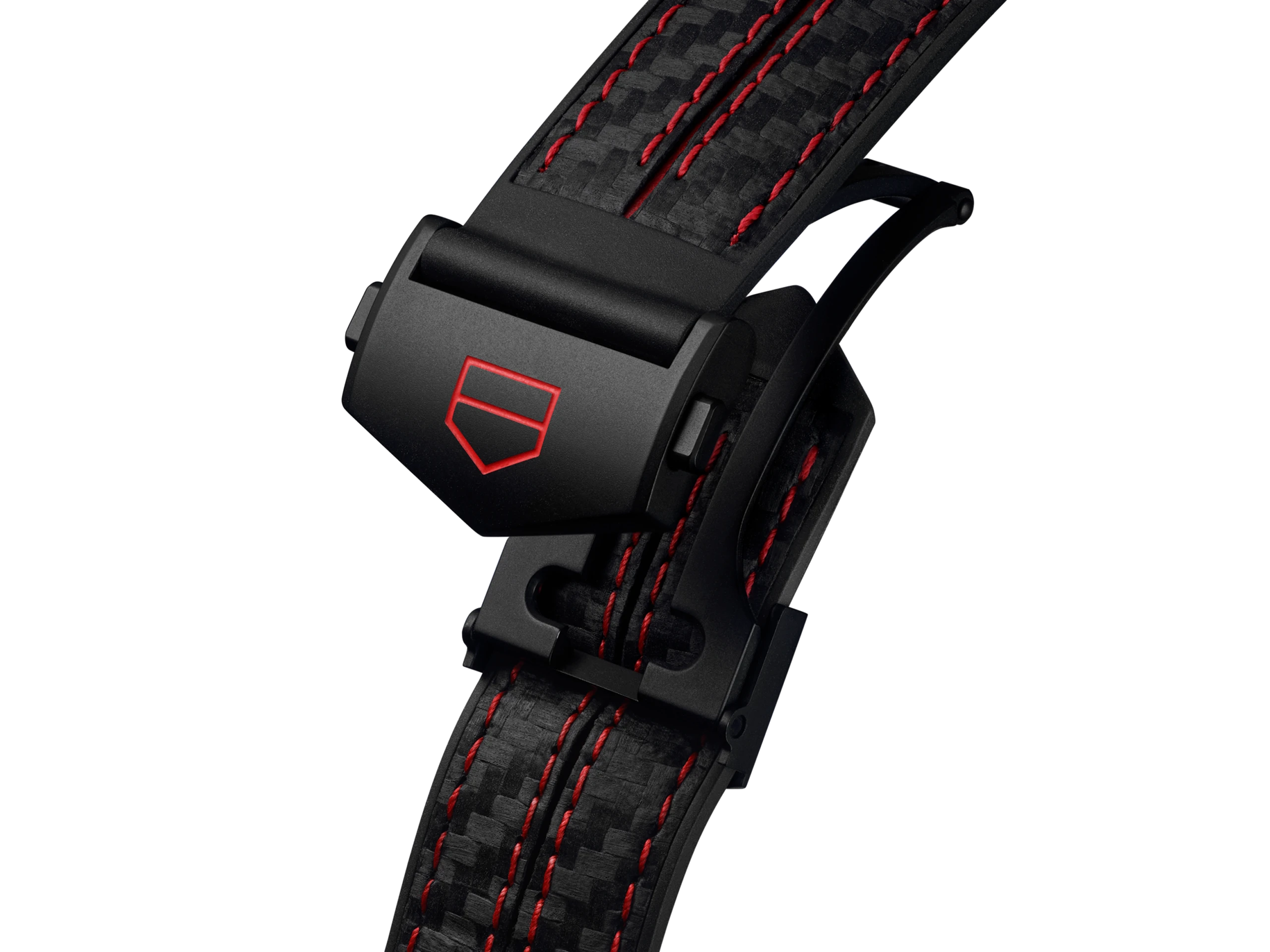스트랩은 두 가지로 나뉜다. 검은색 가죽과 고무를 이용한 첫 번째 스트랩은 강렬한 빨간색 스티칭과 카본 파이버 패턴으로 장식했다. 두 번째는 빨간색과 검은색을 이용한 나토 스트랩으로 보다 편안한 착용감을 선사한다.