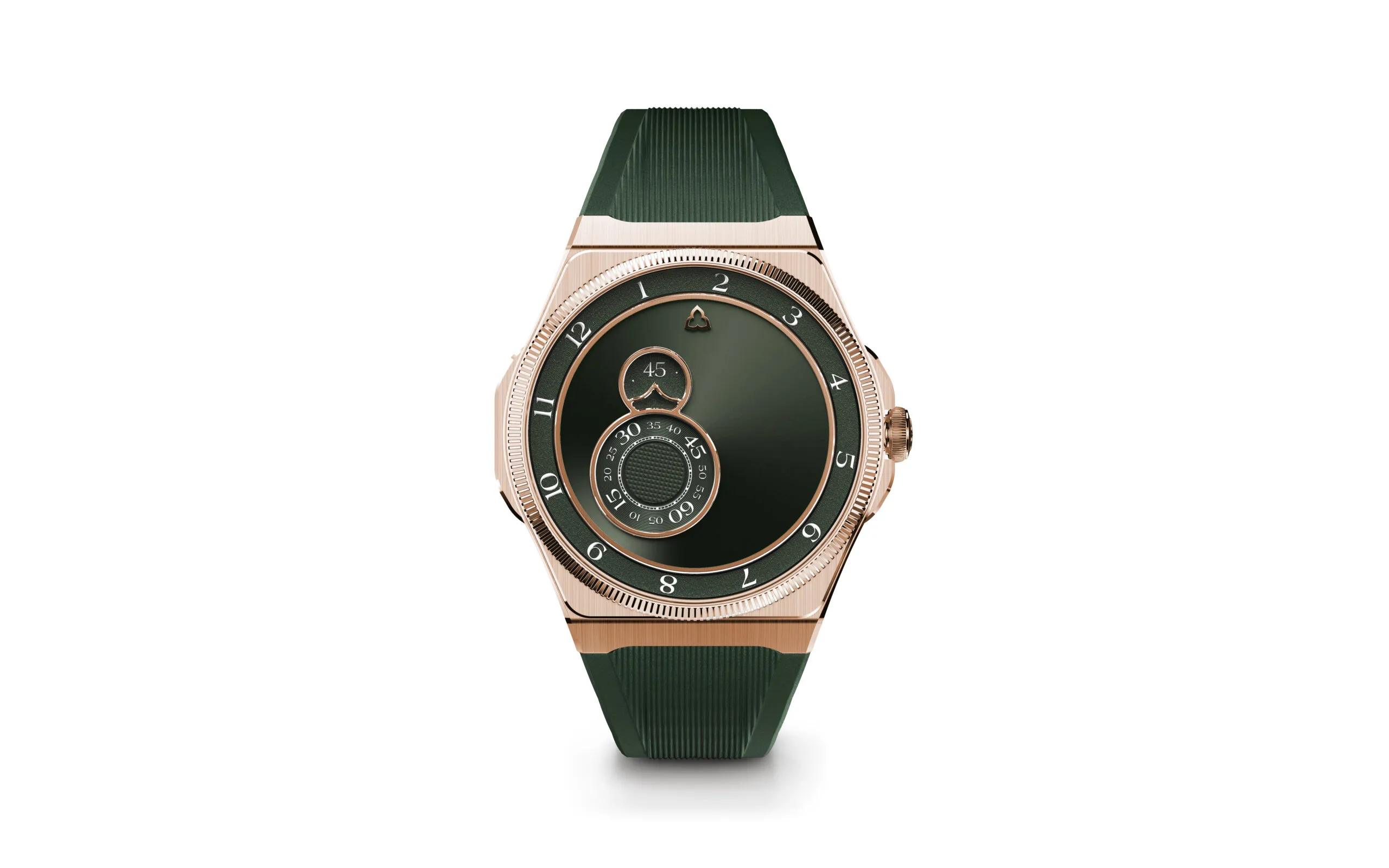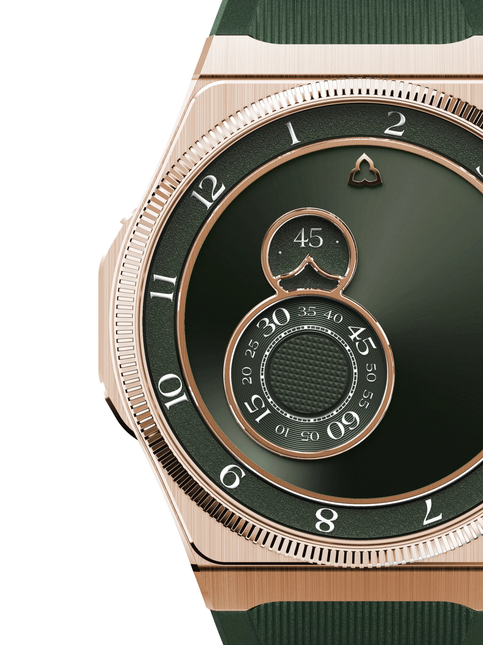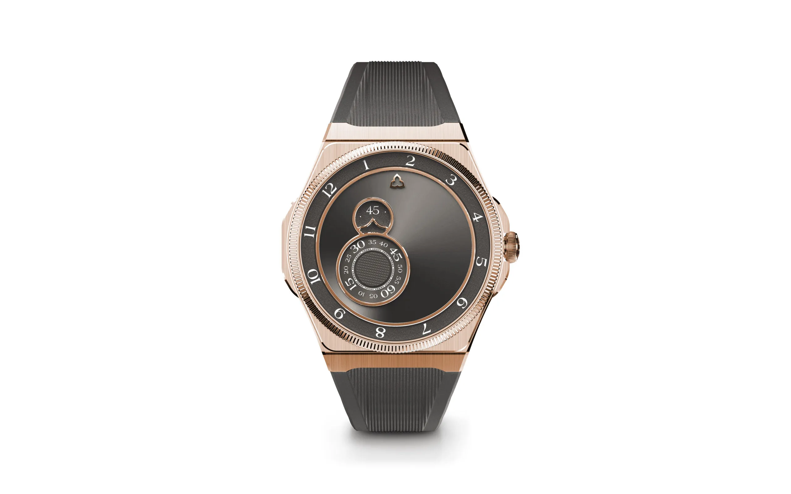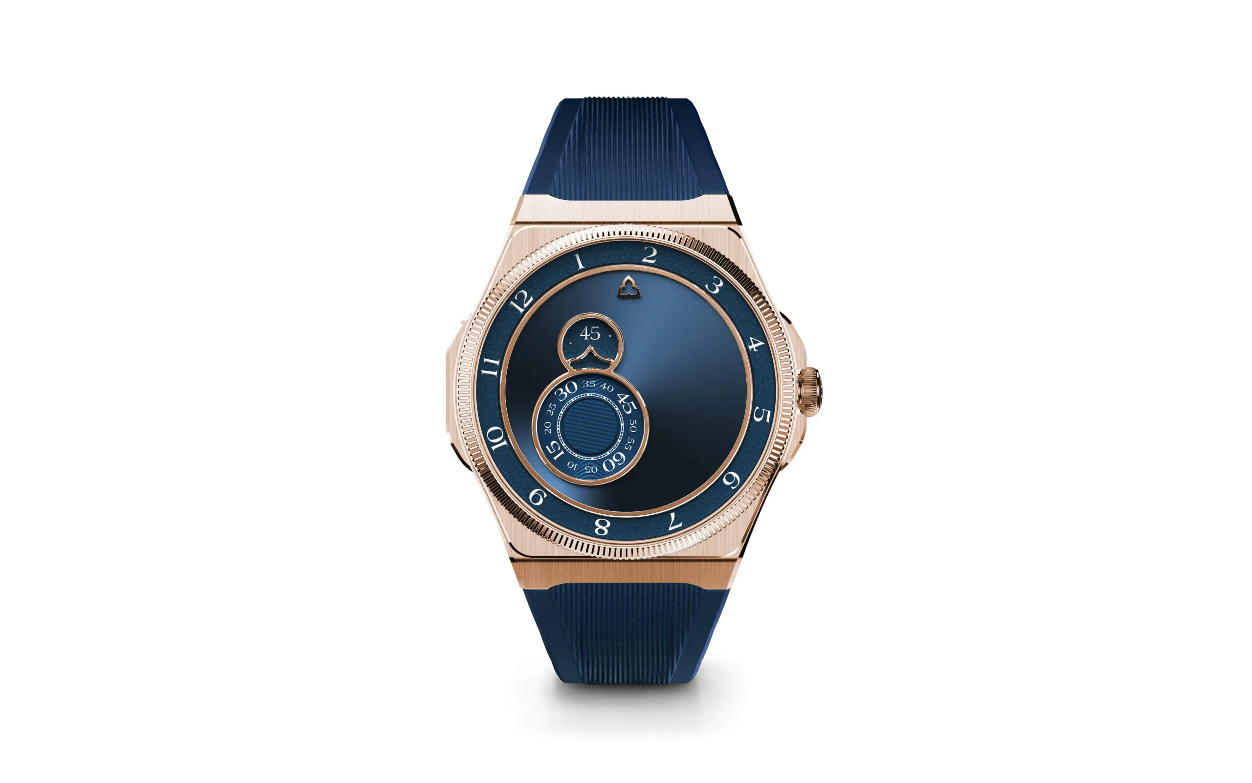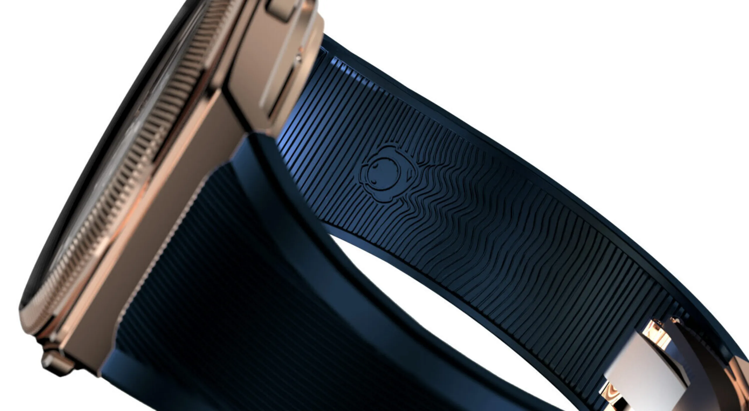 이번 업데이트에서 주목할 점은 트랑트-두 컬렉션 최초의 러버 스트랩 모델이다. 로즈골드 케이스와 조합한 러버 스트랩은 이 컬렉션을 보다 활동적이고 캐주얼한 시계로 만든다. 설계 방식도 주목할 만하다. 2개의 파트로 구성된 스틸 몰드에 소재를 직접 주입하는 단일 공정으로 제작되어 정밀도와 내구성을 확보했다. 케이스와 스트랩을 연결하는 금속 인서트는 몰드 안에 직접 위치시킨 뒤 러버를 주입하는 방식으로 제작해 견고하다. 폴딩 클라스프 역시 러버 내부에 매립된 링크를 통해 스트랩에 고정된다.