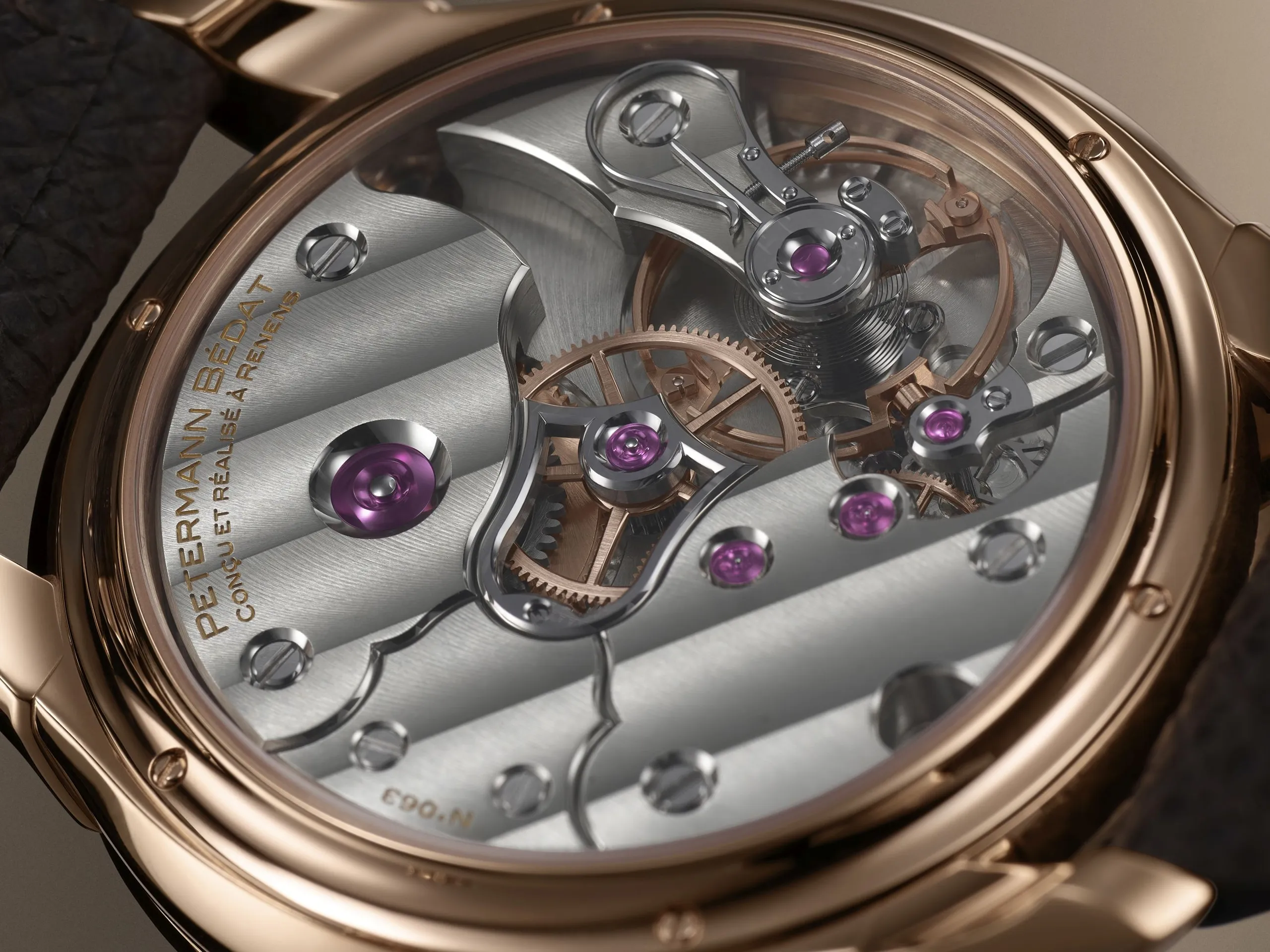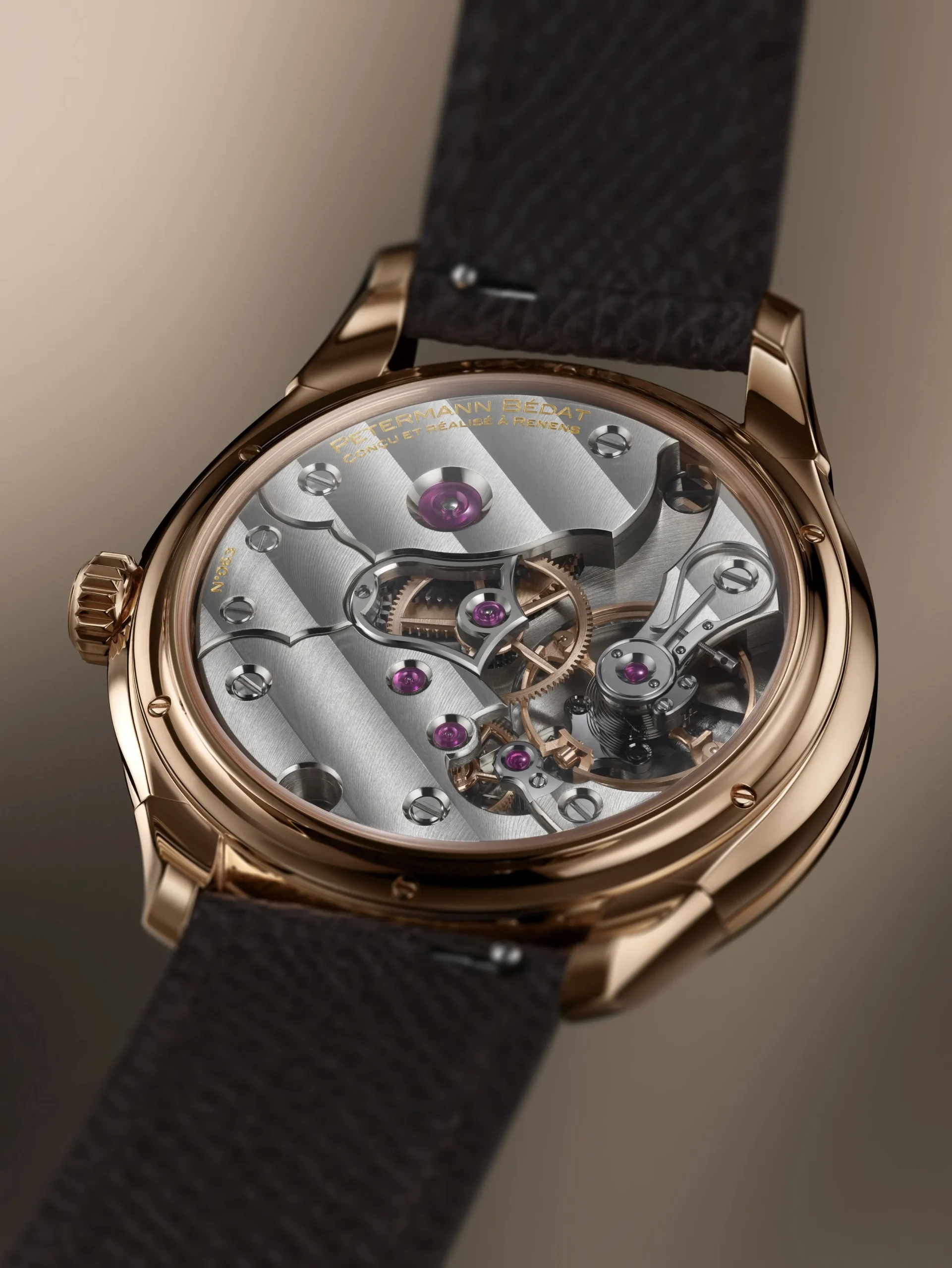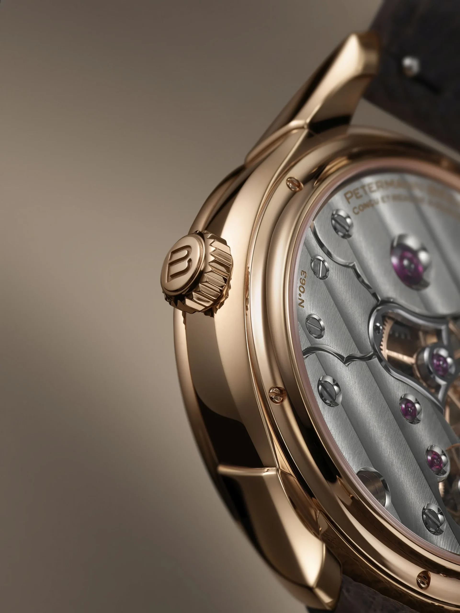 전작인 2941의 케이스를 토대로 디자인한 로즈 골드 케이스의 지름은 38mm, 두께는 10.15mm다. 일견 심심한 듯한 케이스지만 러그를 케이스에 납땜하는 전통적인 방식을 따랐다. 케이스와 러그 하단은 베벨링으로 넓게 깎아내 입체적인 느낌을 전달한다. 2941과 1825를 거치며 페터만 베다는 케이스 디자인의 언어를 확립했으며, 앞으로도 동일한 케이스를 사용할 것임을 밝혔다.