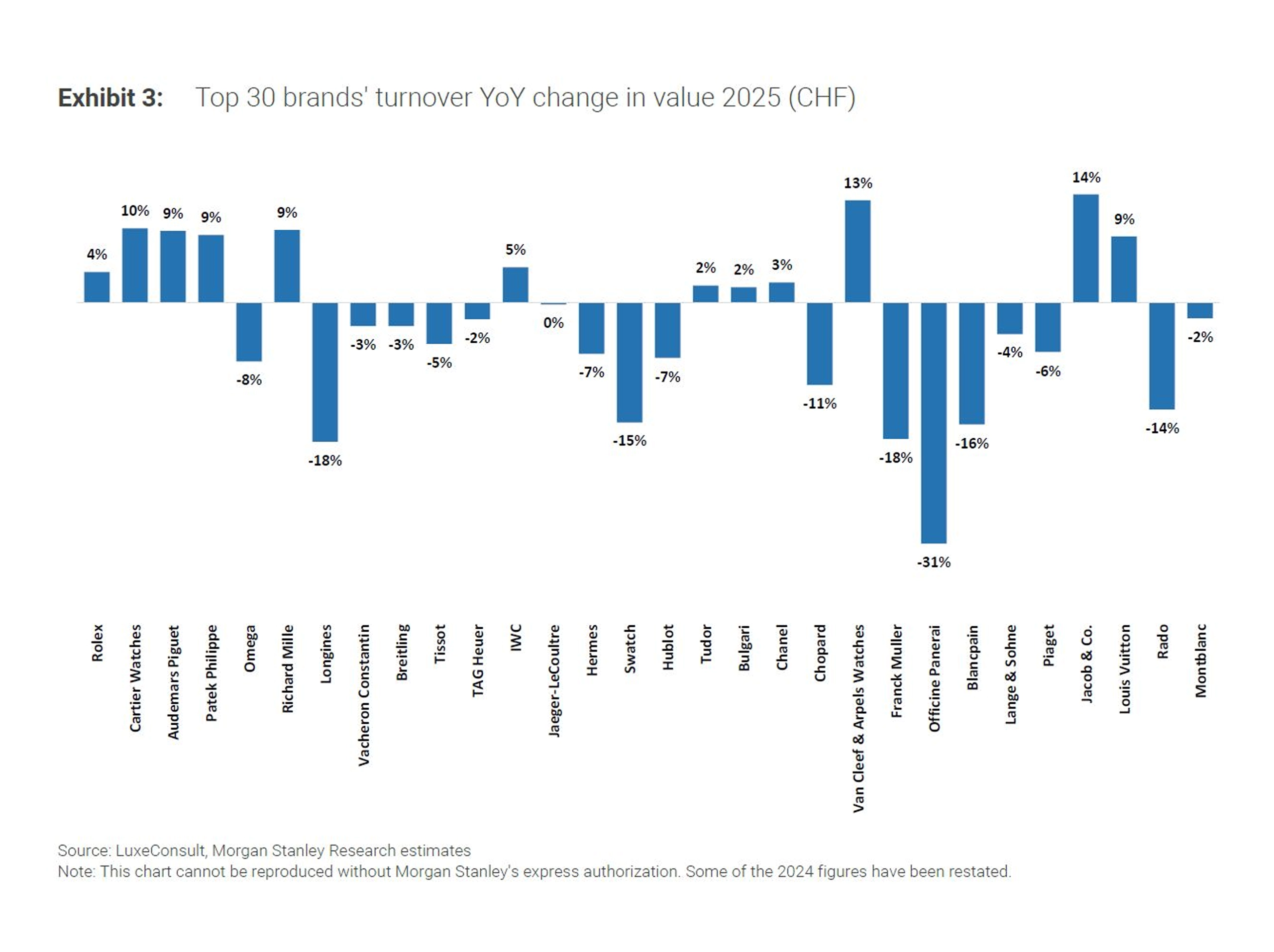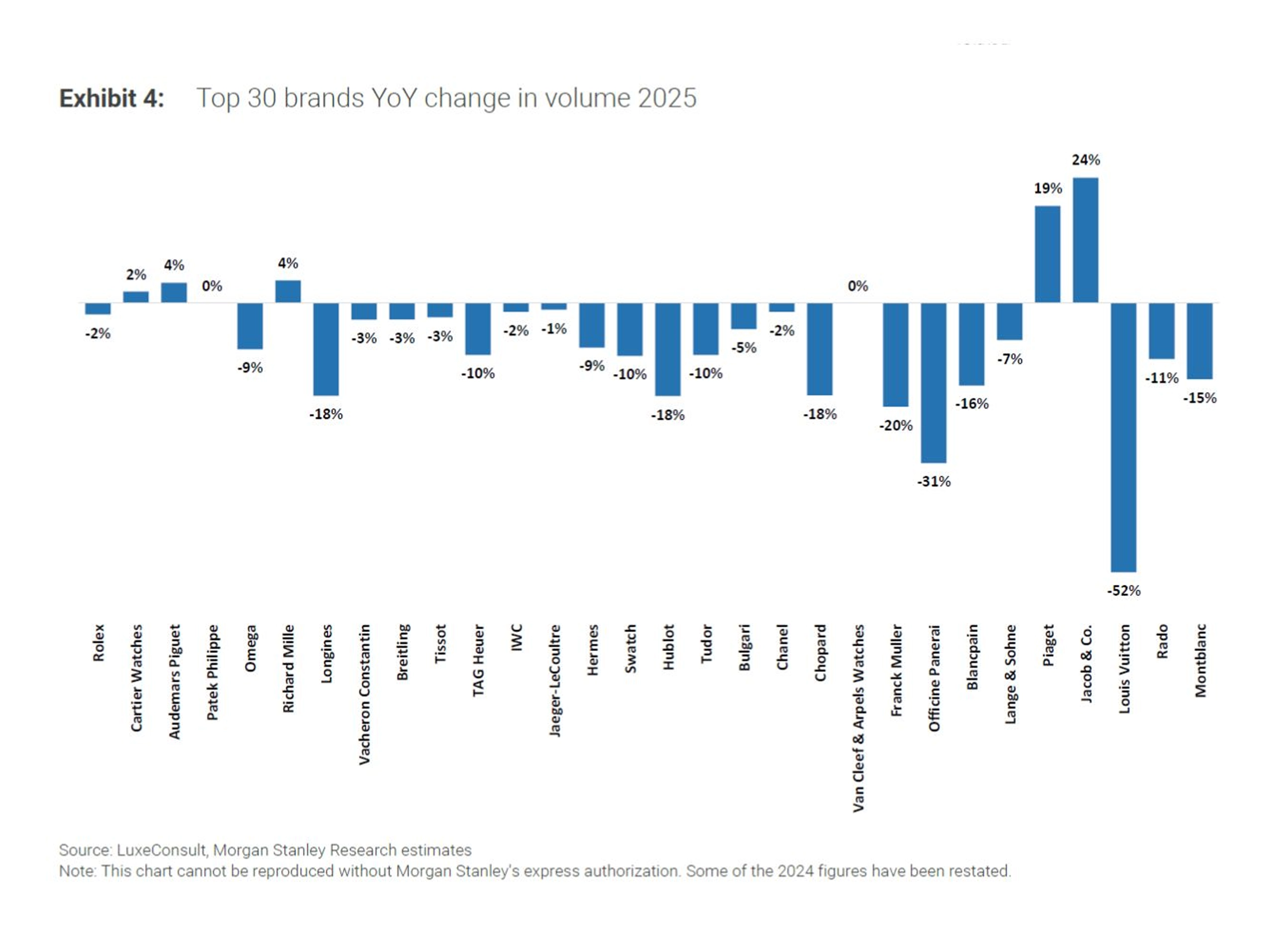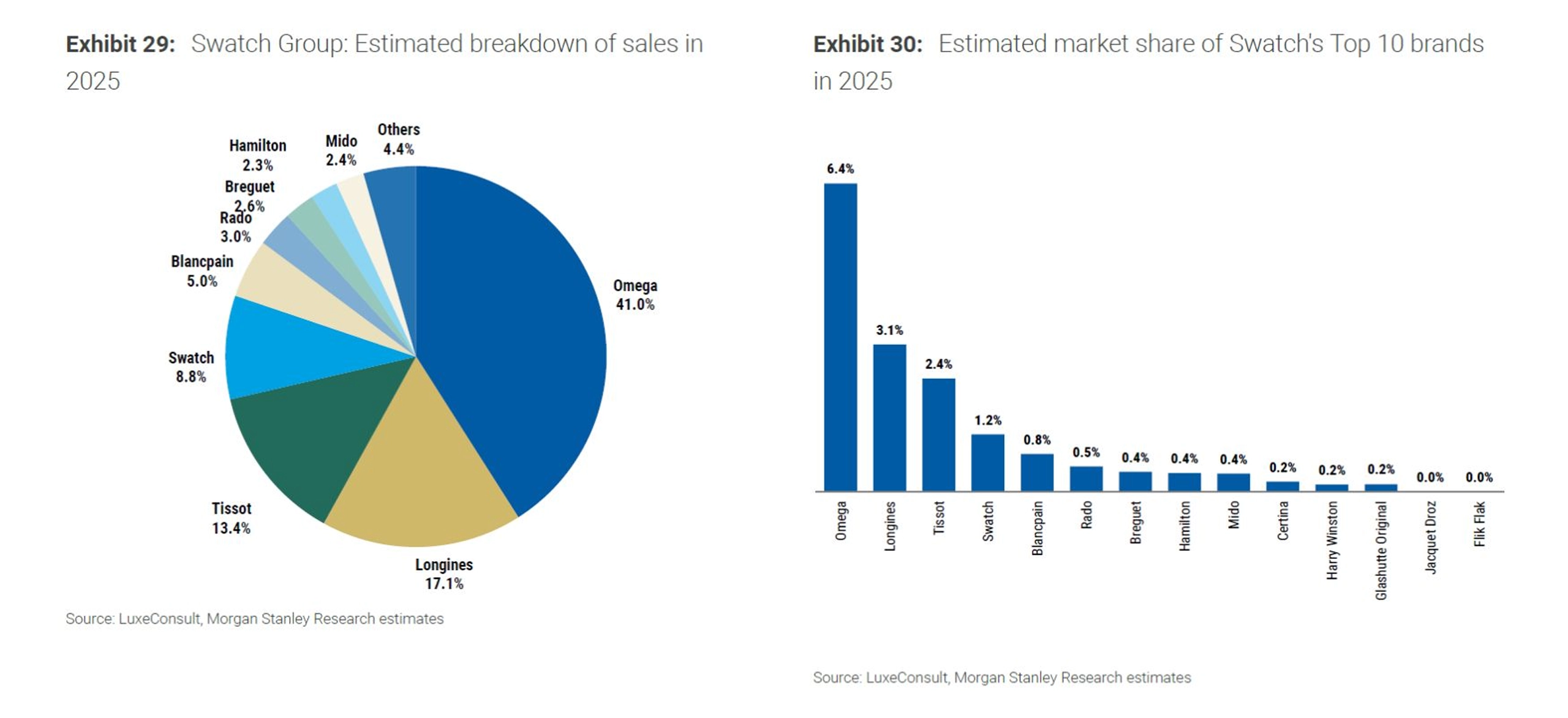글로벌 투자은행 모건 스탠리(Morgan Stanley)와 컨설팅 업체 럭스컨설트(LuxeConsult)가 2025년 스위스 시계 시장에 대한 보고서를 발간했다. 450여개의 스위스 시계 브랜드 중 상위 50개 시계 브랜드의 실적 추정치를 토대로 작성하는 이 연례 보고서는 시계 시장의 현재와 흐름을 파악하는데 어느 정도 도움을 준다. 다만, 대부분의 브랜드가 실적을 공개하지 않기 때문에 100% 정확하지 않다는 것을 유념해야 한다.