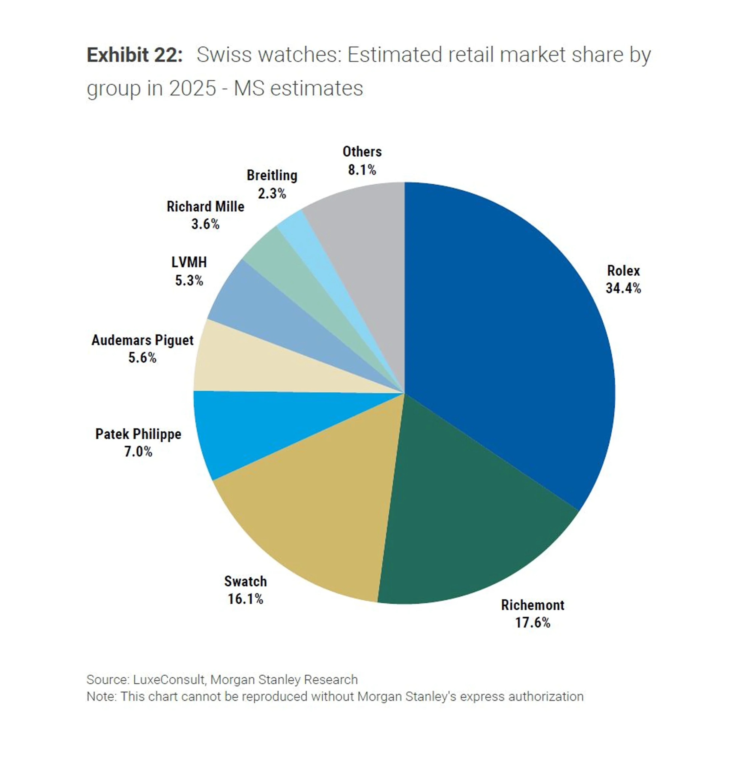 롤렉스, 오데마 피게, 파텍 필립, 리차드 밀 같은 비상장 기업의 영향력이 갈수록 높이지는 반면 상장 기업인 스와치 그룹, 리치몬트 그룹, LVMH는 압박에 시달리고 있다. 중저가 브랜드가 대거 포진한 스와치 그룹은 약 880만개의 시계를 판매하며 전체 판매량의 약 60%를 차지했지만 전체 점유율은 16.1%로 떨어졌다. 그룹 내 상위 5개 브랜드인 오메가, 론진, 티쏘, 스와치, 블랑팡의 매출은 일제히 하락했다. 오메가에 대한 의존도가 높은 스와치 그룹은 오메가의 턴어라운드와 나머지 브랜드의 활약이 어느때보다 절실하다. 리치몬트 그룹은 까르띠에가 아이코닉 모델에 집중하며 훌륭한 성적을 냈지만 나머지 브랜드는 기대에 미치지 못했다. 리치몬트 그룹 역시 까르띠에에 대한 의존도가 심화되고 있으며, 다른 브랜드의 시장 점유율은 하락하고 있다. LVMH의 시장 점유율은 약 5.3%로 크지 않다. 태그호이어, 위블로, 제니스와 같은 시계 전문 브랜드는 소폭 하락한 반면 불가리, 루이 비통, 디올은 새로운 소비자를 얻기 위한 공격적인 전략을 통해 성장했다.