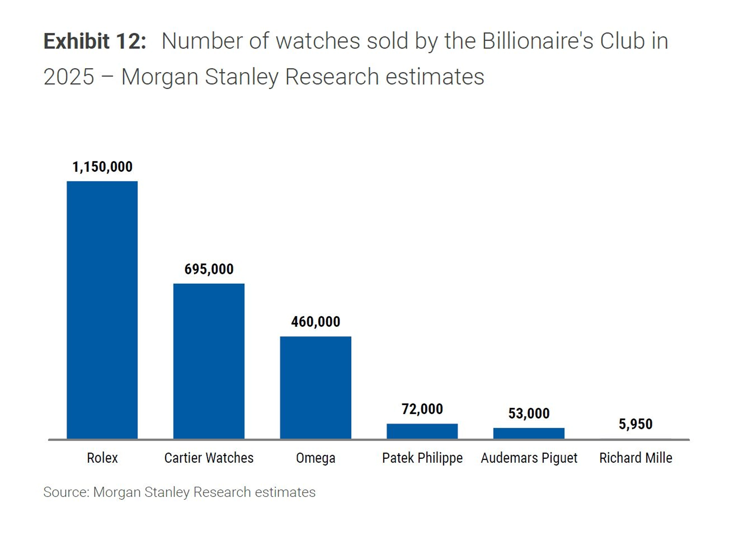모건 스탠리와 럭스컨설트의 보고서를 통해 주목할만한 사실은 시계 산업이 구조적 재편 과정에 들어섰다는 것이다. 보고서에 의하면 2025년 전체 스위스 시계 판매량은 약 1,460만개로 전년 대비 약 74만개 감소했다. 2008년으로 시계열을 늘릴 경우 약 44% 감소했지만(약 2,980만개의 판매고를 기록한 2011년과 비교하면 절반 이하) 수출액은 지속적으로 증가했다. 쿼츠 시계 판매량은 반토막이 난 반면 기계식 시계는 견조한 흐름을 유지했다. 저가 시계의 대부분을 차지하는 쿼츠 시계의 판매 저하는 스마트 워치의 등장, 기계식 시계에 대한 관심과 수요가 높아졌기 때문으로 볼 수 있다. 전체 시계 판매량이 크게 감소했음에도 불구하고 금액이 늘어난 것은 시계 산업이 양적 성장보다 높은 가치를 창출하는 방향으로 변모했음을 뜻한다.