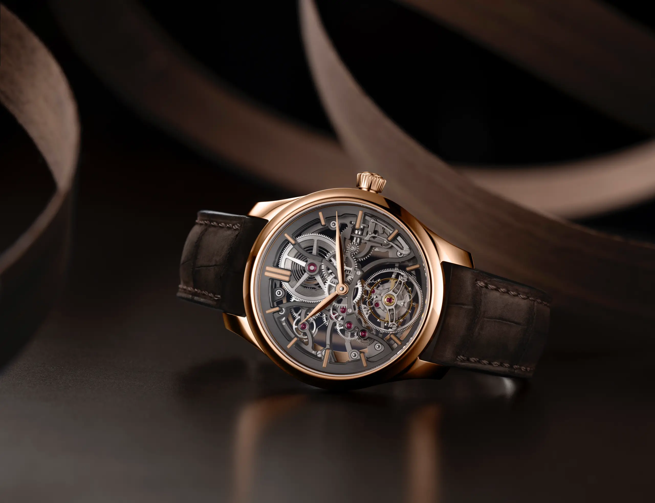 ‘인데버 투르비용 스켈레톤(Endeavour Tourbillon Skeleton)’은 레드 골드 케이스와 조화를 이루는 다크 브라운 앨리게이터 누벅 가죽 스트랩을 매치했다. 또한 이 시계는 리미티드 에디션이 아닌 정규 라인으로 만날 수 있다.