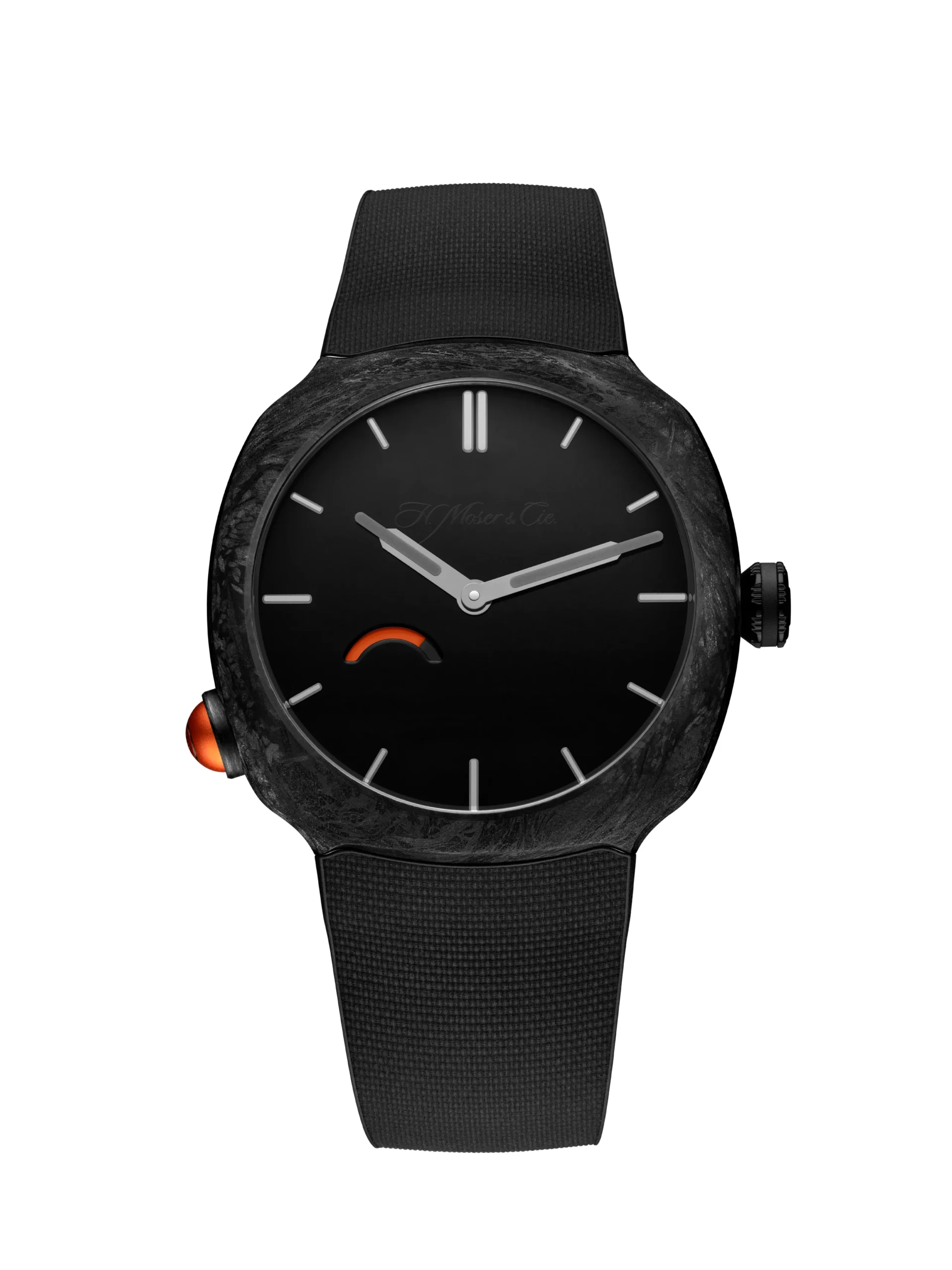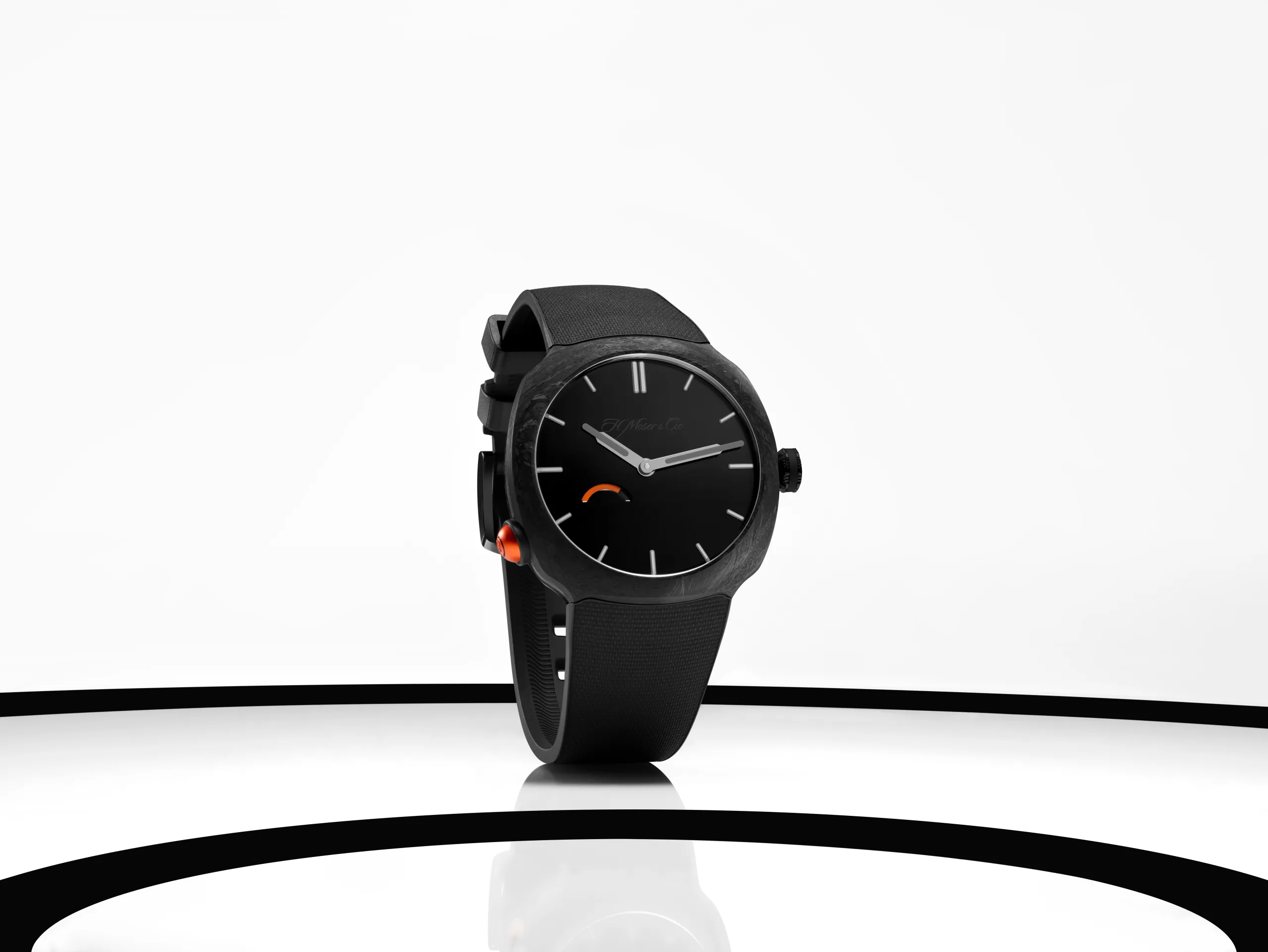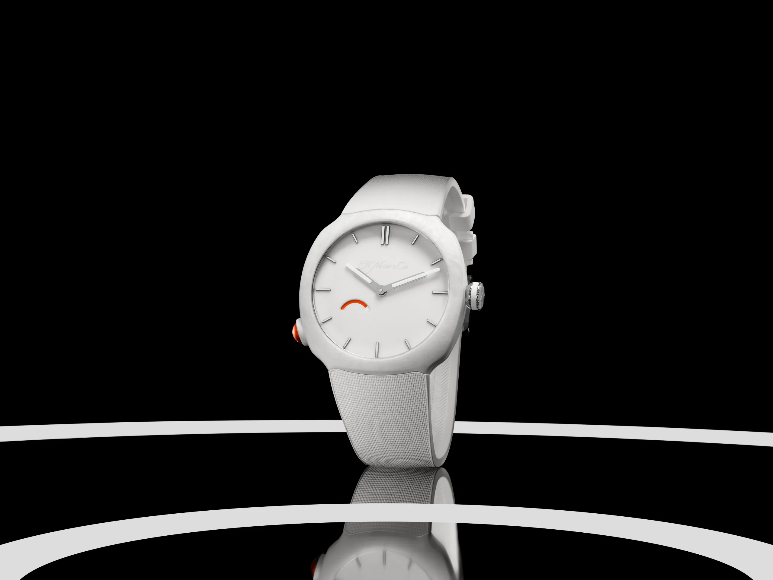 이번 작품은 H. 모저 앤 씨의 실험적 창작 공간인 모저 익스플로레이션 LAB™의 작품이다. 케이스 측면 8시 방향에는 양극산화 처리된 알루미늄 소재의 푸셔가 자리하고 있다. 버튼을 누를 때마다 에너지가 배럴 스프링으로 전달되고, 파워 리저브 인디케이터가 반응한다. 한 번 누를 때마다 1시간 이상의 파워 리저브를 확보할 수 있으며, 태엽이 완전히 감긴 후에도 버튼을 계속 누를 수 있다. 와인딩에 관계 없이 그냥 누르고 싶을 때마다 눌러도 괜찮다는 얘기다.