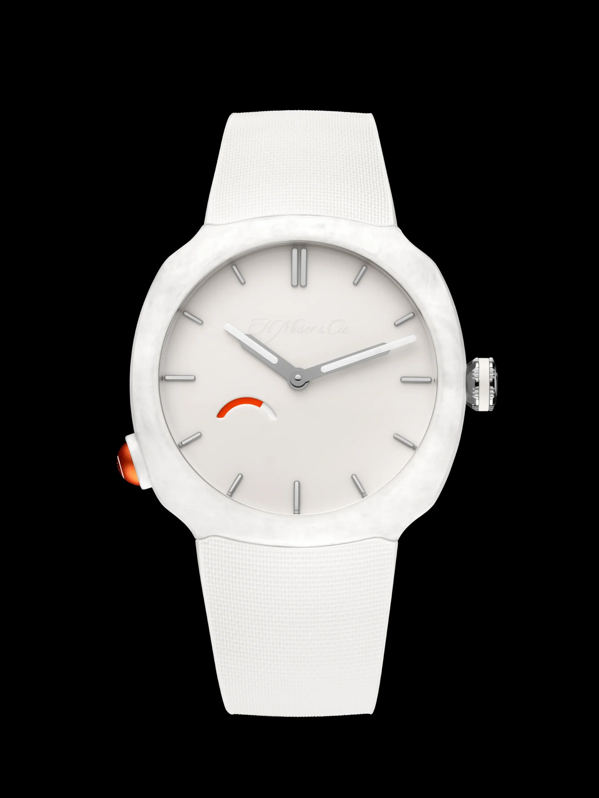 케이스 소재로는 시계업계에서 보기 드문 단조 쿼츠 파이버(forged quartz fibre)가 채택됐다. 유리 섬유보다 순도가 높고 색상 처리가 가능하며 자외선에 강한 이 소재는, 세그먼트로 절단한 뒤 금형에 넣어 압축하고 수지를 주입한 후 두 차례의 경화 공정을 거쳐 완성된다. 이 과정에서 무아레 패턴이 형성되며, 완성된 케이스는 모두 다른 패턴을 갖게 된다.