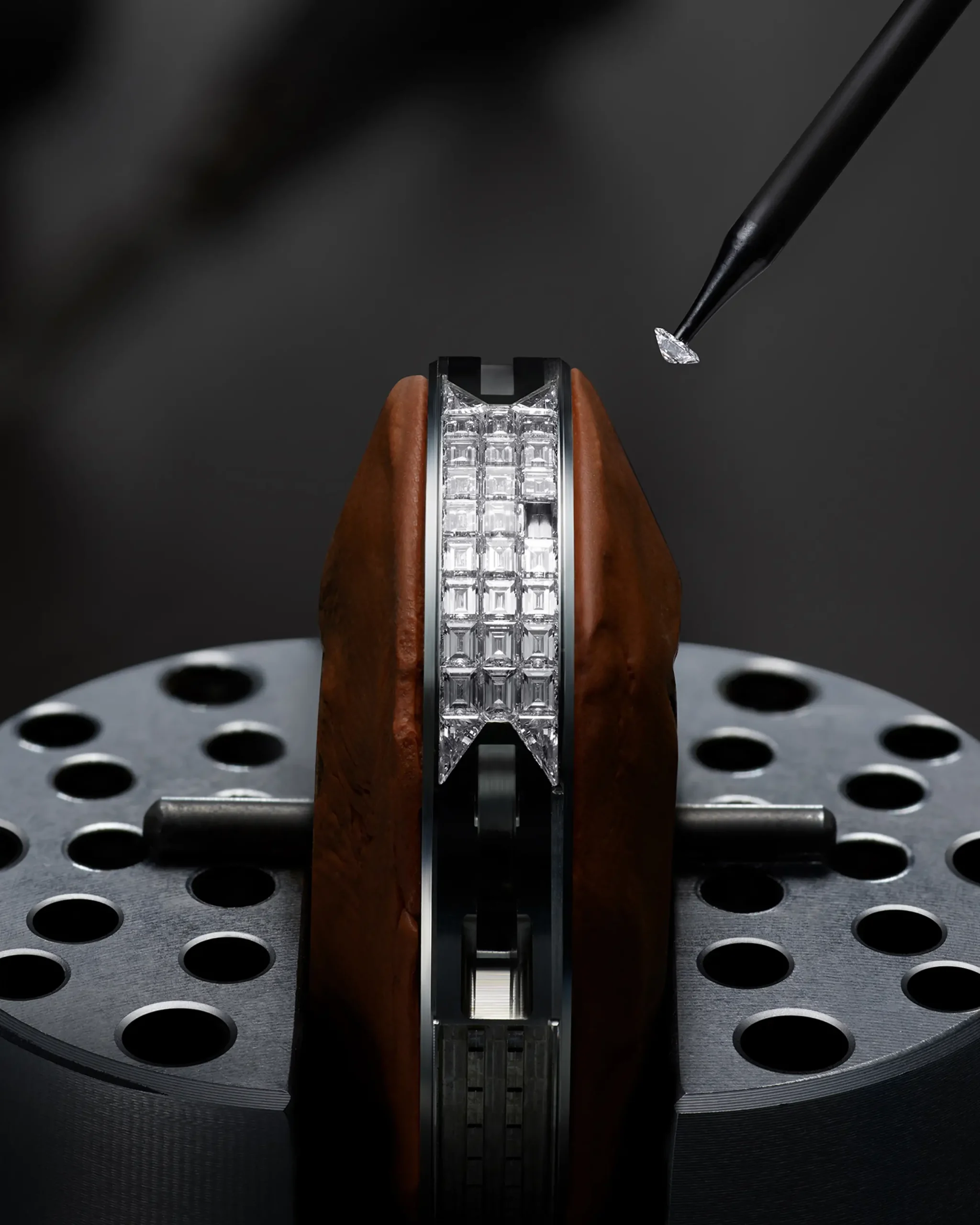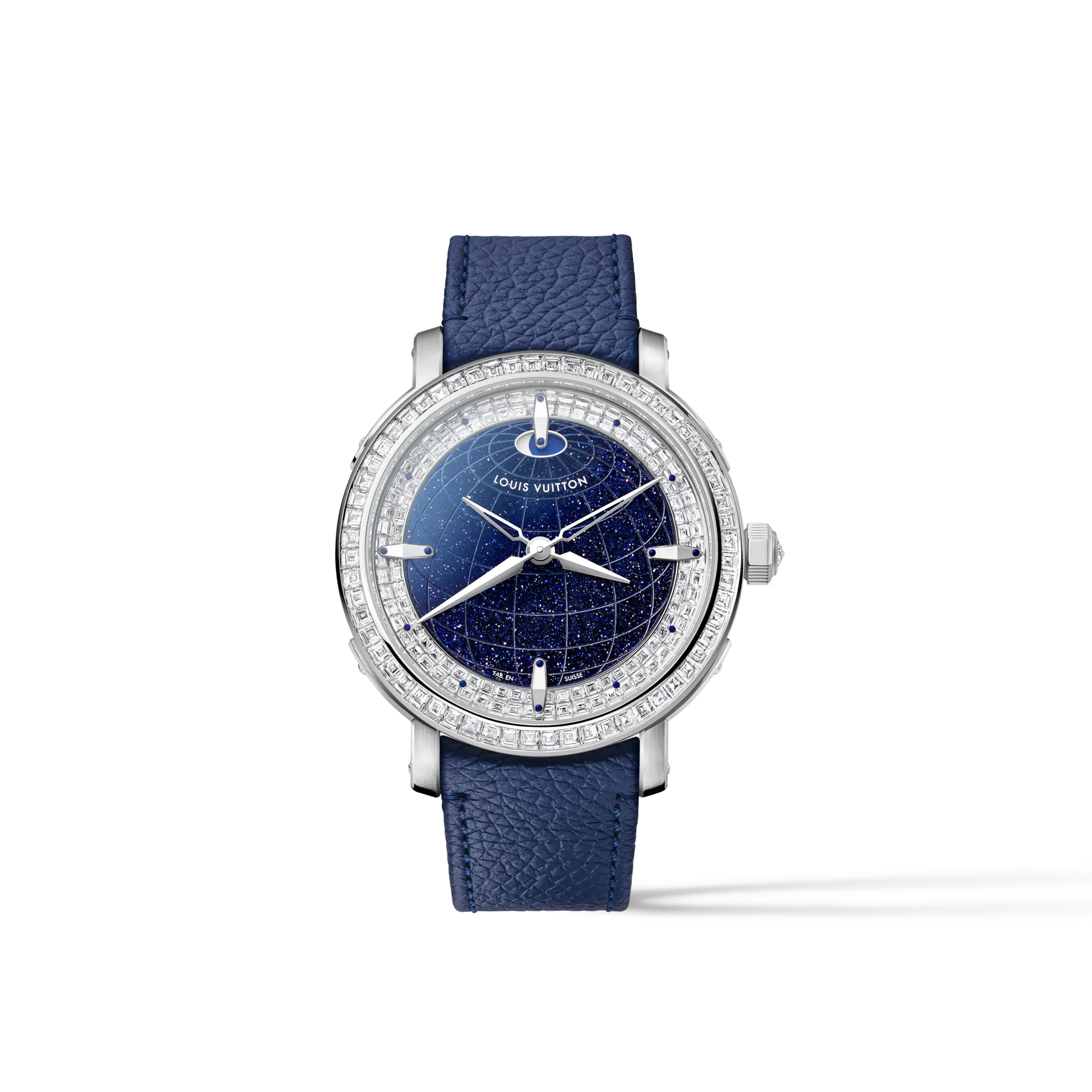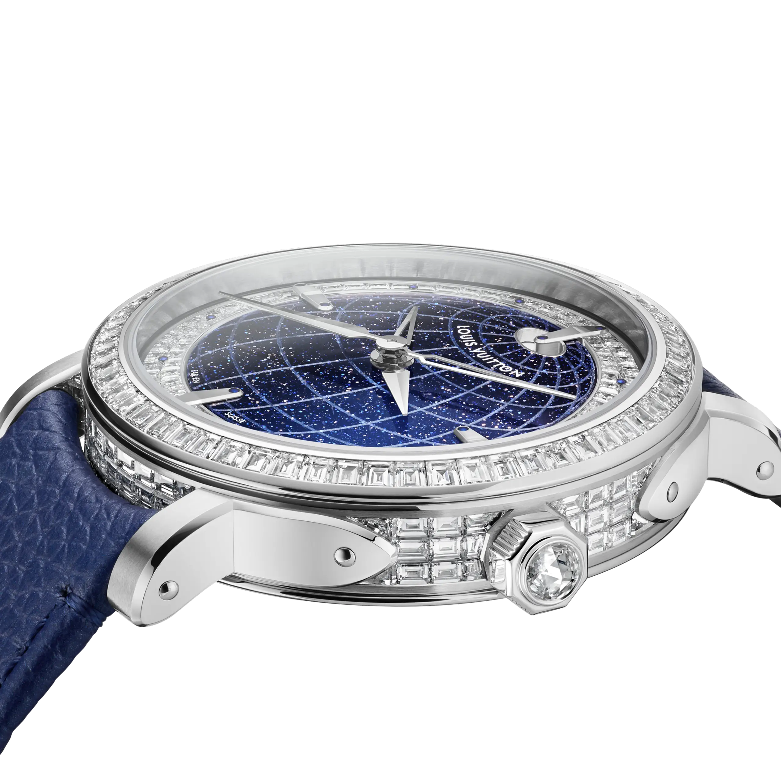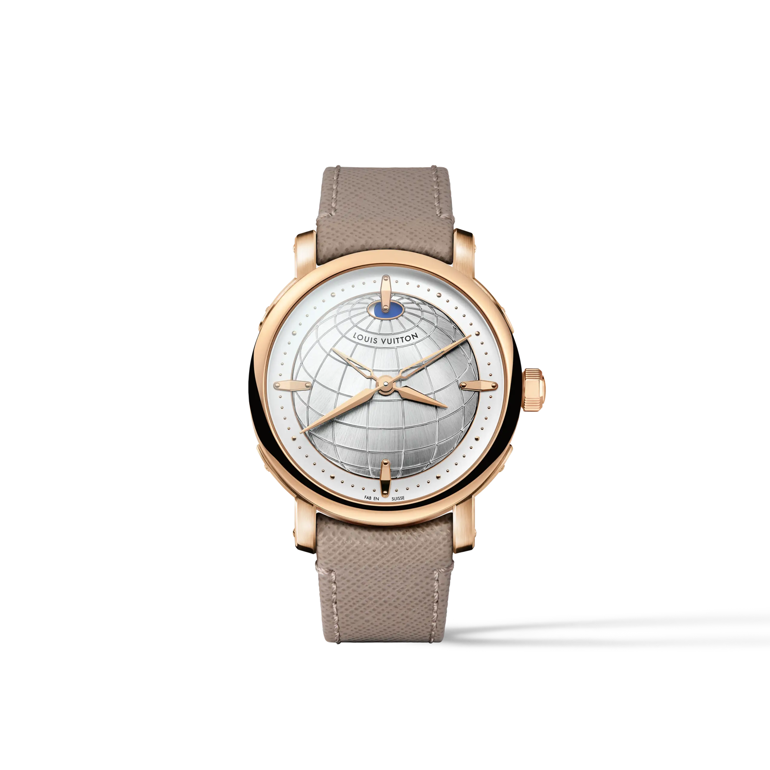 로즈 골드 모델에는 아로요 그레이 사피아노 소가죽 스트랩을, 플래티넘 하이 주얼리 모델에는 파란색 소가죽 스트랩을 매칭했다. 루이 비통의 시그니처를 각인한 폴딩 버클의 소재는 케이스를 따라간다.