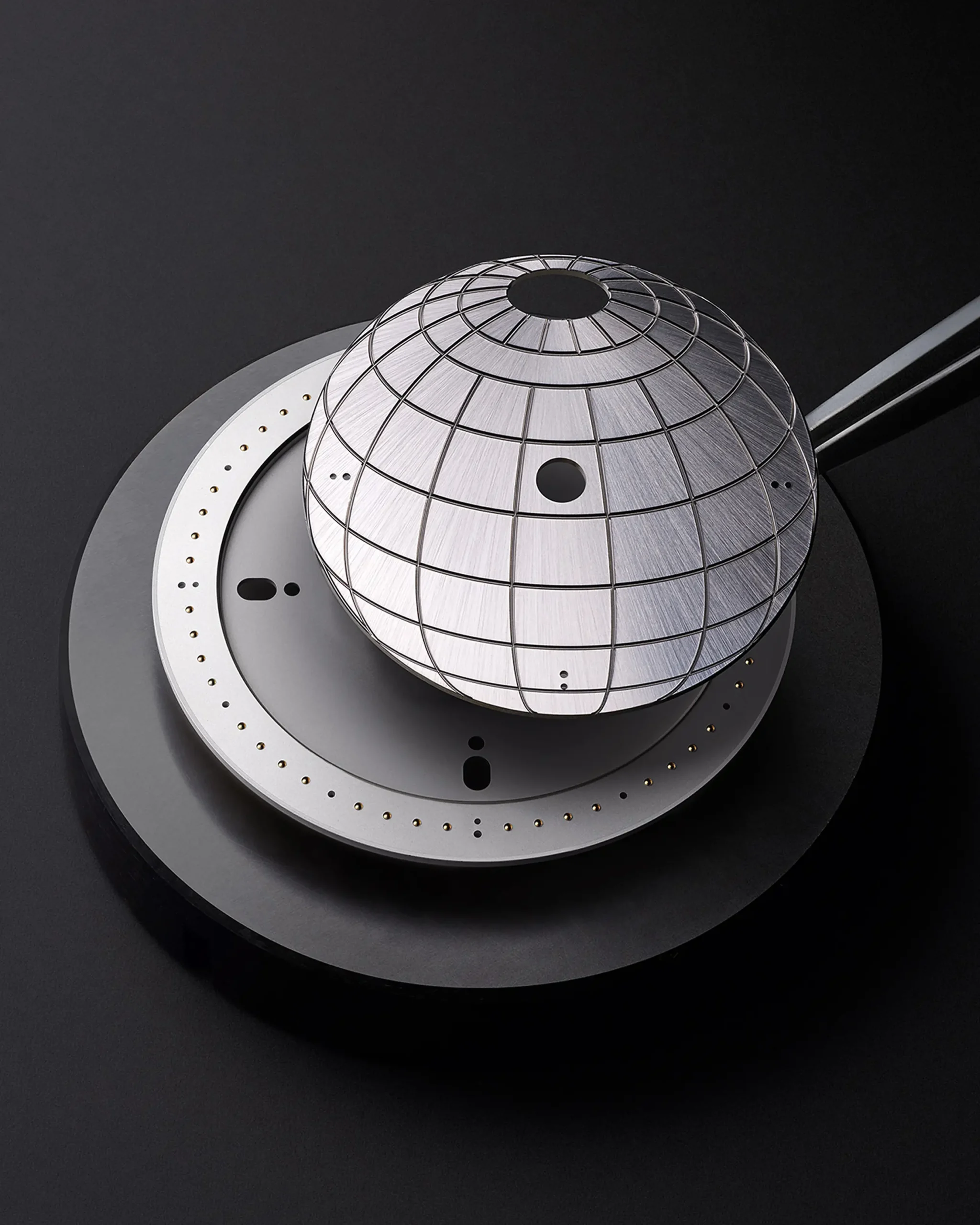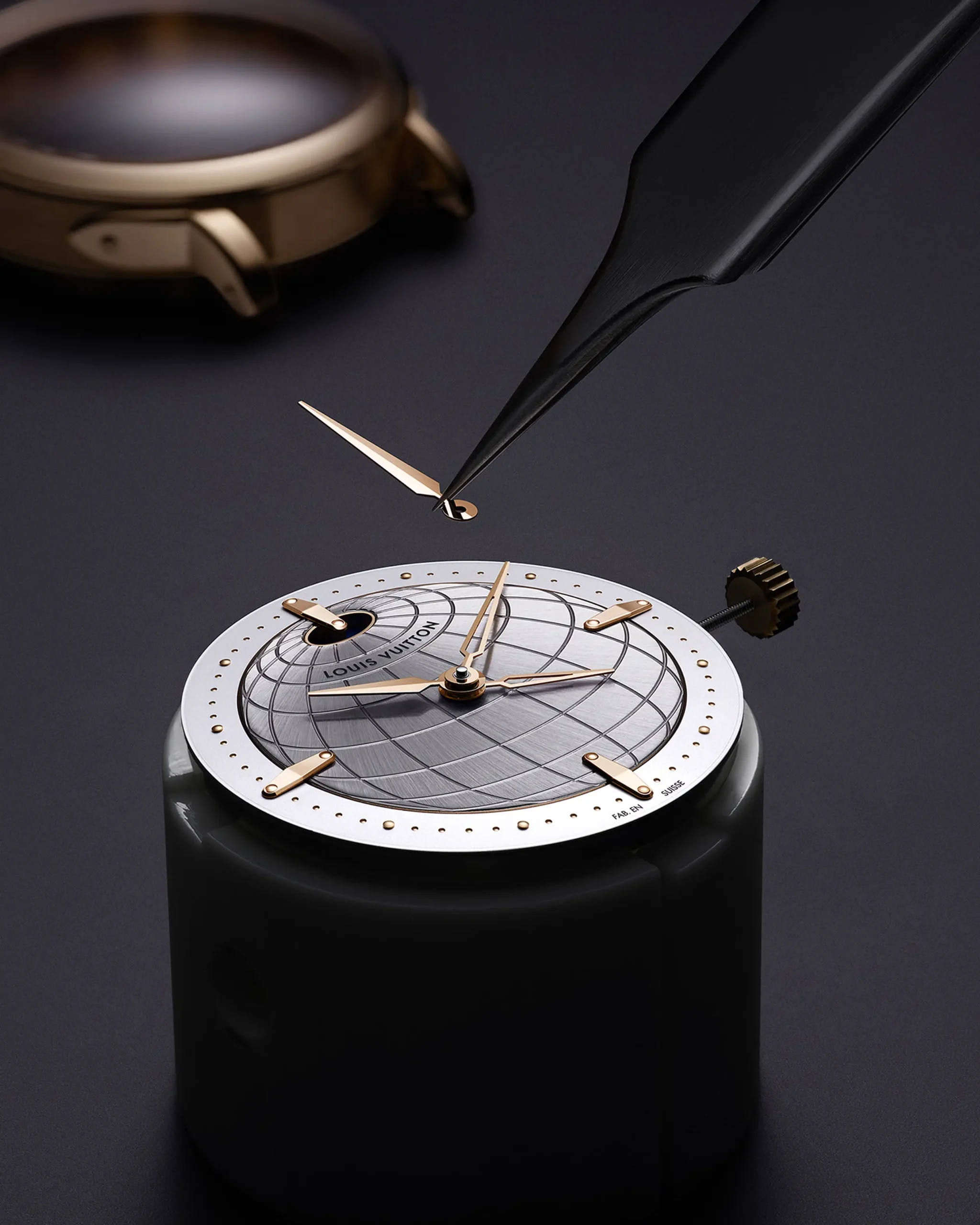에스칼 트윈 존은 하나의 축에 두 쌍의 바늘을 장착했다. 보통 두 번째 시간대를 가리키는 시침을 추가로 설치하는 GMT 또는 듀얼 타임 시계와는 다르다. 에스칼 트윈 존은 여기서 한 발 더 나아가 독립적으로 조작할 수 있는 분침을 추가했다. 이로써 30분 및 45분 단위 시차를 지닌 지역을 비롯한 모든 타임존에 분 단위까지 대응할 수 있다. 날카로운 창을 연상시키는 바늘은 현지 시간을, 스켈레톤 처리한 바늘은 홈 타임을 알려준다. 만약 여행을 떠나지 않았다면 스켈레톤 핸즈를 현지 시간용 바늘 아래로 숨길 수 있다. 이렇게 하면 가독성이 좋아지고 디자인이 차분해지는 효과를 얻을 수 있다. 위도와 경도를 새긴 지구본 상단의 낮/밤 인디케이터는 홈 타임과 연동되어 있다. 사용자는 자신이 원래 머무는 곳이 낮인지 밤인지를 한 눈에 확인할 수 있다. 선버스트 피니싱한 실버 톤의 지구본은 여행에 관한 루이 비통의 유산을 담고 있다.