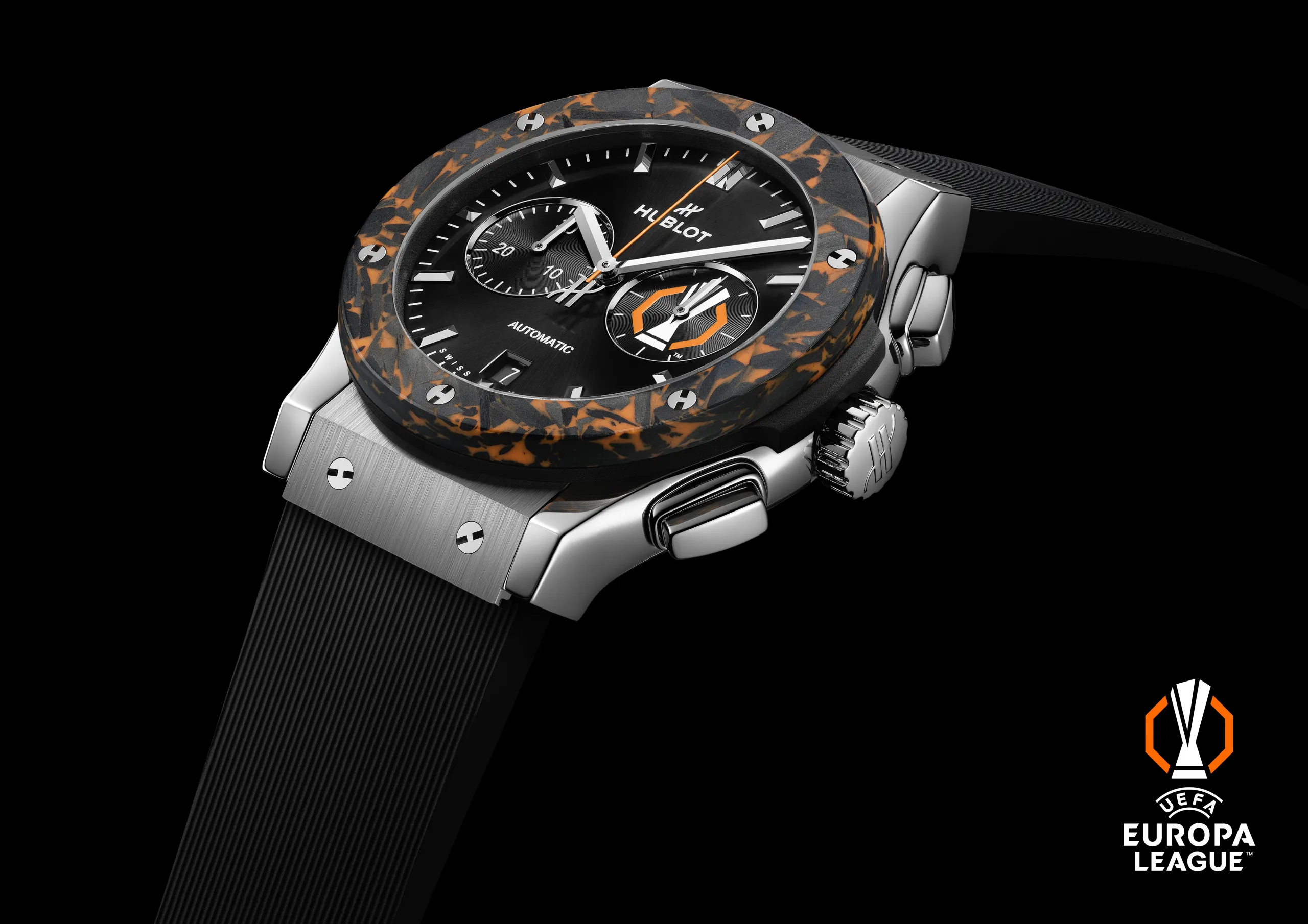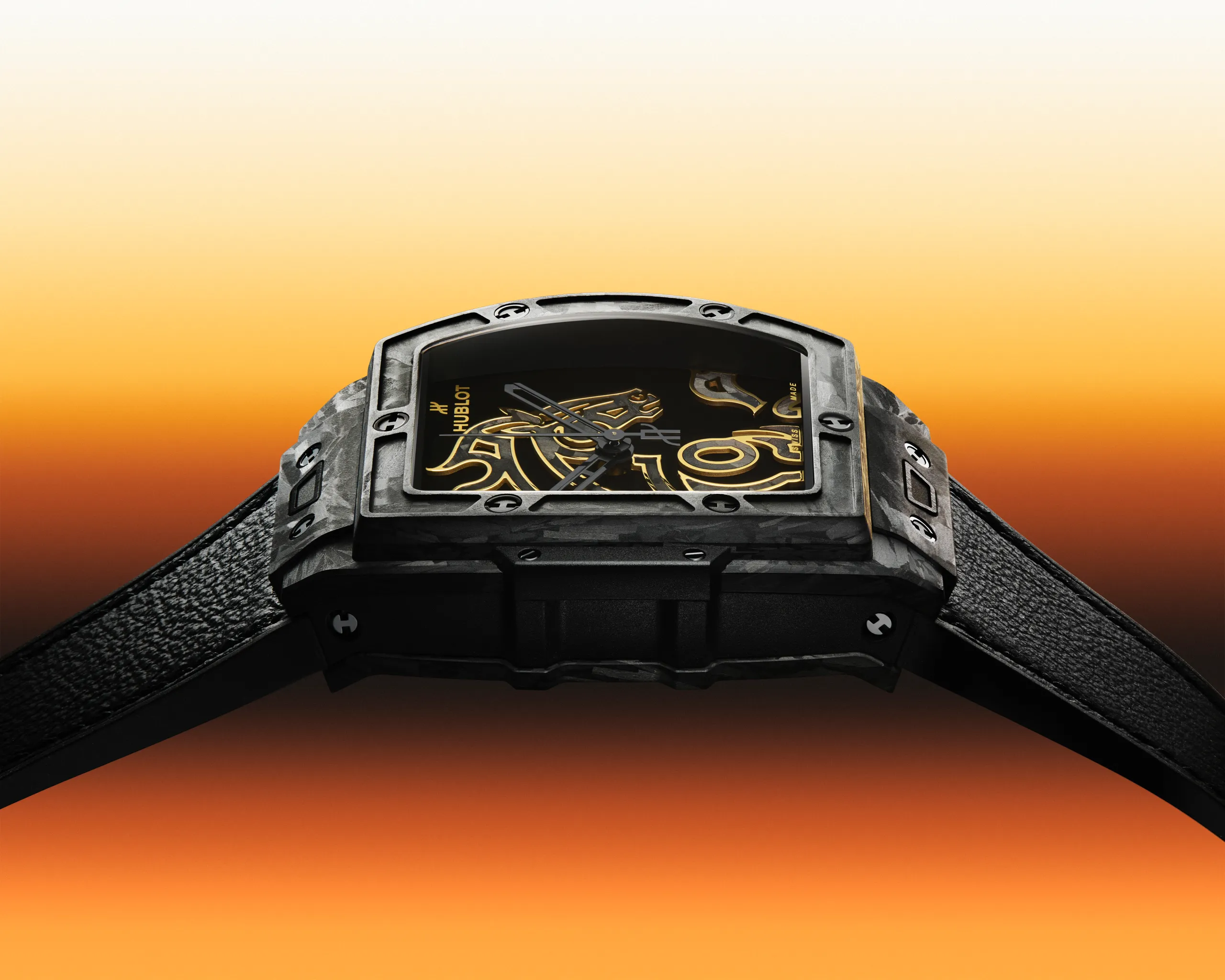 일단 다이얼에 한 마리의 말이 예술 작품처럼 표현되어 있다. 위블로는 이 시계에서 새로운 방식으로 카본을 다뤘다. 수작업으로 잘라낸 카본 조각을 하나하나 쌓아 올려 마케트리를 완성하고, 여기에 3N 골드 도금 브라스 아플리케로 제작한 말 모티프를 결합한 것. 케이스에 주로 사용하는 카본을 예술적 표현을 위한 재료로 활용한 것으로, 이는 위블로의 슬로건인 ‘The Art of Fusion’을 직관적으로 드러낸다.