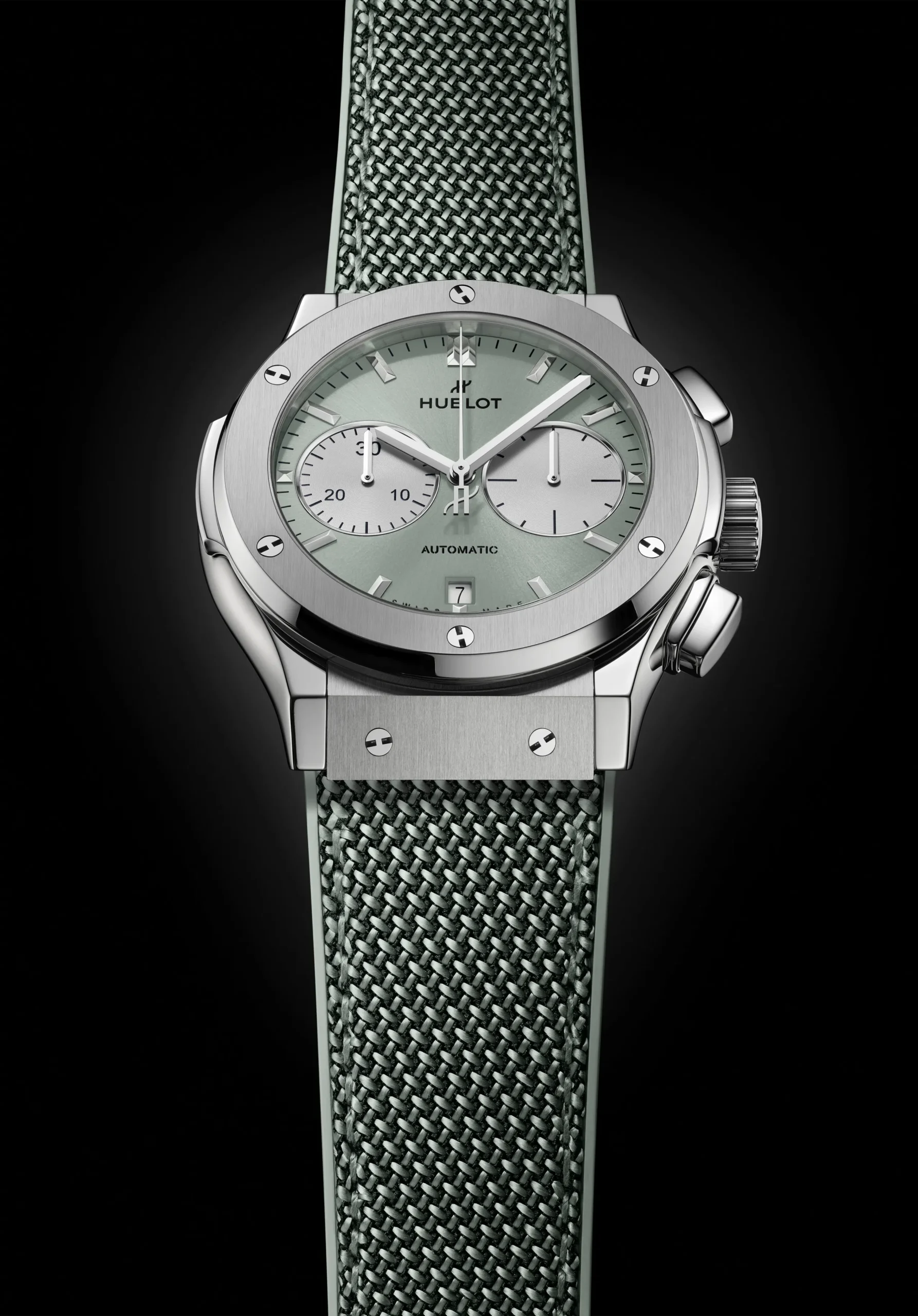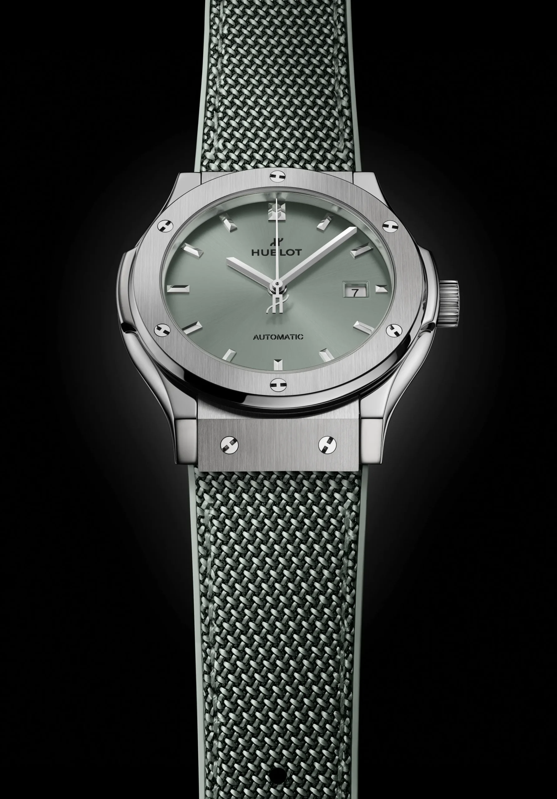 다음으로 42mm 모델은 중앙의 시·분·초 핸즈와 3시 방향 날짜 창만을 배치한 미니멀한 구성으로 세이지 그린 컬러 자체에 집중할 수 있도록 구성했다. 내부에는 오토매틱 칼리버 HUB1110을 탑재해 약 48시간의 파워리저브를 제공한다. 42mm 모델은 남녀 모두를 위한 유니섹스 모델로 출시되었다. 다만 정규 컬렉션의 38mm 사이즈가 함께 출시되지 않은 것은 팔목이 부실한 한국인 입장에서 조금 아쉬운 부분.