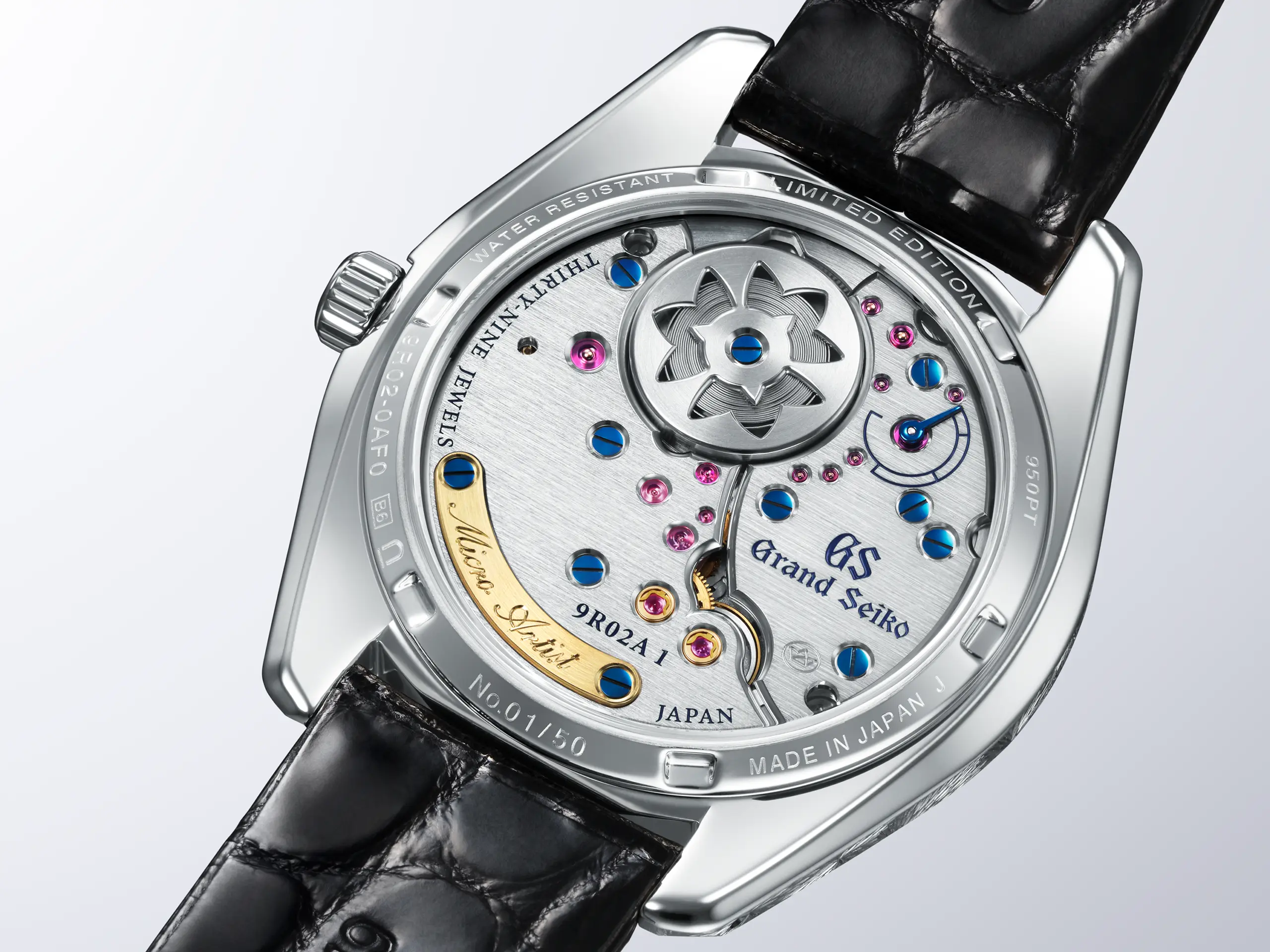 마이크로 아티스트 스튜디오에서 완성되는 스프링 드라이브 칼리버 9R02는 두께가 4mm로 그랜드 세이코에서 가장 얇은 스프링 드라이브 무브먼트라는 타이틀을 갖고 있다. 하나의 배럴 안에 2개의 메인 스프링을 병렬로 설치한 듀얼 스프링 배럴과 토크 리턴 시스템을 이용해 84시간이라는 긴 파워리저브를 구현한다. 토크 리턴 시스템은 메인 스프링이 완전히 감겼을 때 시계의 정확성에 영향을 끼치지 않는 30% 정도의 에너지를 메인 스프링을 감는데 활용하여 파워리저브를 늘리는 기술이다. 파란색 나사와 붉은색 루비 주얼이 어우러진 브리지는 결을 살려 마무리했다. 모서리는 손으로 폴리시드 처리해 브리지 표면과 대비를 이룬다. 배럴은 나가노현 시오리지시의 상징인 종 모양의 초롱꽃을 모티프로 삼아 가공했다. 무브먼트 하단에는 마이크로 아티스트 문구를 새긴 골드 명판을 부착했는데 구매자의 요청에 따라 문구를 수정할 수도 있다. 허용 오차는 월에 ±15초, 일로 변환하면 ±1초에 그친다.