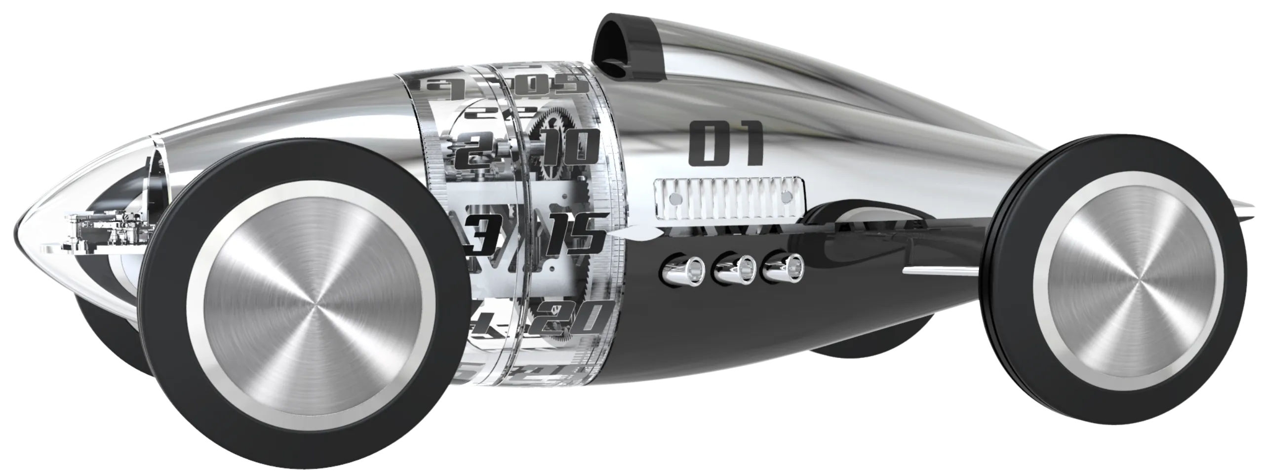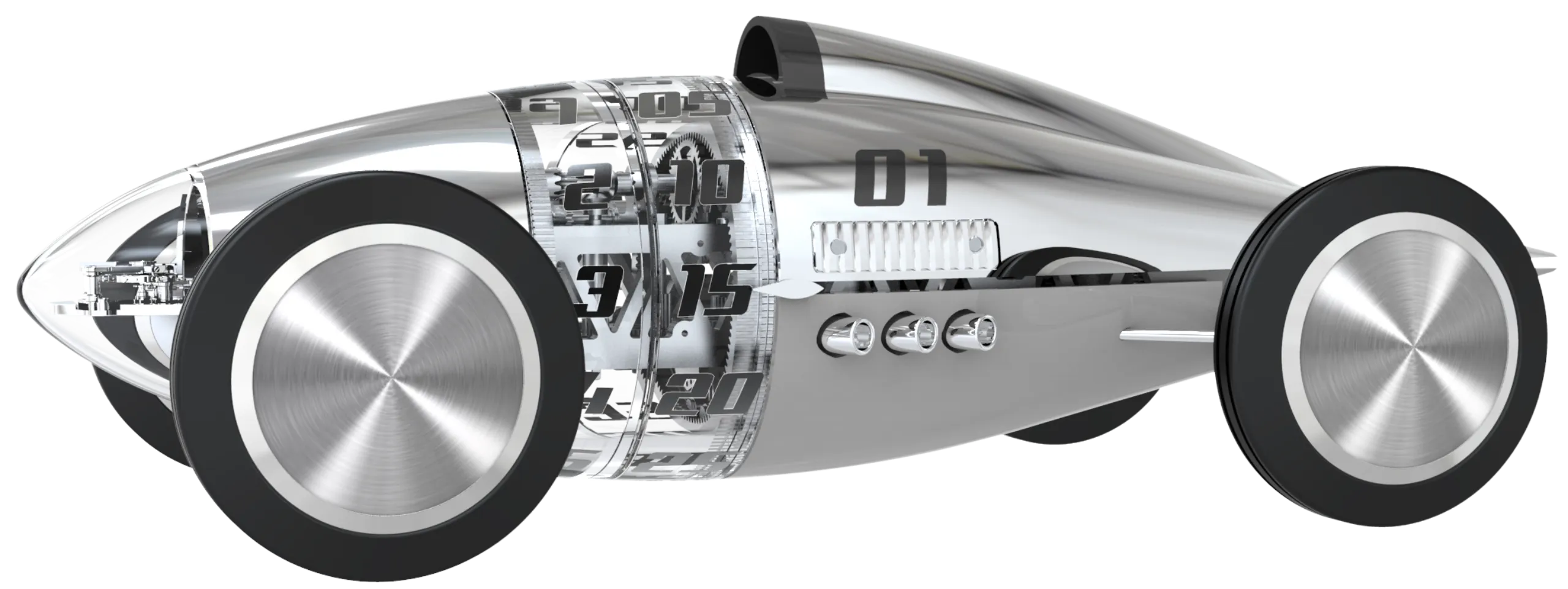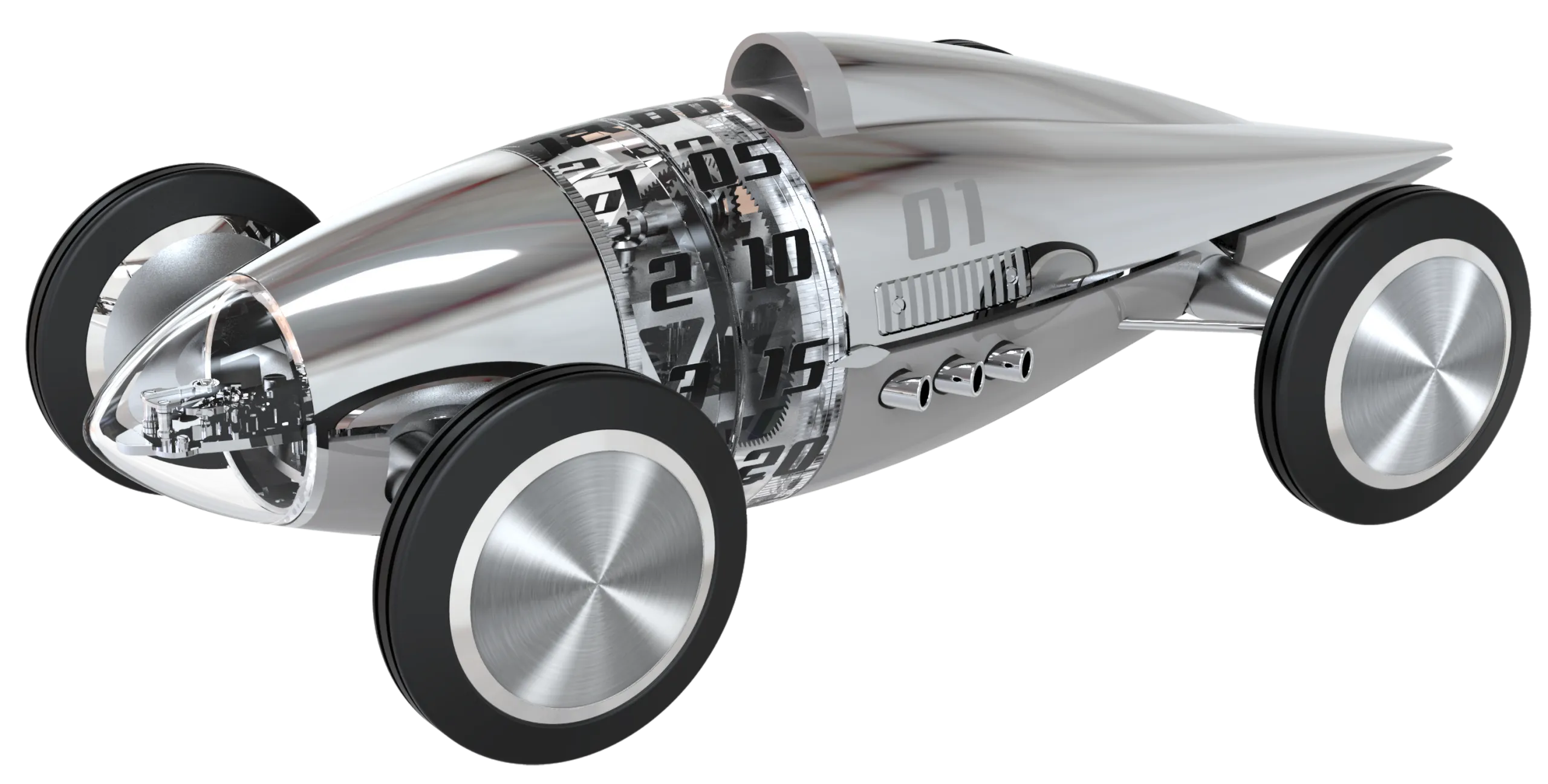 차체 전면 노즈 부분에는 이스케이프먼트가 자리한다. 역동적으로 움직이는 이곳은 실제 벨리 탱크 레이서에서 기류가 가장 먼저 부딪히는 지점이기도 하다. 측면에는 조각된 V6 엔진이 드라이버 포지션 옆에 배치되어 있다. 실제 스트림라이너에서 운전자가 낮게 누워 기계와 하나가 되었던 것처럼, 고속 주행에서 안정성과 무게 균형을 고려한 배치다.