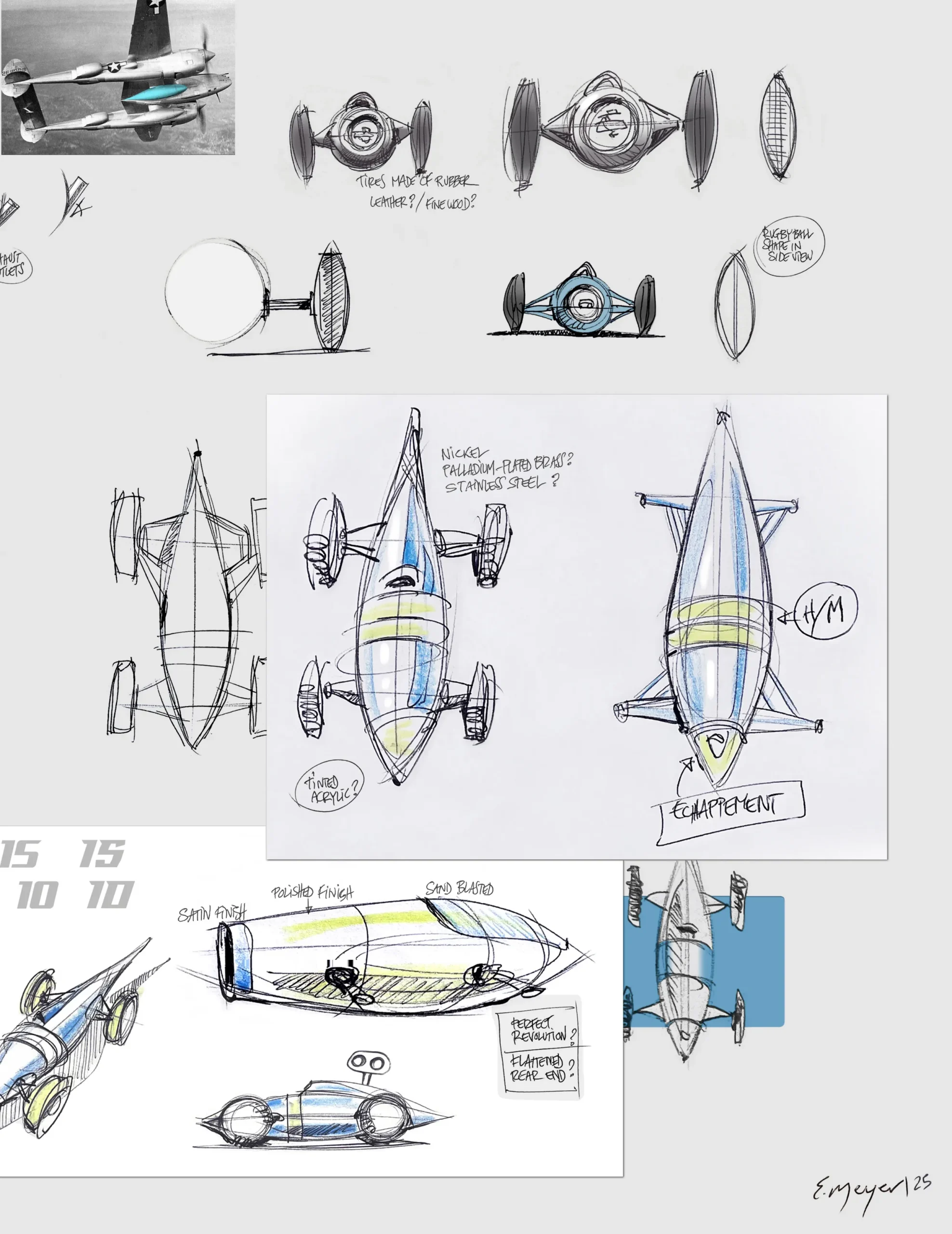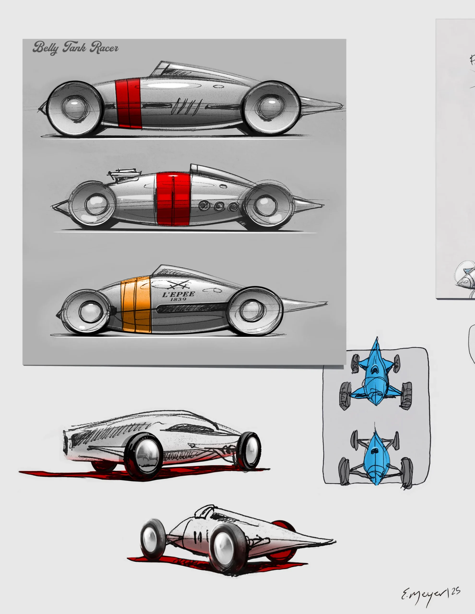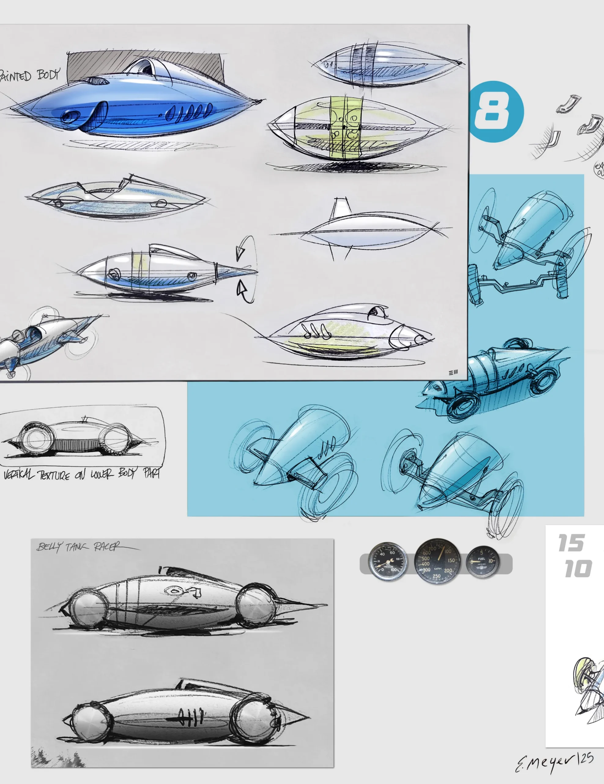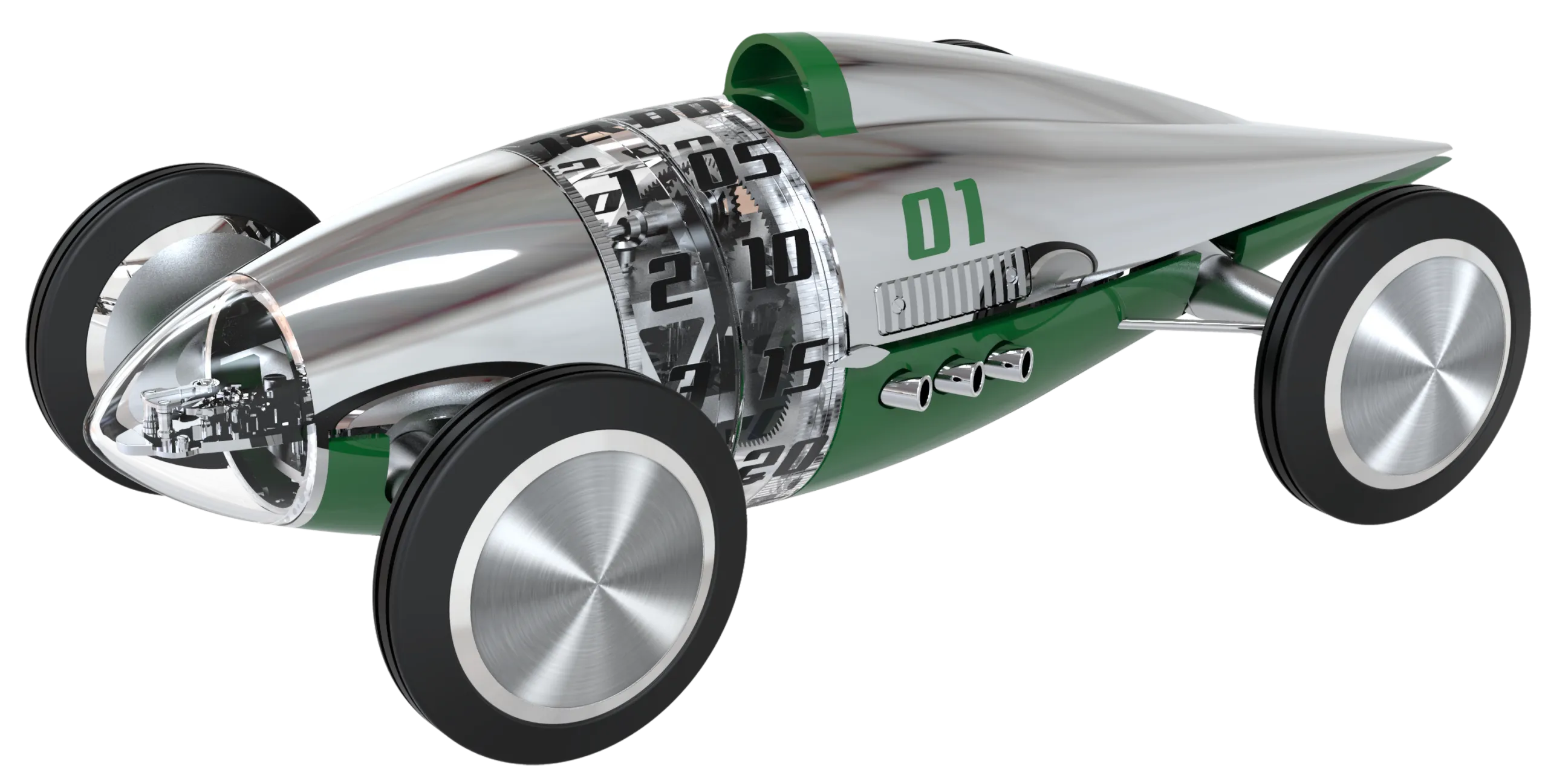 차체 전면 노즈 부분에는 이스케이프먼트가 자리한다. 역동적으로 움직이는 이곳은 실제 벨리 탱크 레이서에서 기류가 가장 먼저 부딪히는 지점이기도 하다. 측면에는 조각된 V6 엔진이 드라이버 포지션 옆에 배치되어 있다. 실제 스트림라이너에서 운전자가 낮게 누워 기계와 하나가 되었던 것처럼, 고속 주행에서 안정성과 무게 균형을 고려한 배치다.