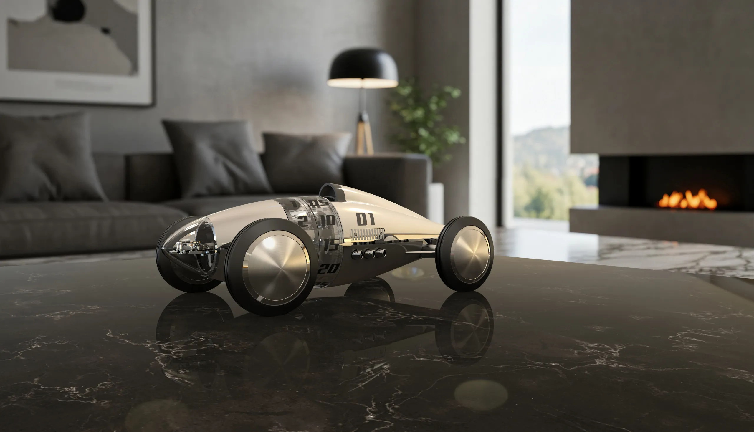 레이서들은 플라잉 마일, 즉 1마일 구간에서의 최고 속도를 겨뤘다. 경기에서 요구되는 것은 공기역학적 효율, 기계적 신뢰성, 그리고 흔들리지 않는 집중력뿐이었다. 엔진, 바퀴, 조향 장치, 유선형 외피로만 이루어진 벨리 탱크 레이서는 불필요한 모든 것을 제거한 퍼포먼스의 집약체였으며, 낙관주의와 재창조의 정신을 담고 있었다. 레페 1839의 벨리 탱크 레이서는 바로 이러한 이야기를 탁상시계에 담아냈다.