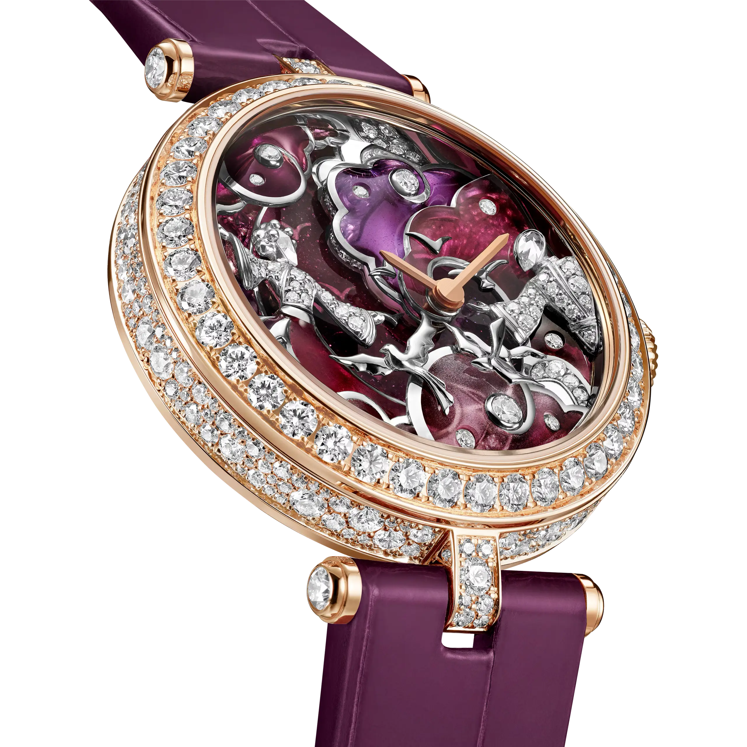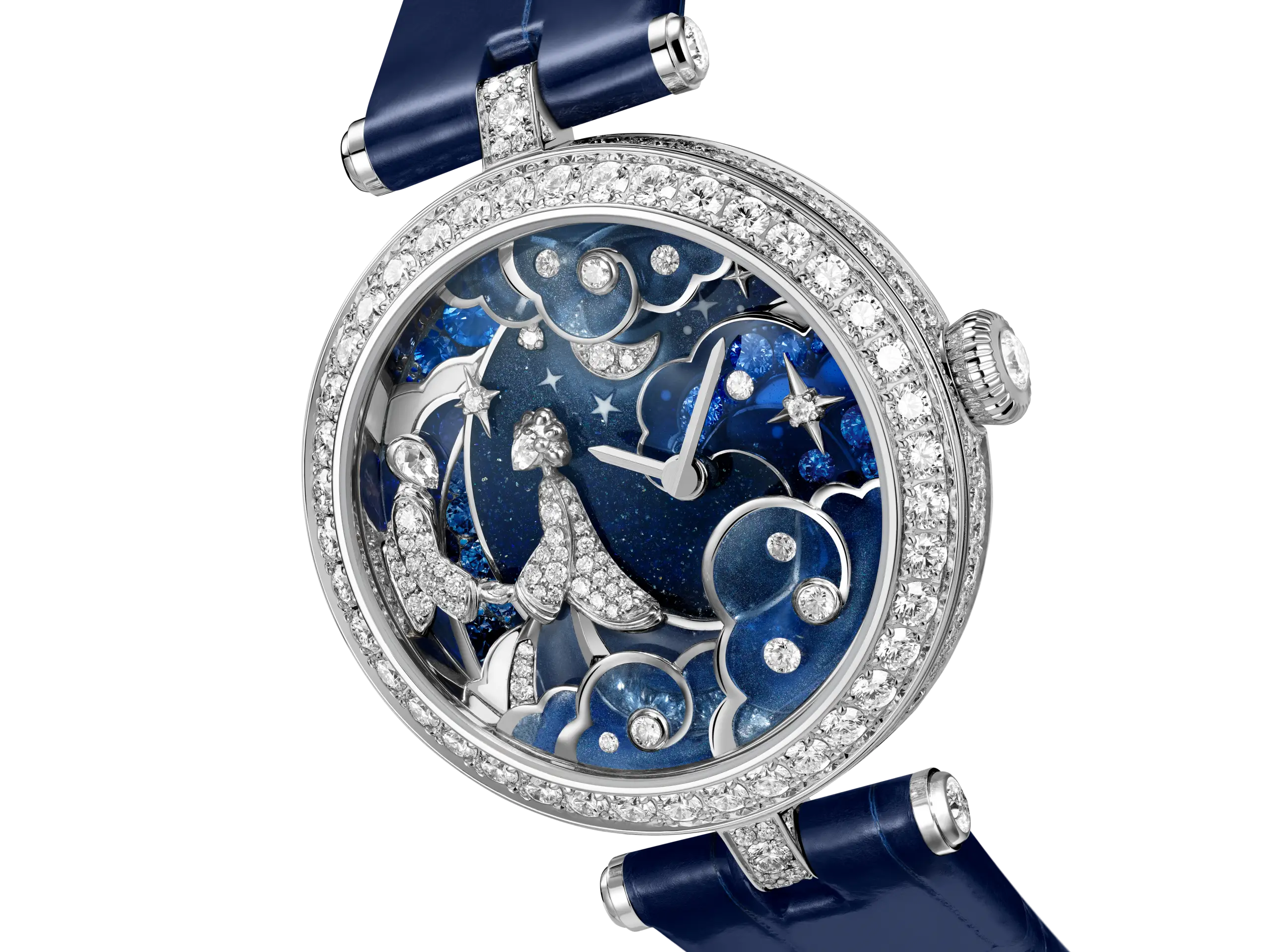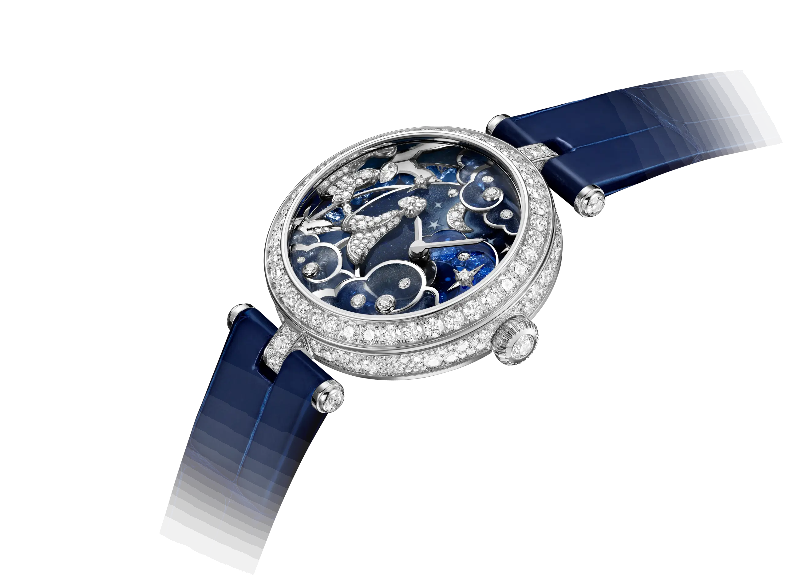 핑크빛 ‘레이디 르투르바이 셀레스트’는 두 사람이 팔을 뻗은 채 서로를 향해 다가가는 순간을 포착했다. 두 사람 사이에는 화이트 골드로 완성한 새들이 날아오르고, 뒤편에는 핑크와 퍼플, 모브 컬러가 어우러진 구름 배경이 펼쳐진다. 이 모델 역시 별도의 금속 구조 없이 플리크-아-주르 에나멜 위에 다이아몬드를 세팅했는데, 이는 반클리프 아펠이 약 2년에 걸친 연구 및 개발을 통해 완성한 특허 기술이다. 블루 모델은 화이트 골드, 핑크 모델은 로즈 골드 케이스로 선보이며, 두 버전 모두 미니멀한 핸즈로 시와 분을 표시한다.