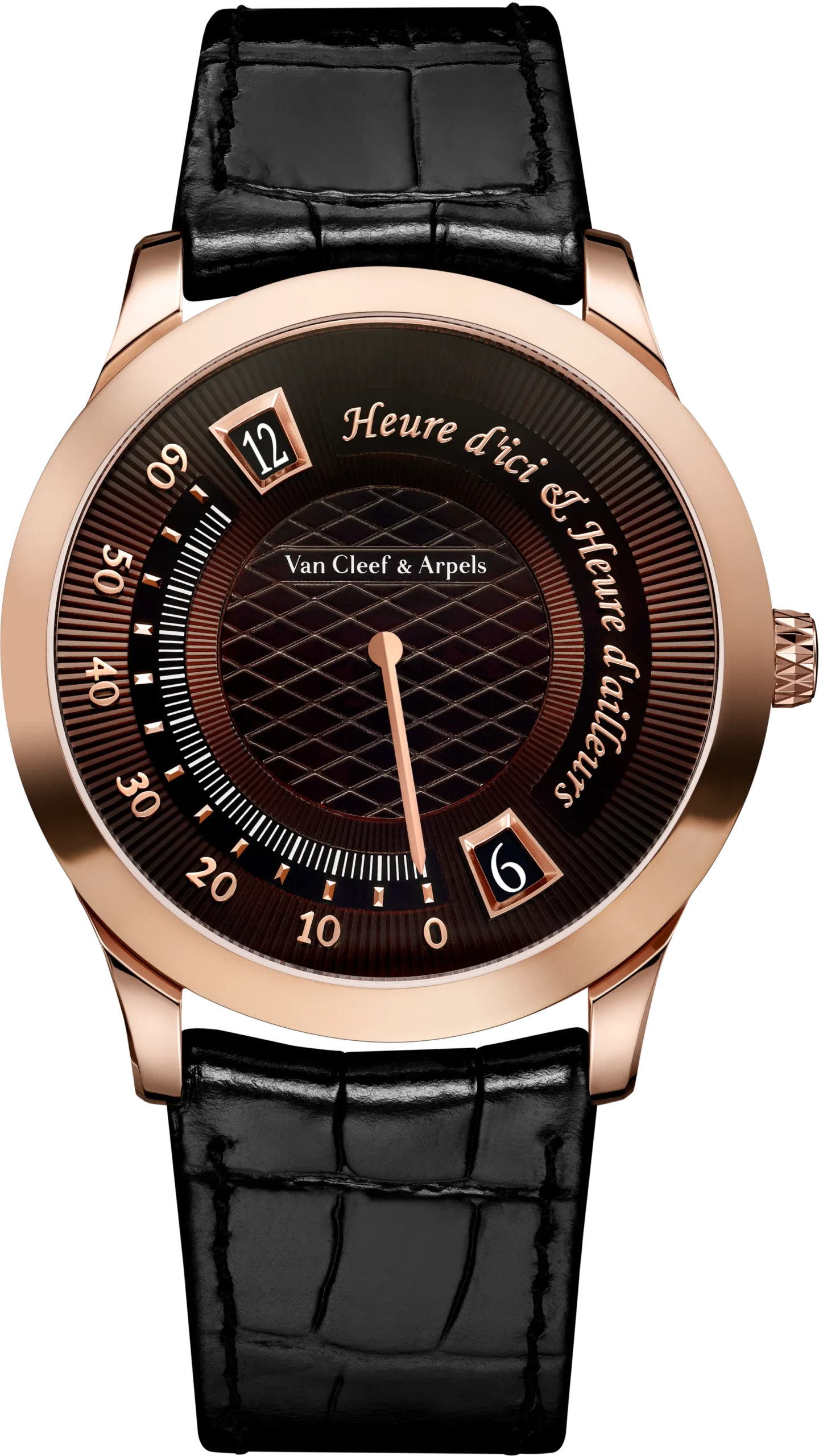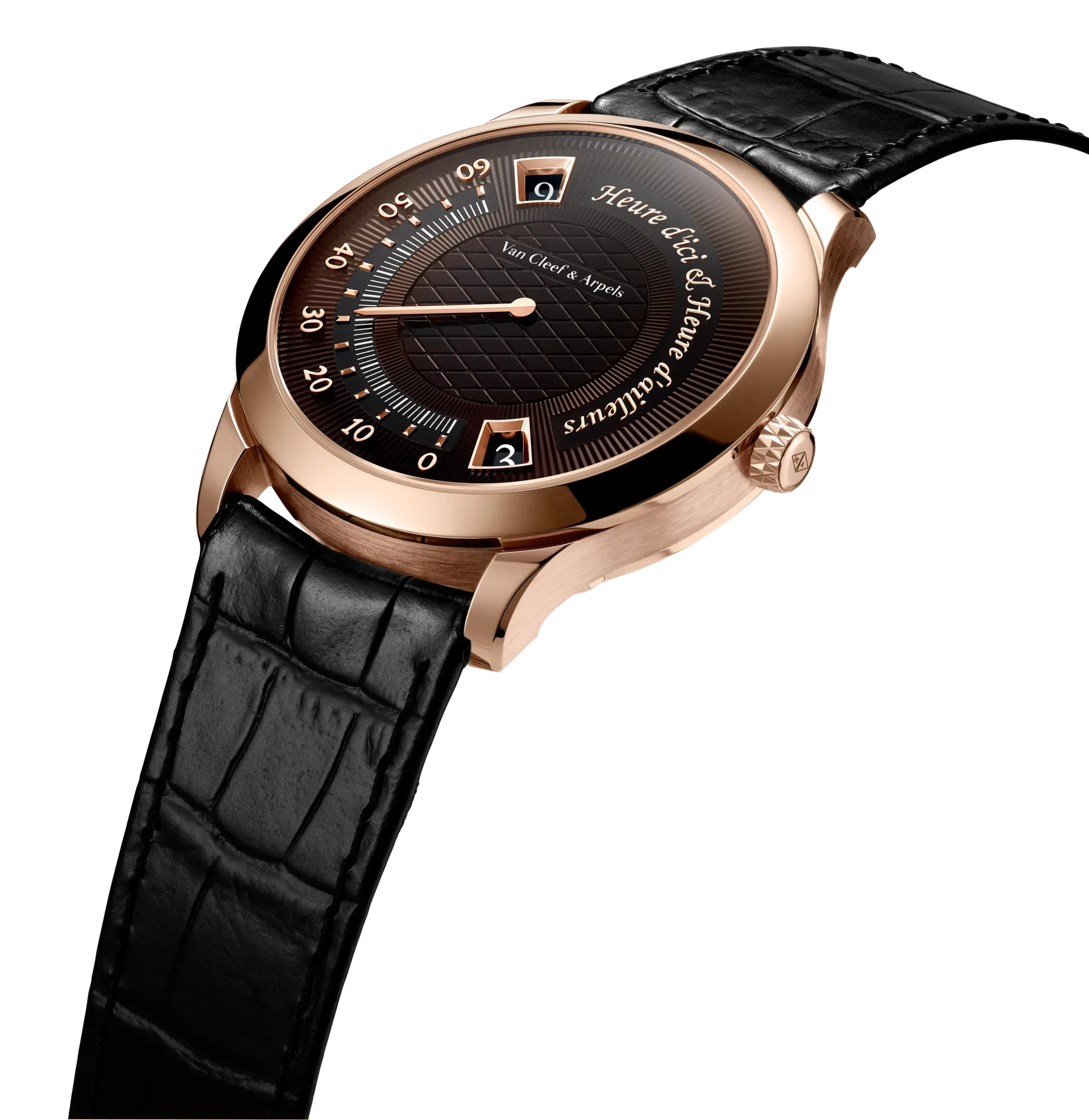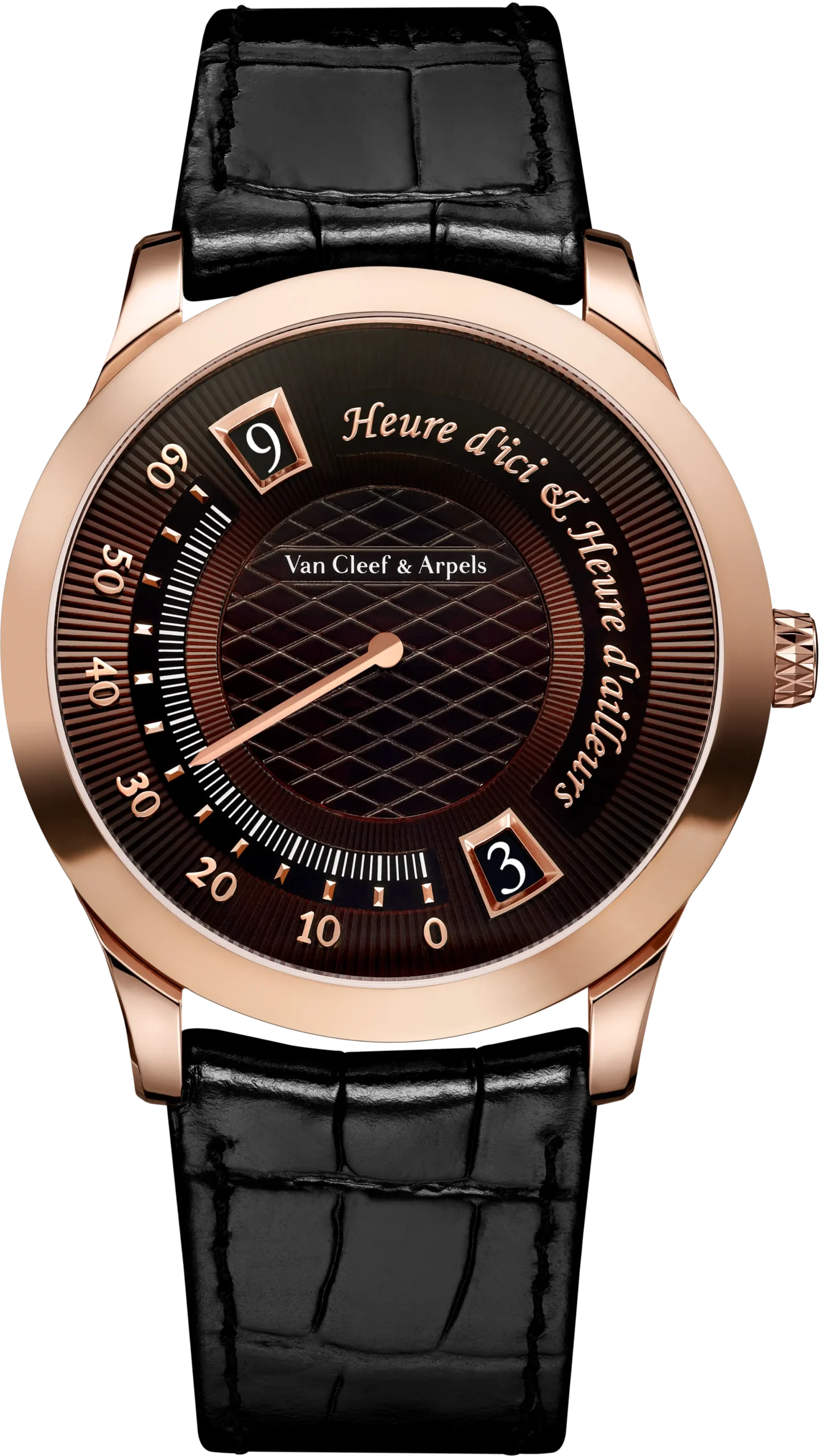 올해 반클리프 아펠(Van Cleef & Arpels)은 ‘미드나잇 에르 디씨 앤 에르 다이에(Midnight Heure d’ici & Heure d’ailleurs)’ 워치를 지름 38mm 로즈 골드 케이스에 깊고 그윽한 브라운 다이얼을 조합해 공개했다. 이 시계는 2014년 ‘피에르 아펠 에르 디씨 앤 에르 다이에’라는 이름으로 처음 등장했다. 지름 42mm의 조약돌을 닮은 매끈한 화이트 골드 케이스에 더블 점핑 아워와 레트로그레이드 미닛을 적용한 듀얼 타임 기능으로 주목받았다. 이후 2018년에는 케이스를 보다 현대적으로 담은 핑크 골드 케이스의 ‘미드나잇’ 버전으로 이어졌다.
