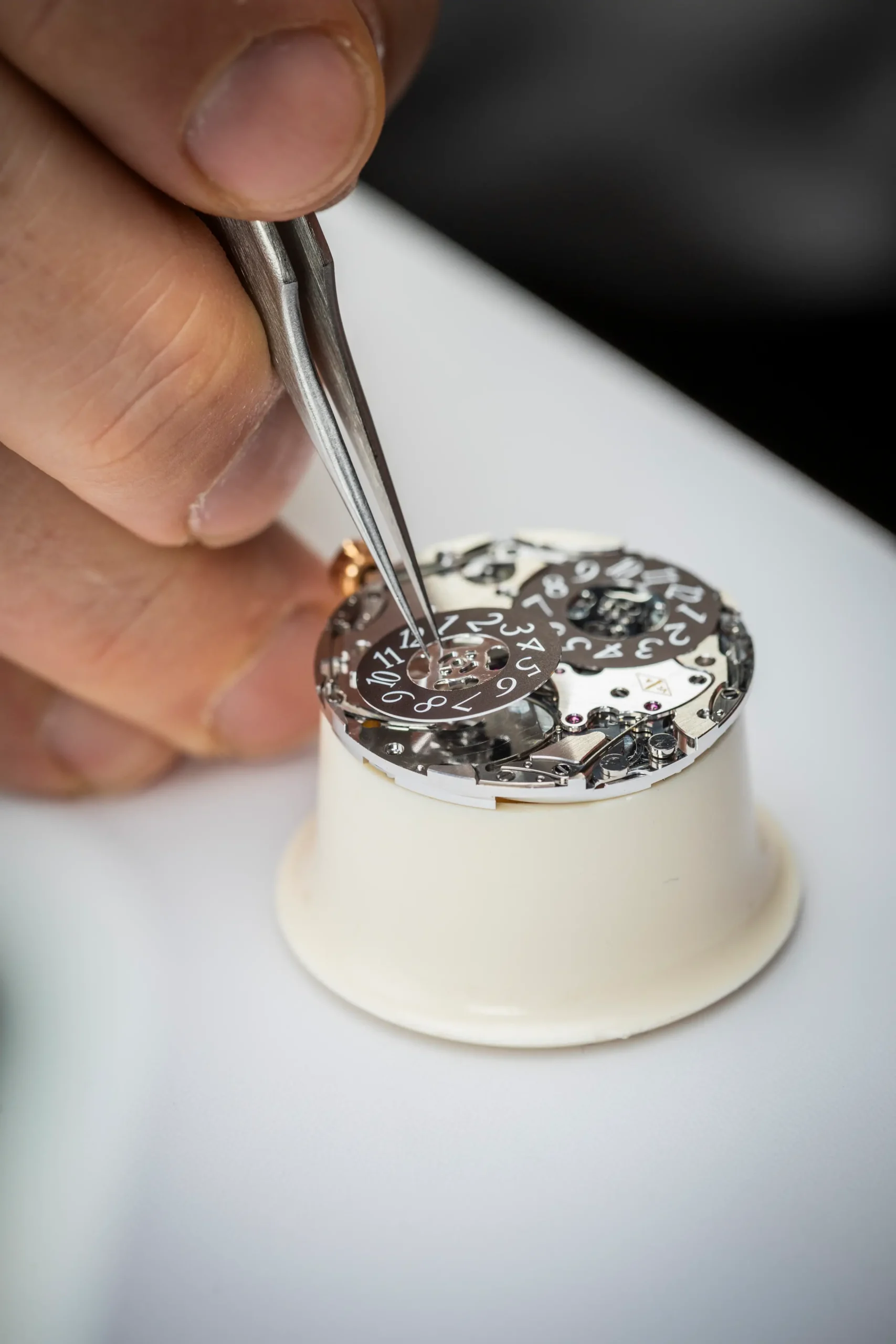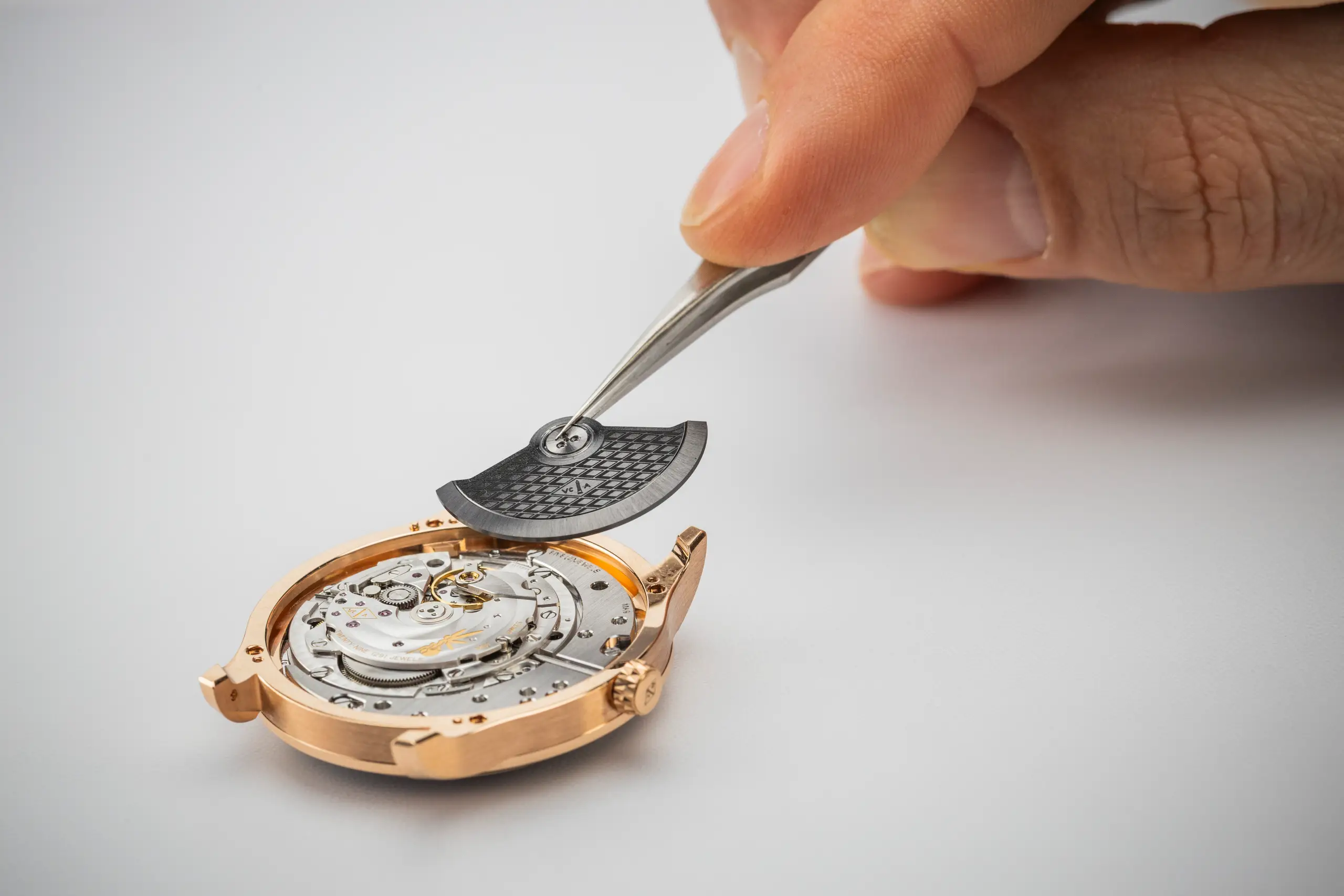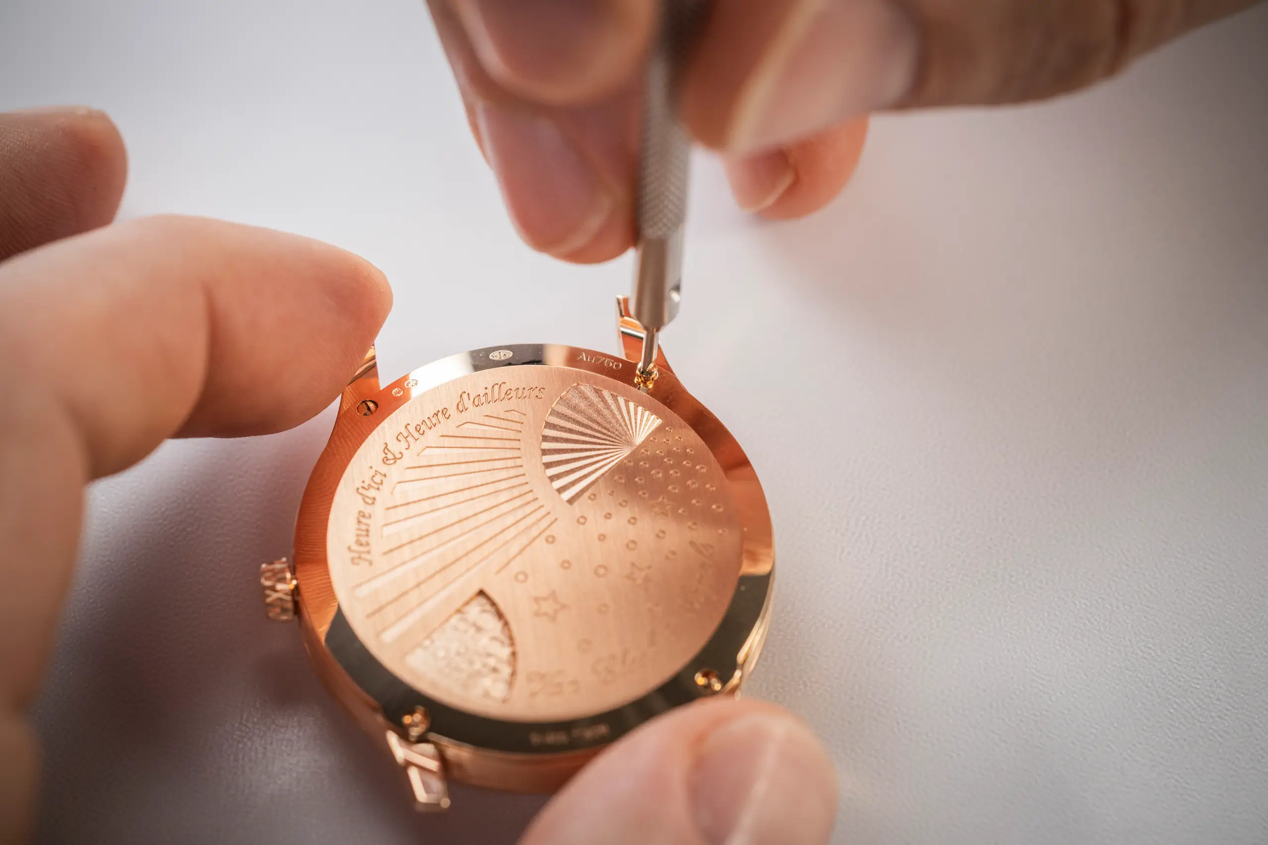 지름 38mm 로즈 골드 케이스는 새틴 브러시드와 폴리시드 마감을 적절히 조합해 질감과 입체감을 동시에 강조했다. 케이스와 은은하게 어우러지는 브라운 다이얼은 제네바 에나멜 워크숍 장인들과 협업해 완성했다. 메종을 상징하는 디테일인 피케(Piqué) 모티프를 중심으로 방사형으로 퍼지는 기요셰 패턴과 여러 차례 소성을 거쳐 형성된 에나멜 레이어가 어우러지며 깊이감을 완성했다. 빛의 각도에 따라 와인빛부터 짙은 브라운까지 미묘하게 변화하는 다채로운 색감과 함께 섬세한 입체감이 드러난다.