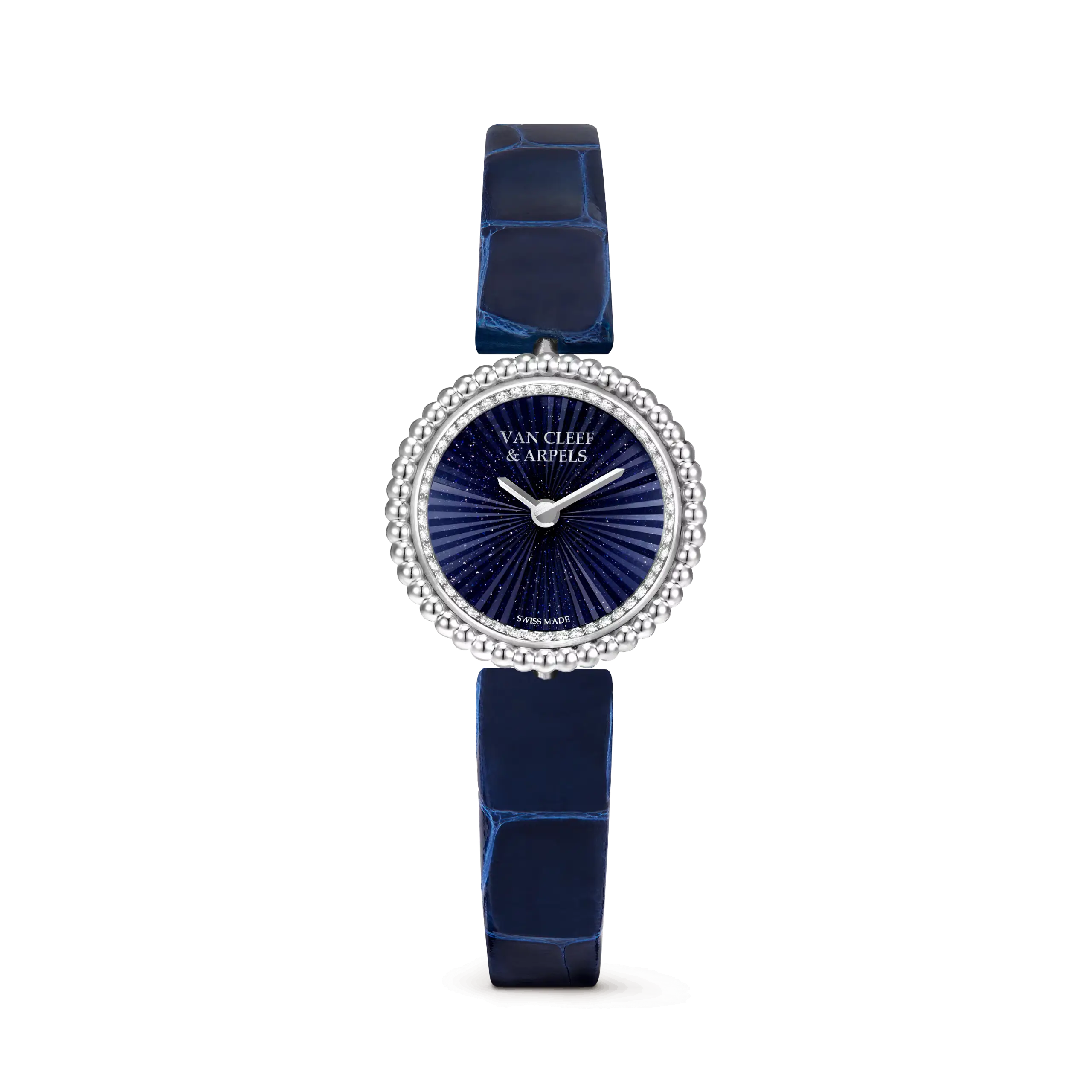 뻬를리 워치(Perlée Watch)는 프랑스어로 작은 구슬, 즉 진주처럼 생긴 비즈를 뜻하는 이름처럼 원형 다이얼을 감싼 동글동글한 골드 비즈 장식이 우아하면서도 여성스러운 분위기를 자아낸다. 올해 신제품은 지름 23mm의 콤팩트한 로듐 도금 18K 화이트 골드 케이스로 선보인다. 케이스에는 두 줄의 폴리싱 처리한 골드 비즈를 더하고, 그 사이에는 다이아몬드를 세팅해 화려함을 추가했다. 화이트 골드 소재와 우아하게 어우러진 푸른빛 다이얼 역시 눈에 띈다. 무라노 어벤츄린 글라스를 사용해 별이 반짝이는 밤하늘을 연상시키는 오묘한 블루 톤을 구현했다. 그 위에는 햇살처럼 퍼지는 기요셰 패턴을 더했으며, 시와 분을 나타내는 작은 핸즈와 브랜드 로고를 배치해 미니멀하게 마무리했다.