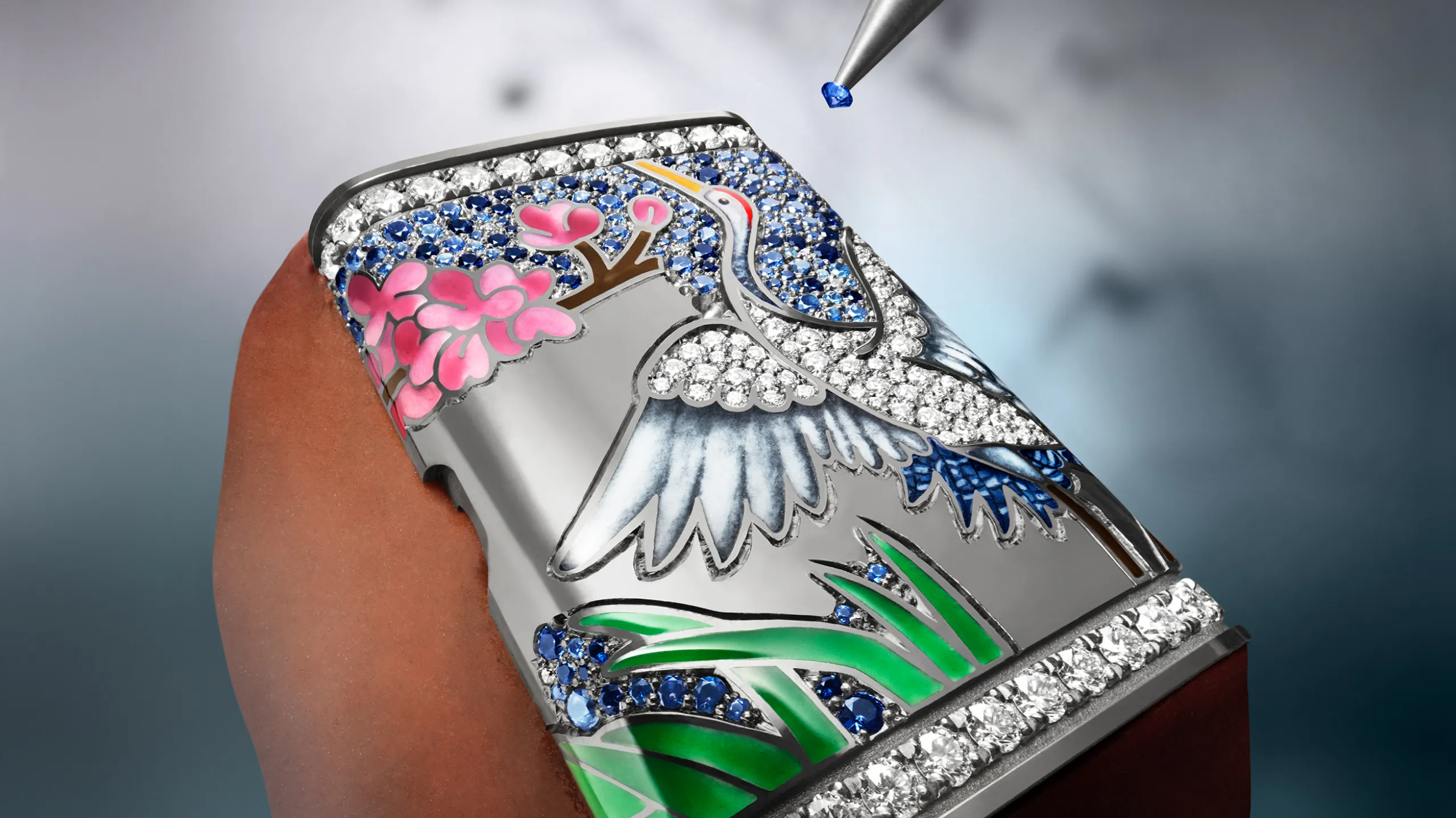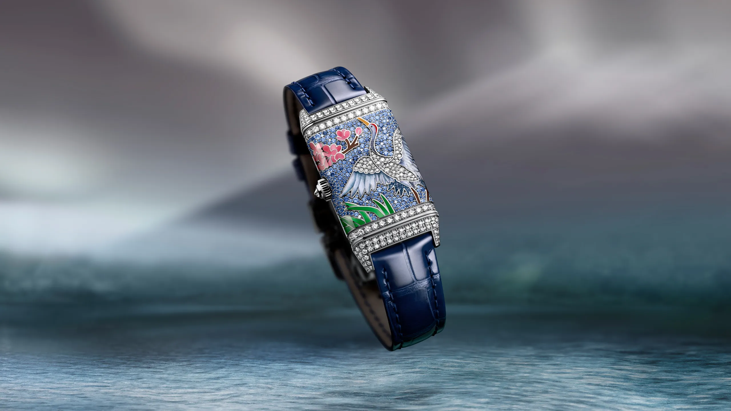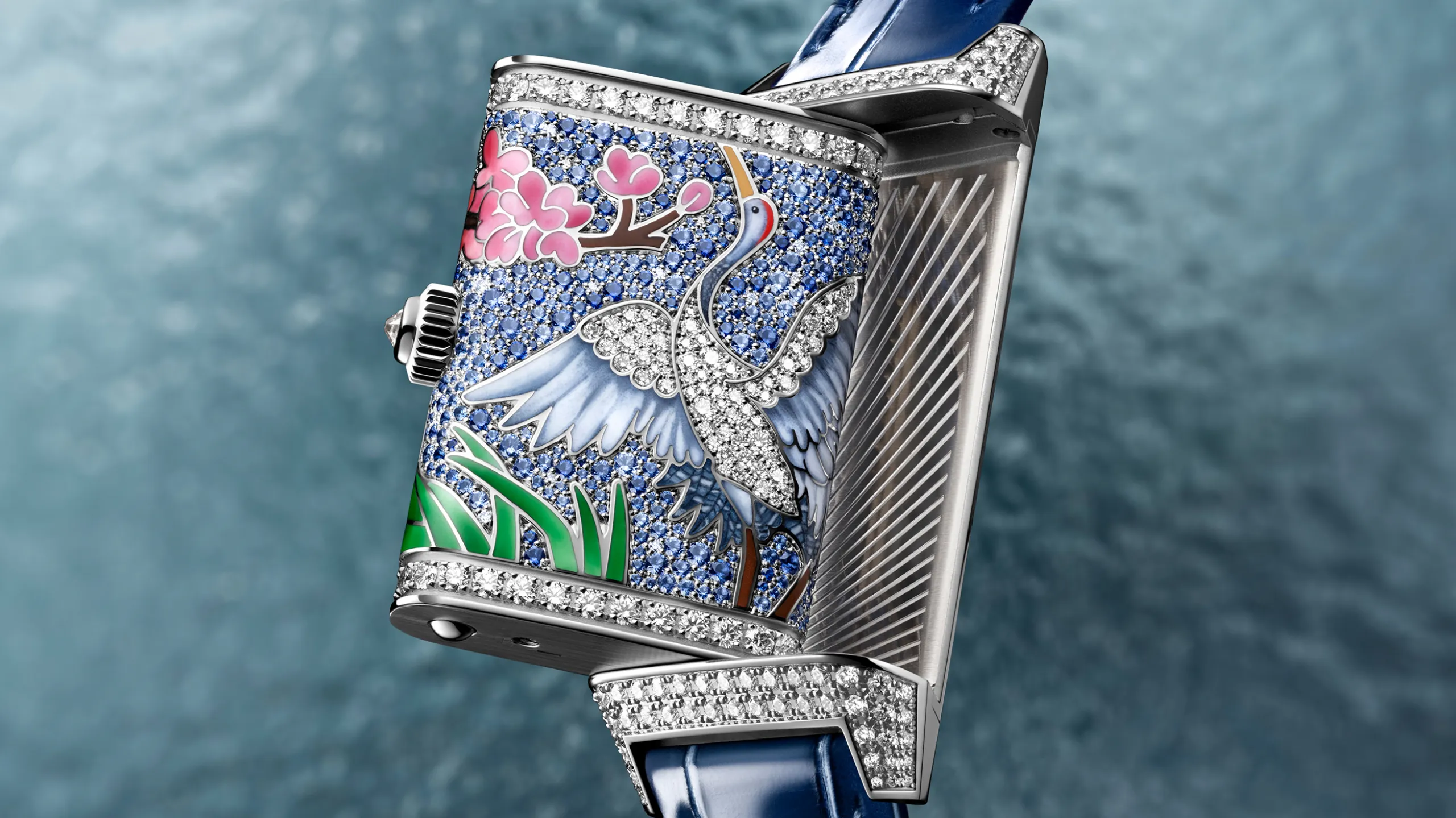 한편 리베르소 원 사쿠라(Reverso One Sakura)는 홋카이도의 봄 풍경을 담은 모델로, 18K 화이트 골드 케이스를 사용했다. 케이스백에는 벚꽃 가지 아래 호수가에 선 두루미 한 마리가 묘사되어 있다. 벚꽃, 갈대, 두루미의 머리와 날개 깃털은 그랑 푀 샹르베 에나멜로, 두루미의 몸통과 날개 윗면은 다이아몬드 스노우 세팅으로 처리했다. 특히 두루미의 목과 솜털은 장인이 단 한 올의 털로 만든 붓으로 그려냈다. 이 모델에서는 메종의 보석 세팅사가 처음으로 컬러 젬스톤에 스노우 세팅 기법을 적용했다. 두 가지 색조의 블루 사파이어와 브릴리언트 컷 다이아몬드를 혼합해 호수 수면의 빛 반사를 표현했으며, 다이아몬드 269개와 사파이어 395개 세팅에만 125시간이 소요됐다.