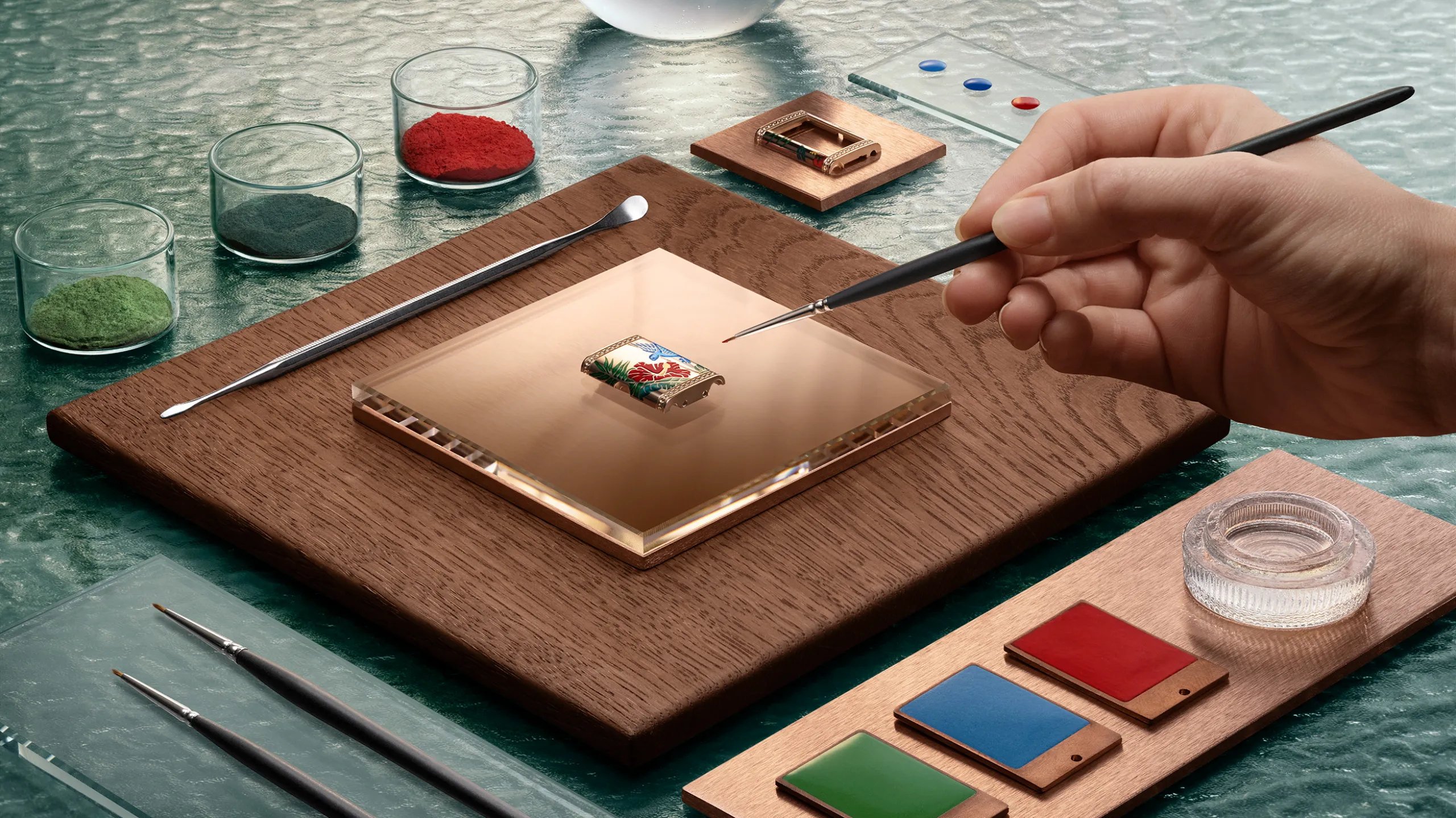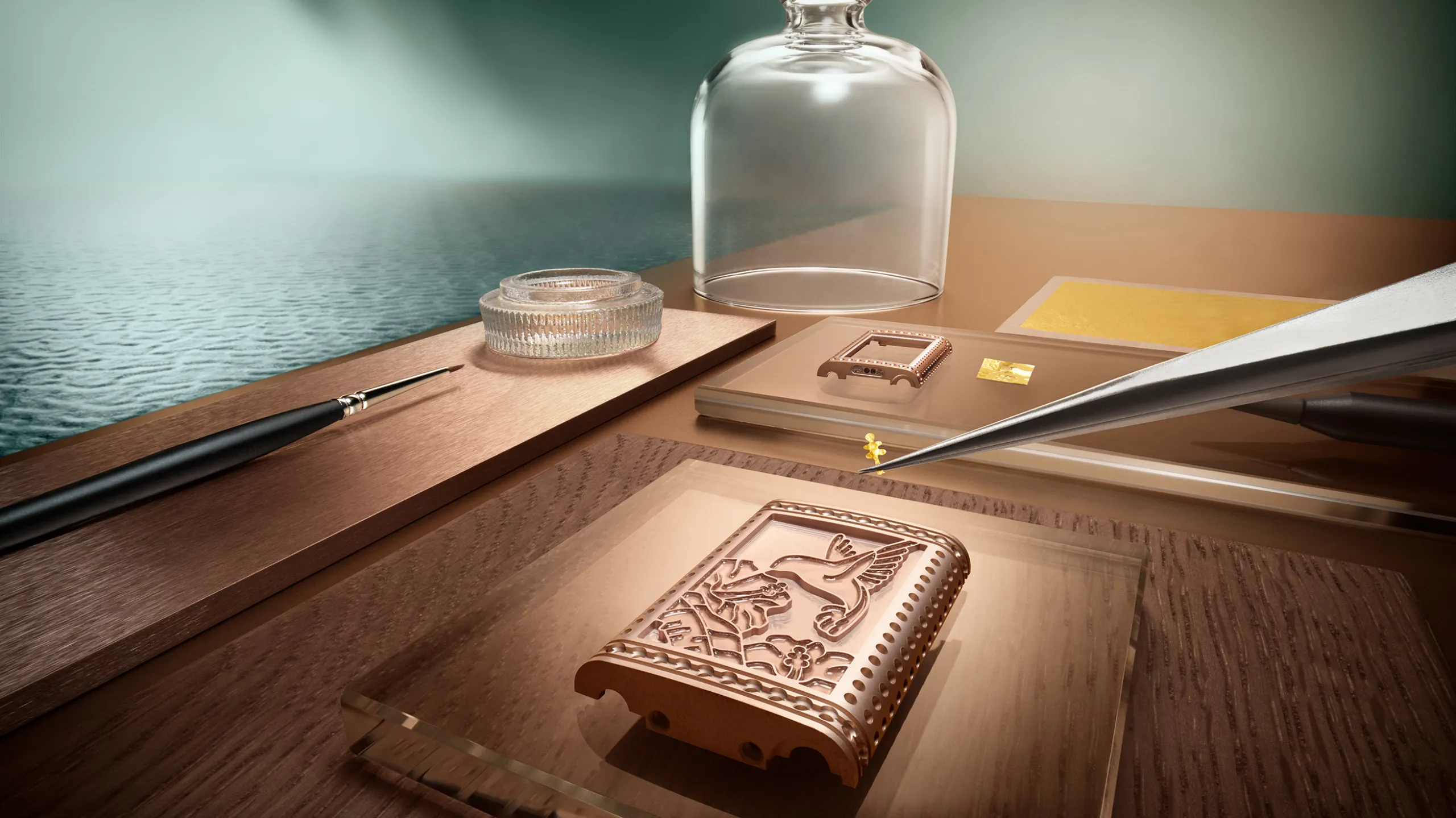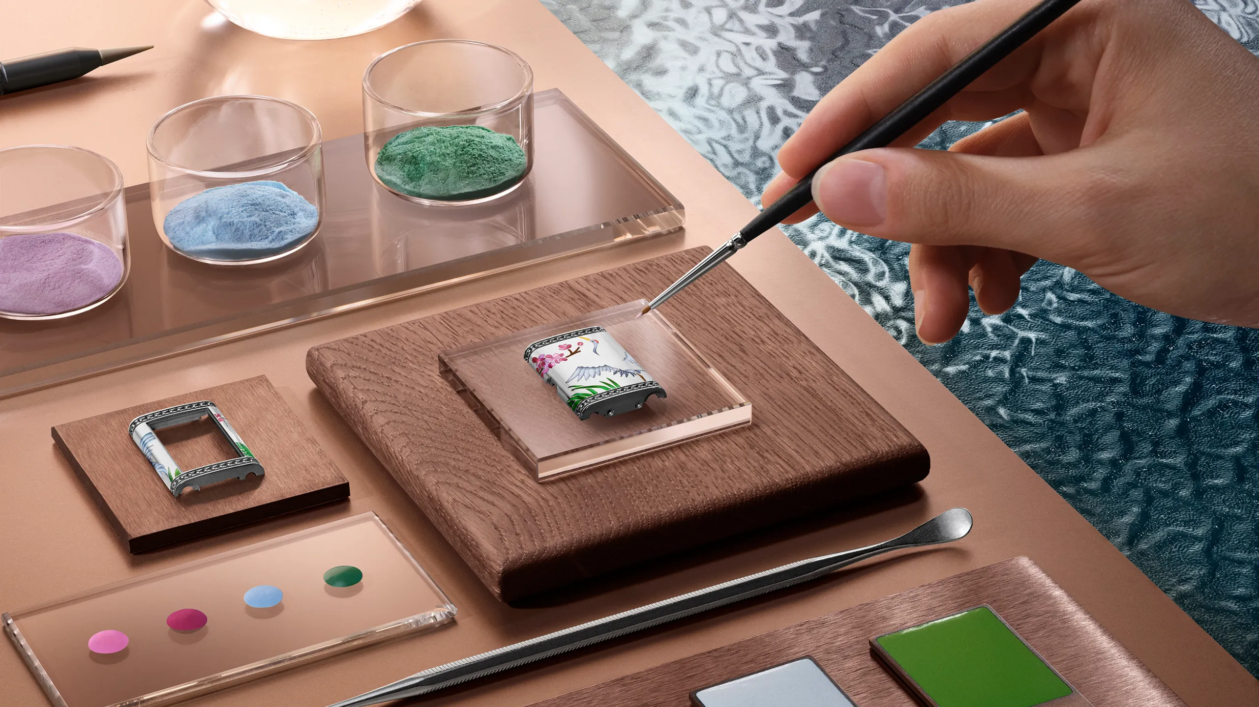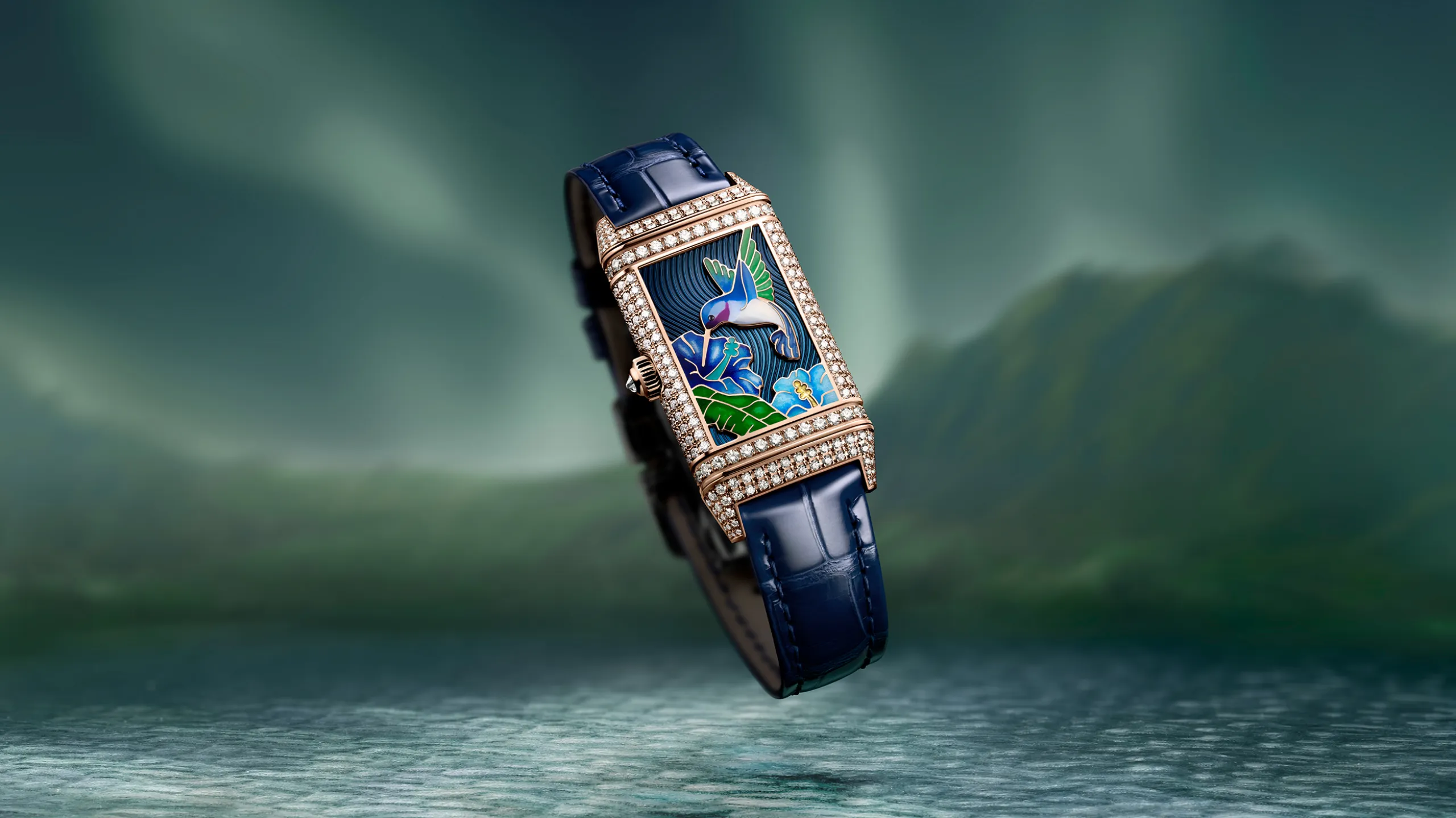 한편 리베르소 원 사쿠라(Reverso One Sakura)는 홋카이도의 봄 풍경을 담은 모델로, 18K 화이트 골드 케이스를 사용했다. 케이스백에는 벚꽃 가지 아래 호수가에 선 두루미 한 마리가 묘사되어 있다. 벚꽃, 갈대, 두루미의 머리와 날개 깃털은 그랑 푀 샹르베 에나멜로, 두루미의 몸통과 날개 윗면은 다이아몬드 스노우 세팅으로 처리했다. 특히 두루미의 목과 솜털은 장인이 단 한 올의 털로 만든 붓으로 그려냈다. 이 모델에서는 메종의 보석 세팅사가 처음으로 컬러 젬스톤에 스노우 세팅 기법을 적용했다. 두 가지 색조의 블루 사파이어와 브릴리언트 컷 다이아몬드를 혼합해 호수 수면의 빛 반사를 표현했으며, 다이아몬드 269개와 사파이어 395개 세팅에만 125시간이 소요됐다.