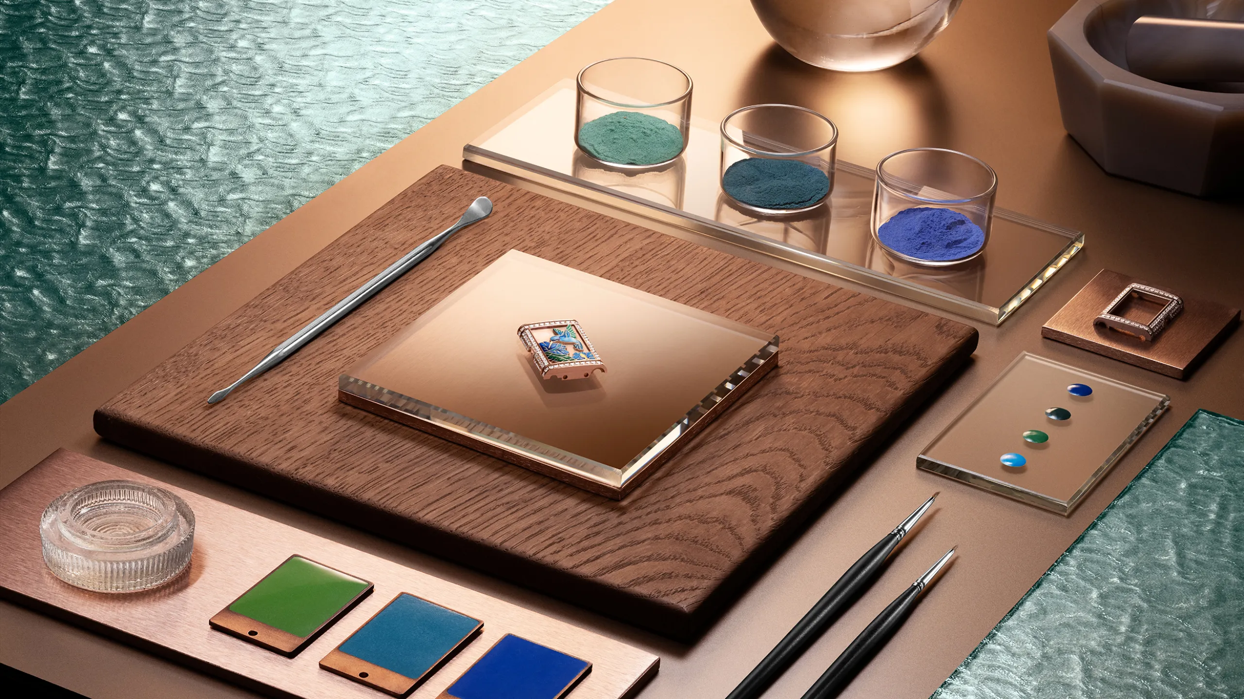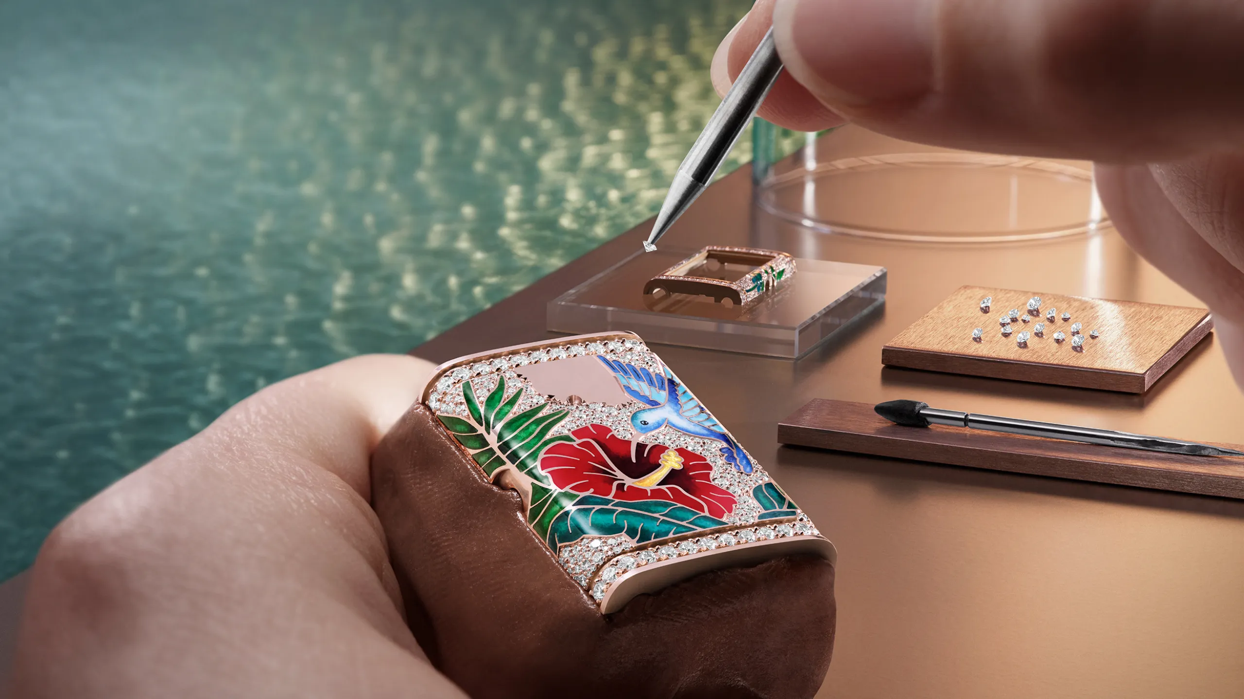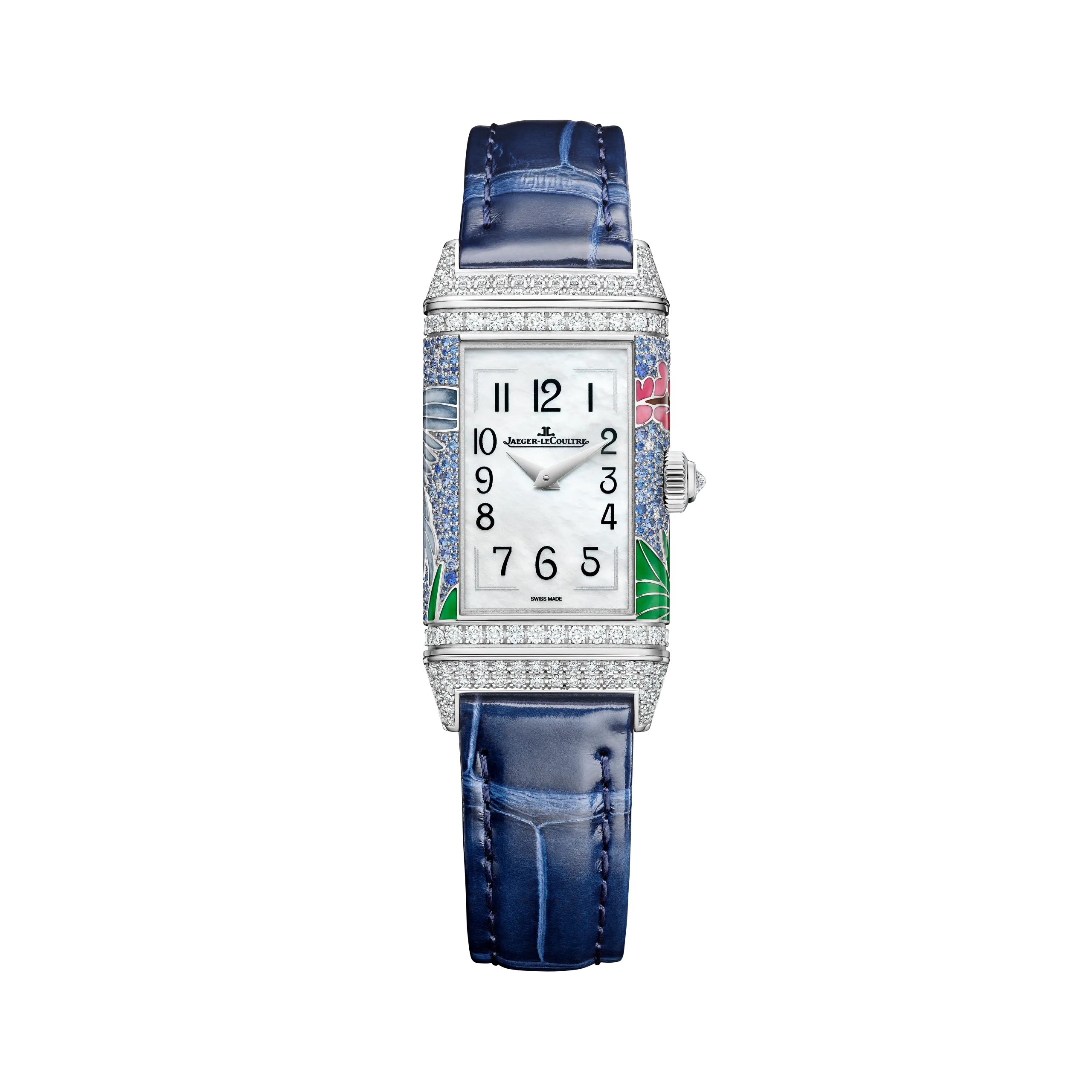 리베르소 원 히비스커스 시리아쿠스의 배경층에는 웨이브 패턴 인그레이빙 위에 블루 래커를 여러 겹 입혔고, 상단층에는 케이스 금속을 직접 파내는 샹르베 기법으로 새와 꽃을 조각한 뒤 그랑 푀 에나멜로 채워 넣었다. 새는 9가지 금속 산화물 안료를 사용한 미니어처 페인팅으로, 꽃잎은 불투명 및 반투명 에나멜 10가지 색상을 층층이 쌓아 그러데이션을 구현했다. 히비스커스 꽃술에는 24K 금박 파요네 에나멜을 더했다. 케이스에는 335개의 다이아몬드를 그레인 세팅했으며, 다이아몬드 세팅 브레이슬릿 버전을 선택할 경우 384개가 추가된다.