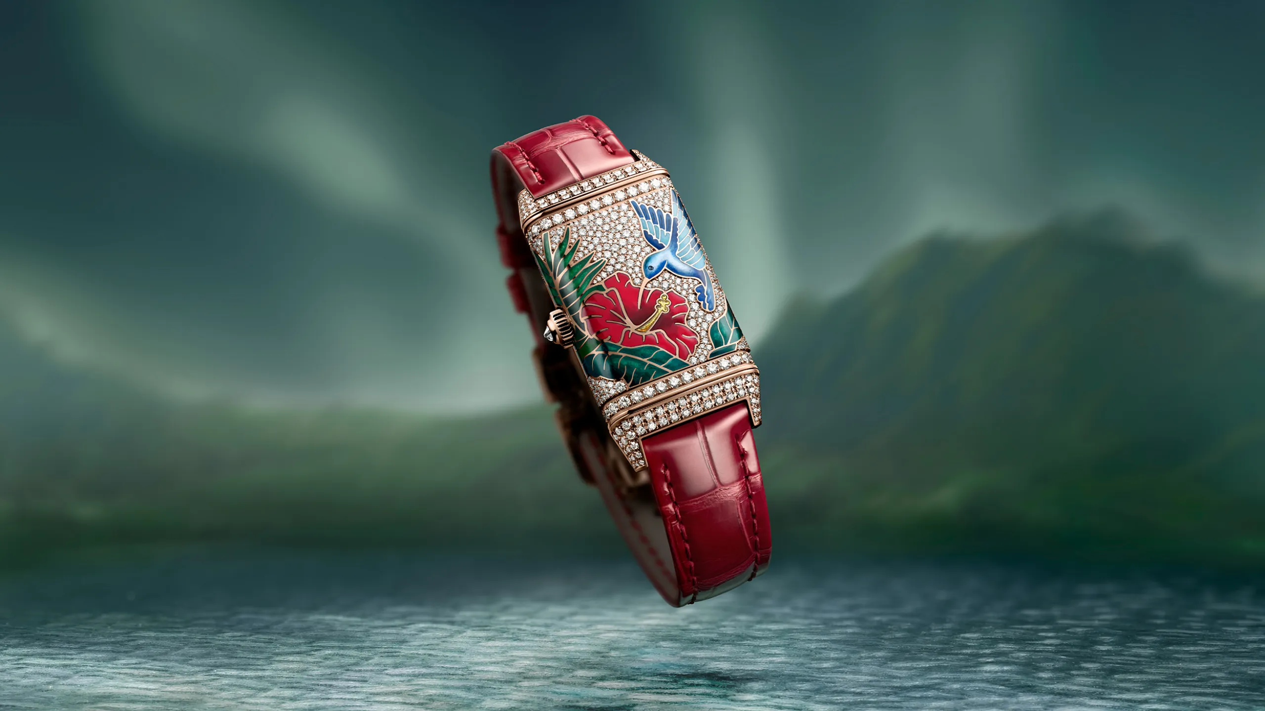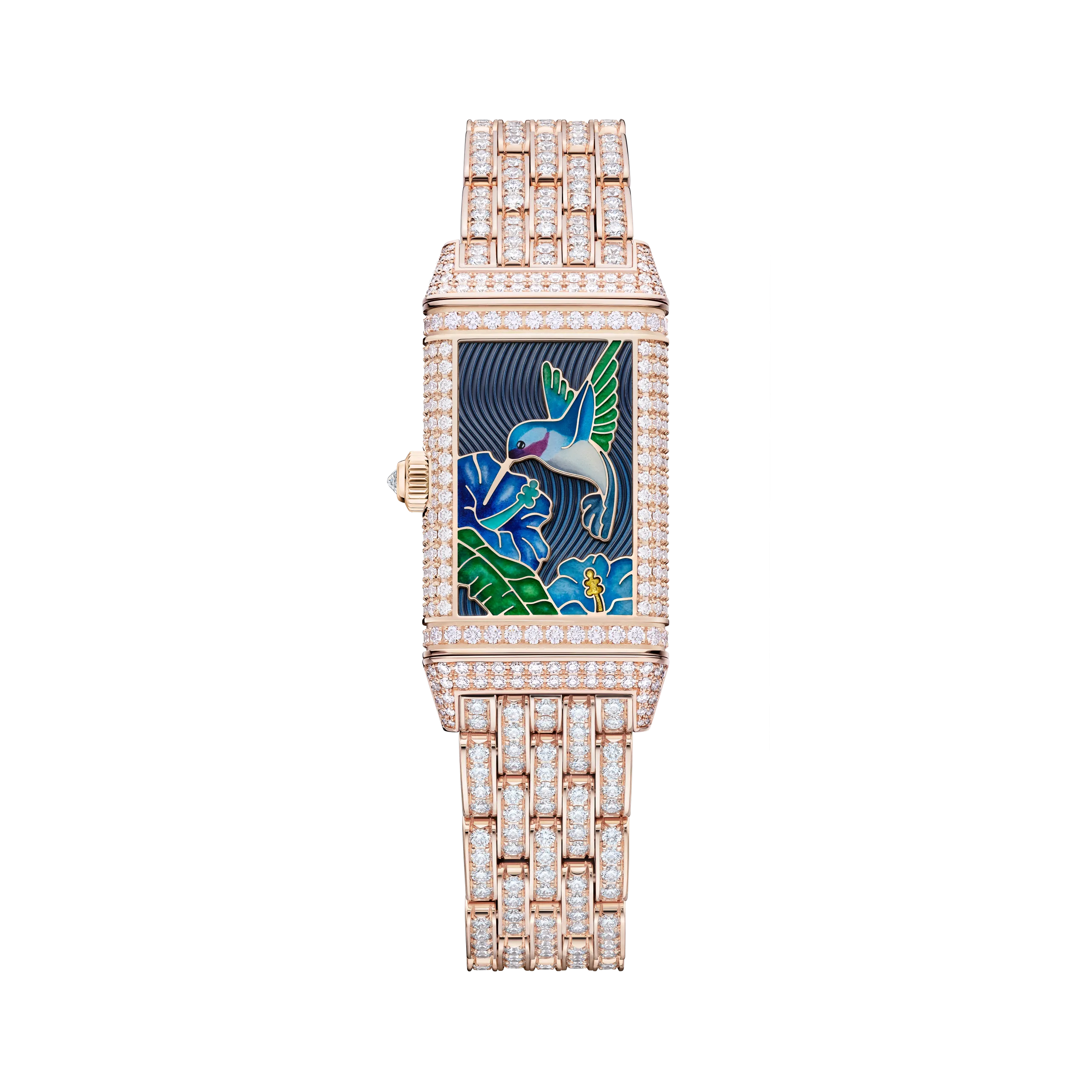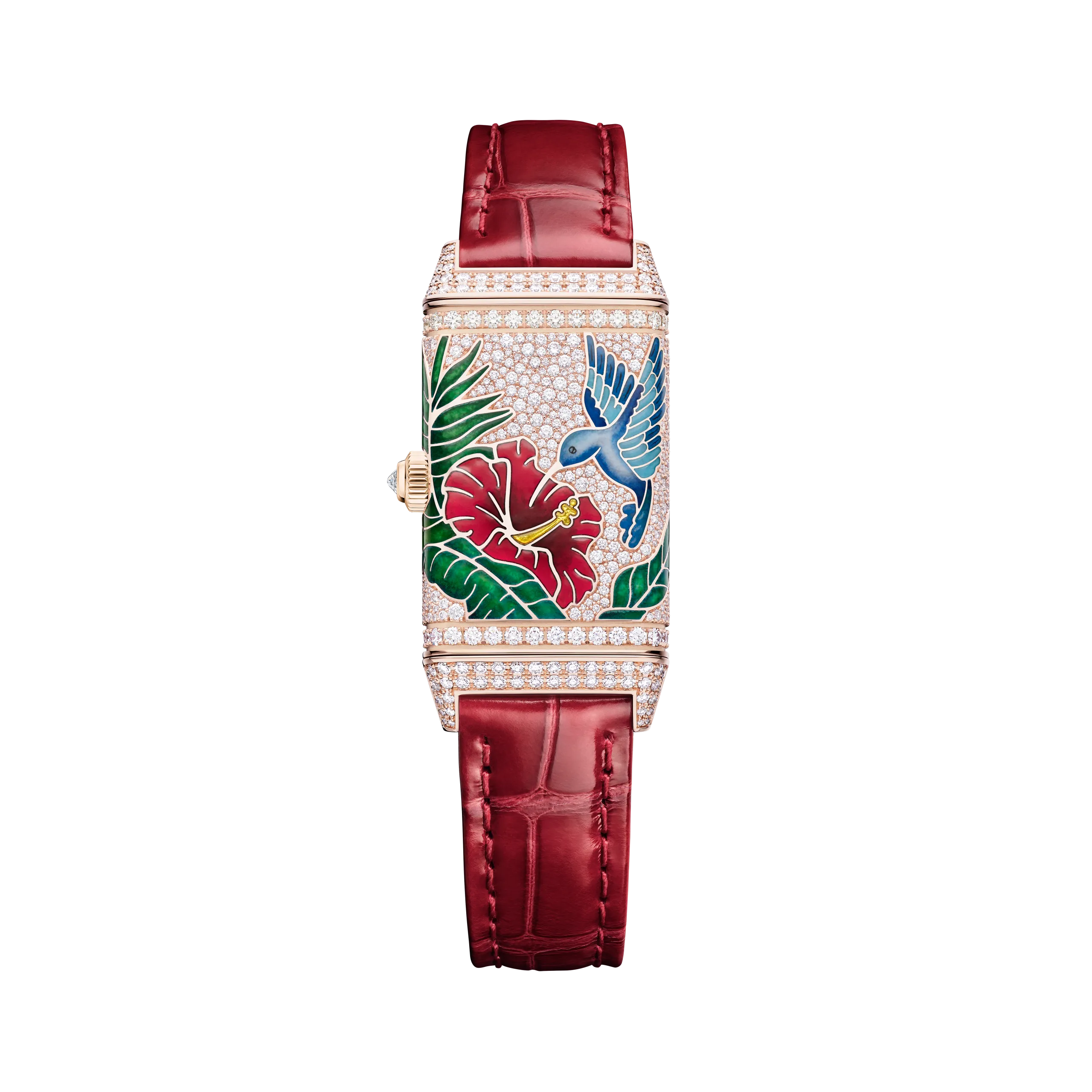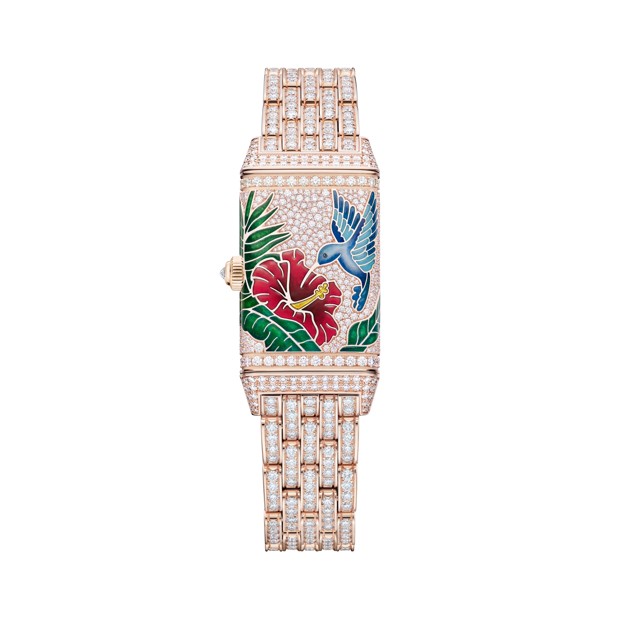 리베르소 원 히비스커스 로사는 붉은 히비스커스 꽃 위의 아키알로아를 담았다. 새, 꽃, 열대 녹음 전체를 그랑 푀 샹르베 에나멜로 표현했으며, 히비스커스의 붉은색을 구현하기 위해 9겹 이상의 에나멜 레이어를 더했다. 여기에 스노우 세팅 기법으로 9가지 크기의 다이아몬드 489개를 케이스에 직접 세팅했는데, 특히 케이스의 곡면을 따라 모티프가 끊김 없이 이어지도록 처리한 것이 돋보인다. 케이스 장식에만 130시간 이상이 소요되었고, 다이아몬드 세팅 브레이슬릿 버전의 경우 60시간이 더 필요하다. 브레이슬릿 버전 기준 총 다이아몬드 수는 645개다.