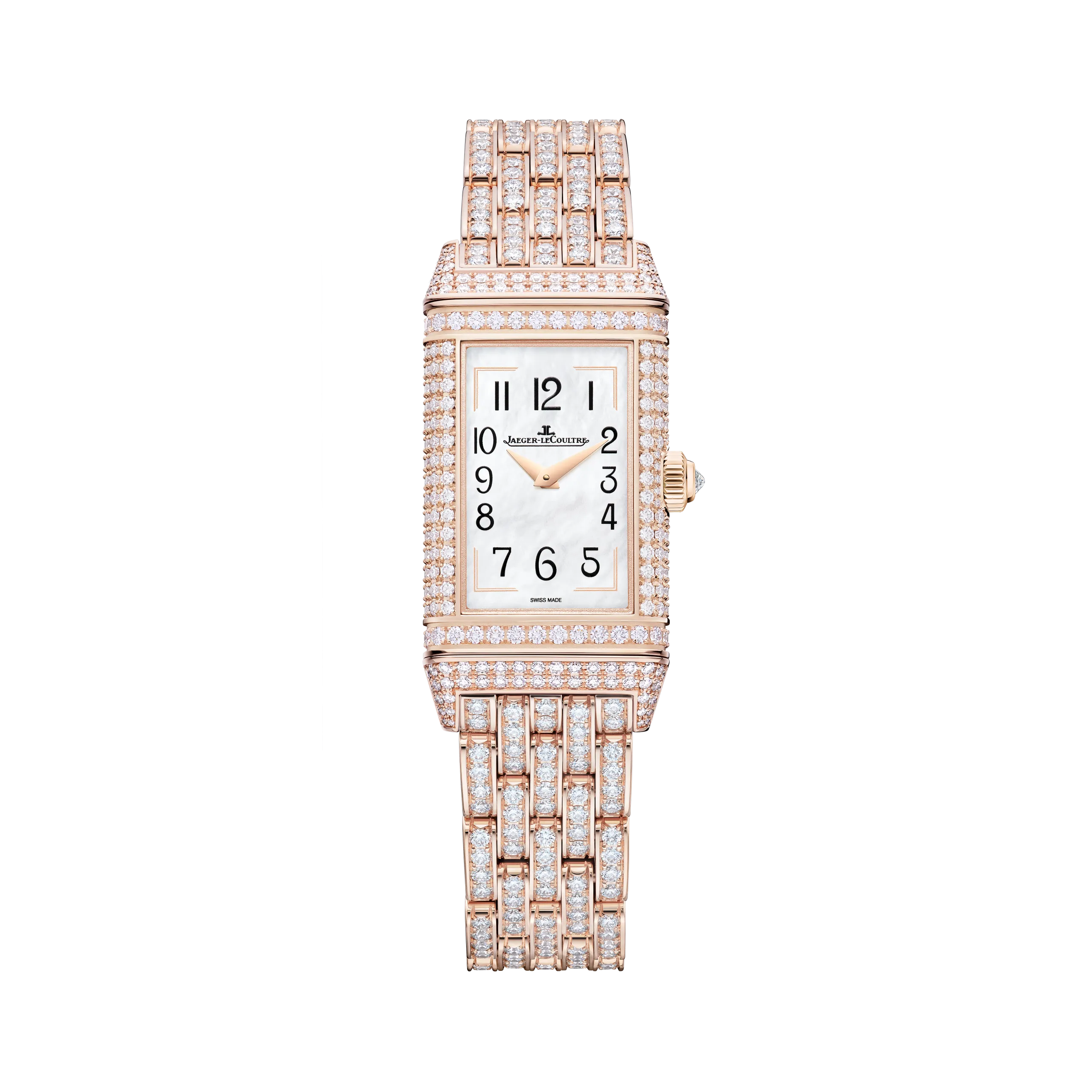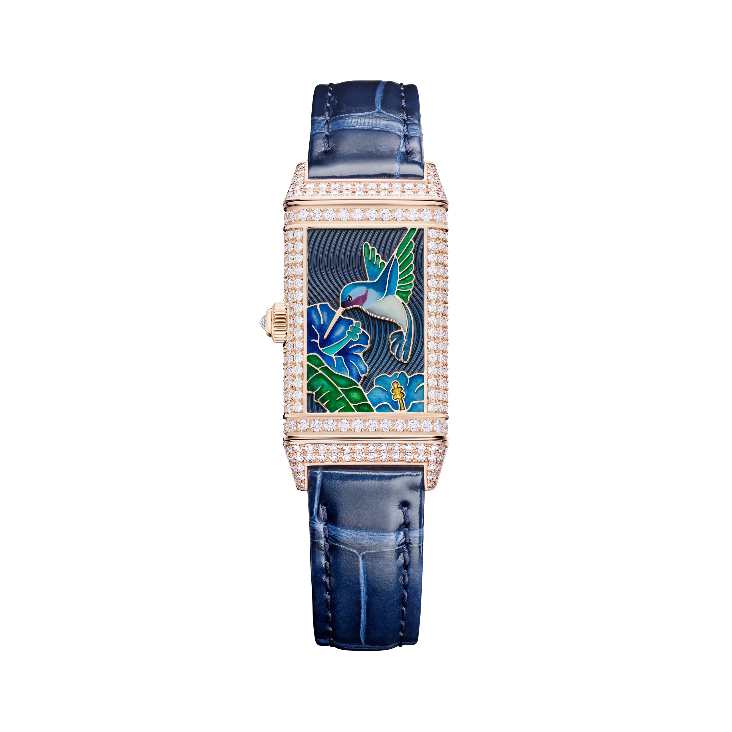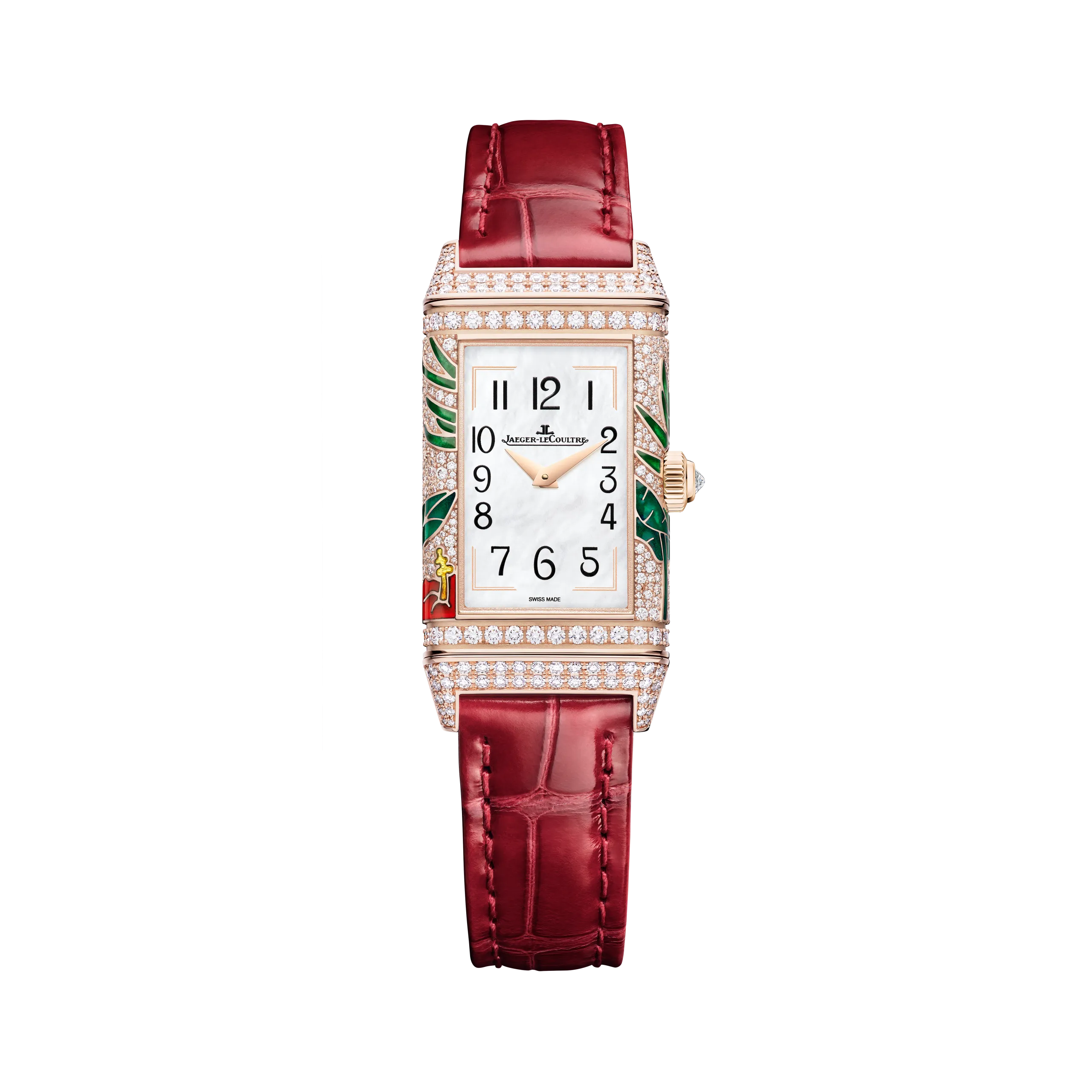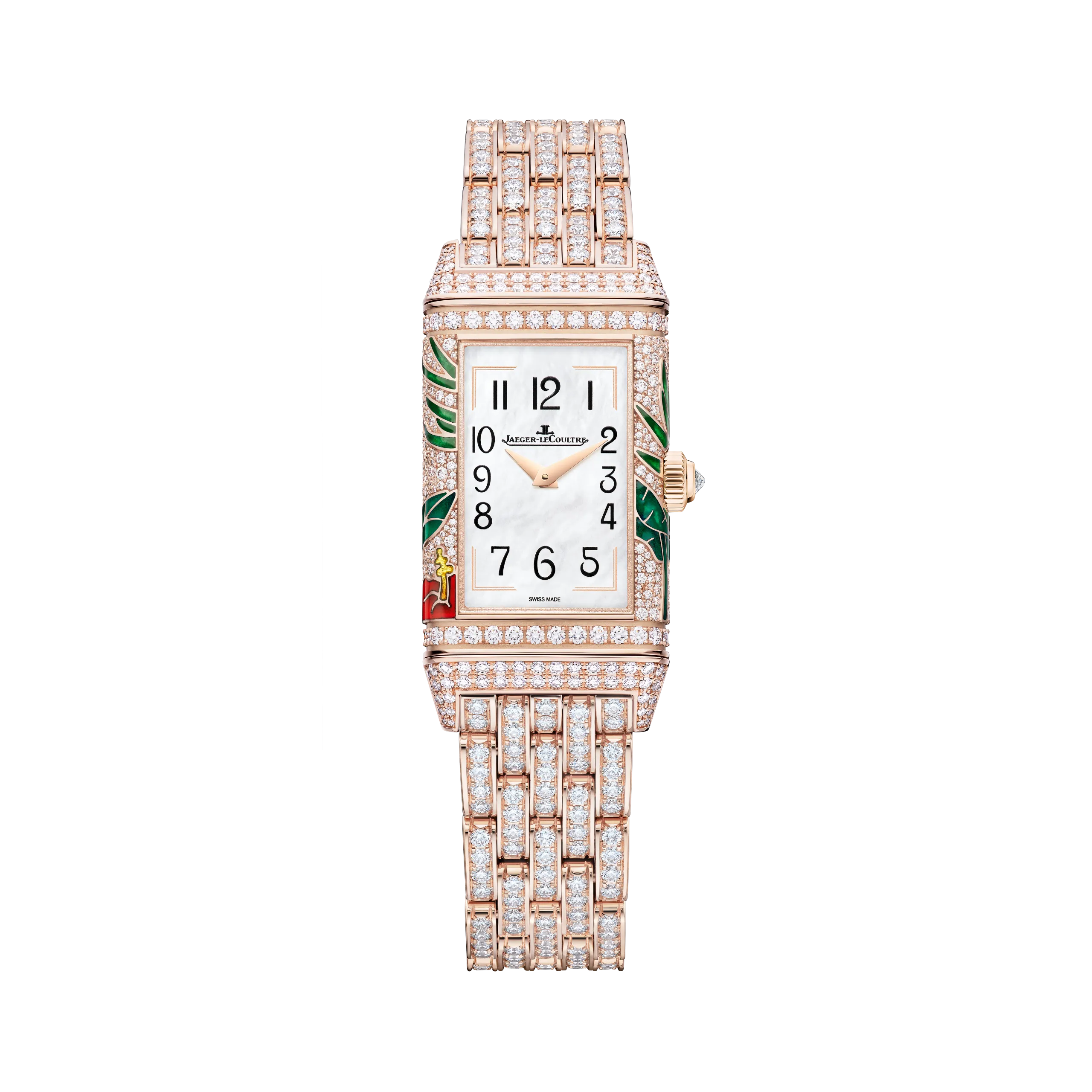 리베르소 원 히비스커스 로사는 붉은 히비스커스 꽃 위의 아키알로아를 담았다. 새, 꽃, 열대 녹음 전체를 그랑 푀 샹르베 에나멜로 표현했으며, 히비스커스의 붉은색을 구현하기 위해 9겹 이상의 에나멜 레이어를 더했다. 여기에 스노우 세팅 기법으로 9가지 크기의 다이아몬드 489개를 케이스에 직접 세팅했는데, 특히 케이스의 곡면을 따라 모티프가 끊김 없이 이어지도록 처리한 것이 돋보인다. 케이스 장식에만 130시간 이상이 소요되었고, 다이아몬드 세팅 브레이슬릿 버전의 경우 60시간이 더 필요하다. 브레이슬릿 버전 기준 총 다이아몬드 수는 645개다.