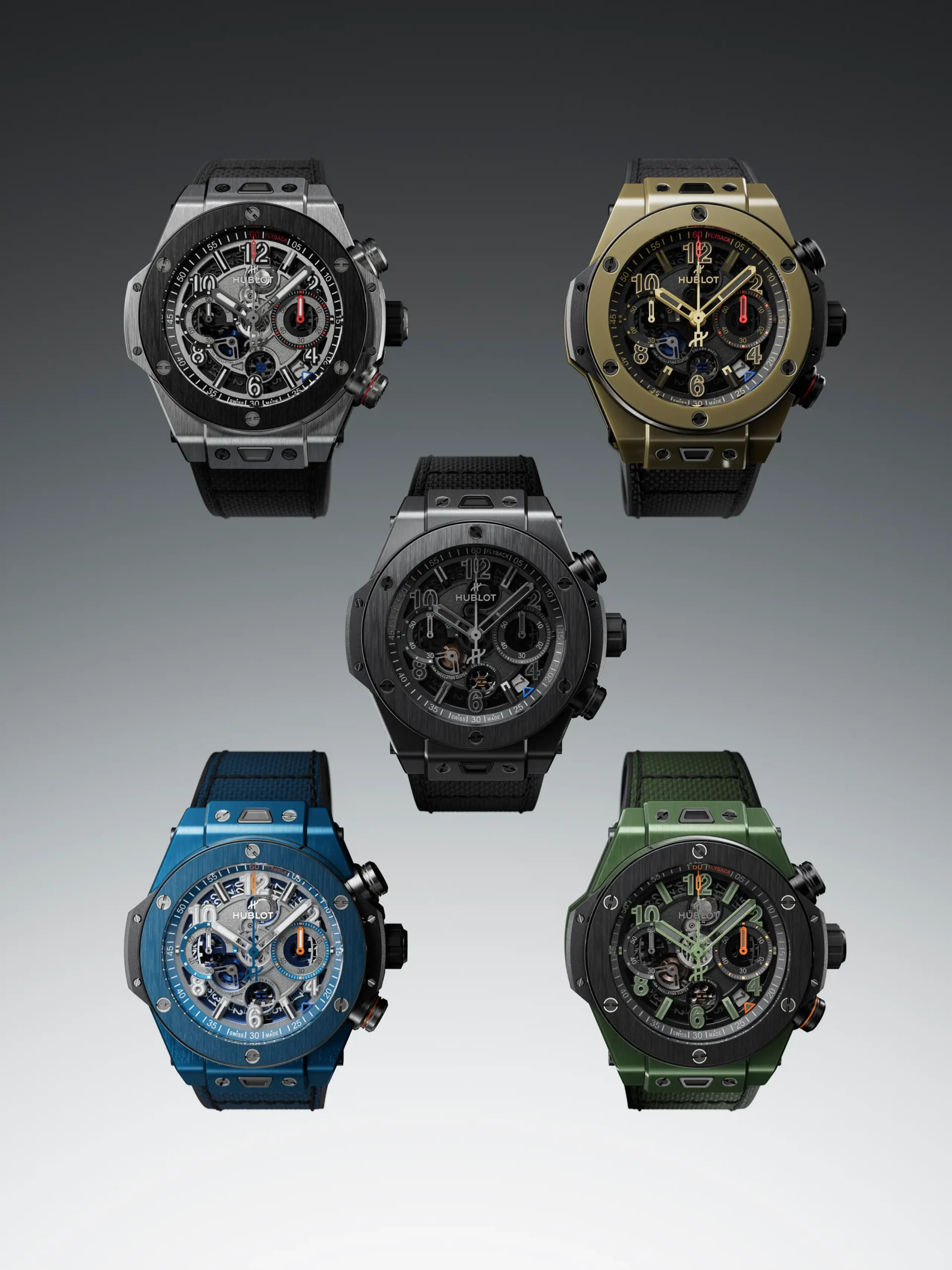 ‘빅뱅 리로디드’는 올해 초 LVMH 워치 위크에서 공개한 ‘빅뱅 오리지널 유니코(Big Bang Original Unico)’를 잇는 모델이다. 격자무늬 다이얼의 전작과 달리 이번에는 유니코 무브먼트의 메커니즘을 드러낸 오픈워크 버전으로 완성했다. 라인업은 총 다섯 가지. 전 모델은 지름 44mm, 두께 14.5mm의 배럴형 케이스로 완성했다. 위블로를 상징하는 시그니처 소재를 각 모델에 적용했으며, 매직 골드, 다크 그린 세라믹, 블루 세라믹, 올 블랙 세라믹, 그리고 티타늄 케이스 버전으로 만날 수 있다. 참고로 2011년 공개된 ‘매직 골드’는 올해로 15주년을 맞았다. 위블로의 기술력을 상징하는 소재로, 스크래치 저항성을 갖춘 18K 골드 합금이며 녹색빛이 감도는 독특한 골드 톤이 특징이다. 또한 위블로의 ‘올 블랙’ 콘셉트는 올해로 20주년을 맞으며 브랜드의 상징적인 디자인 언어로 자리 잡았다. 방수 성능은 100m다.