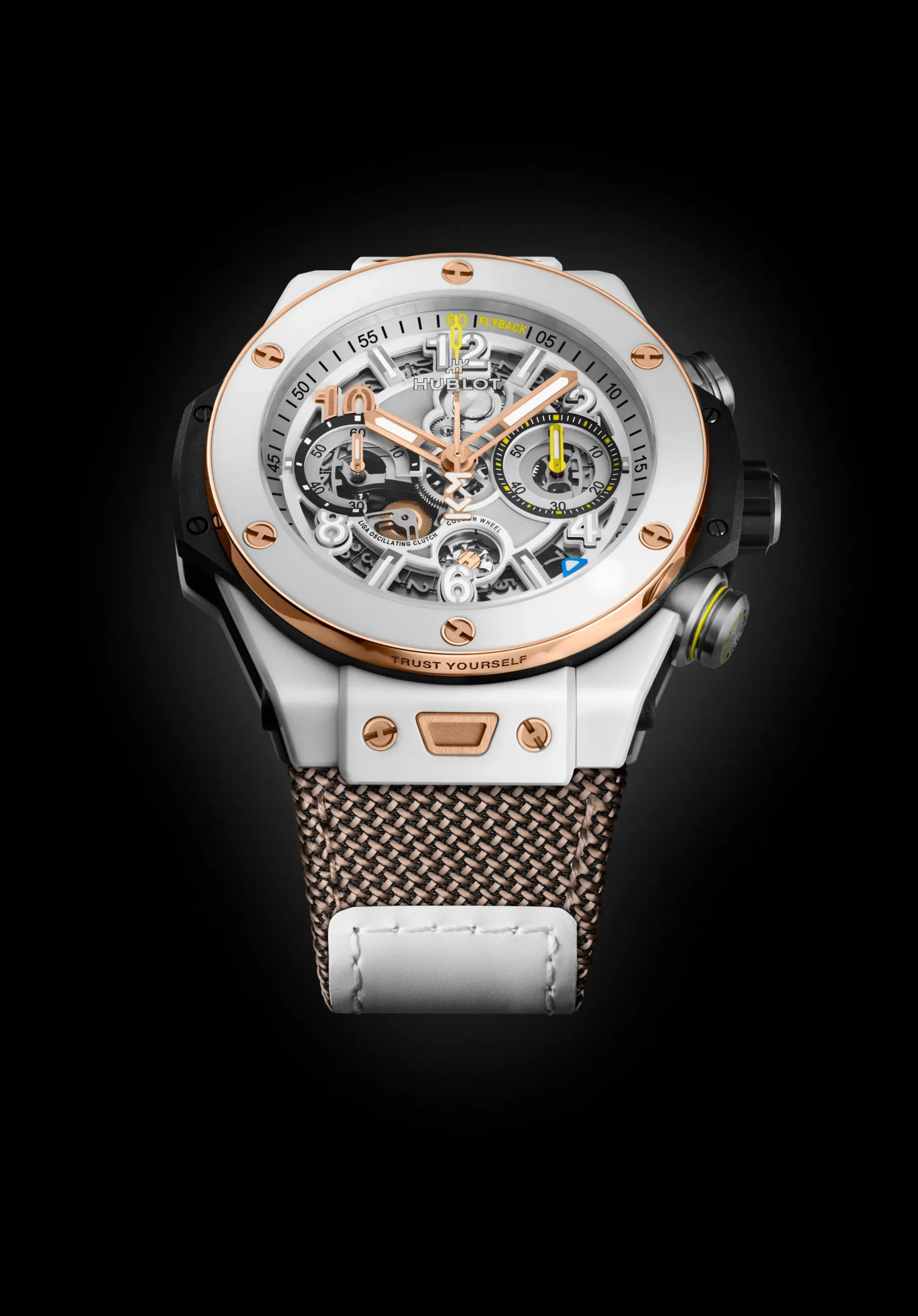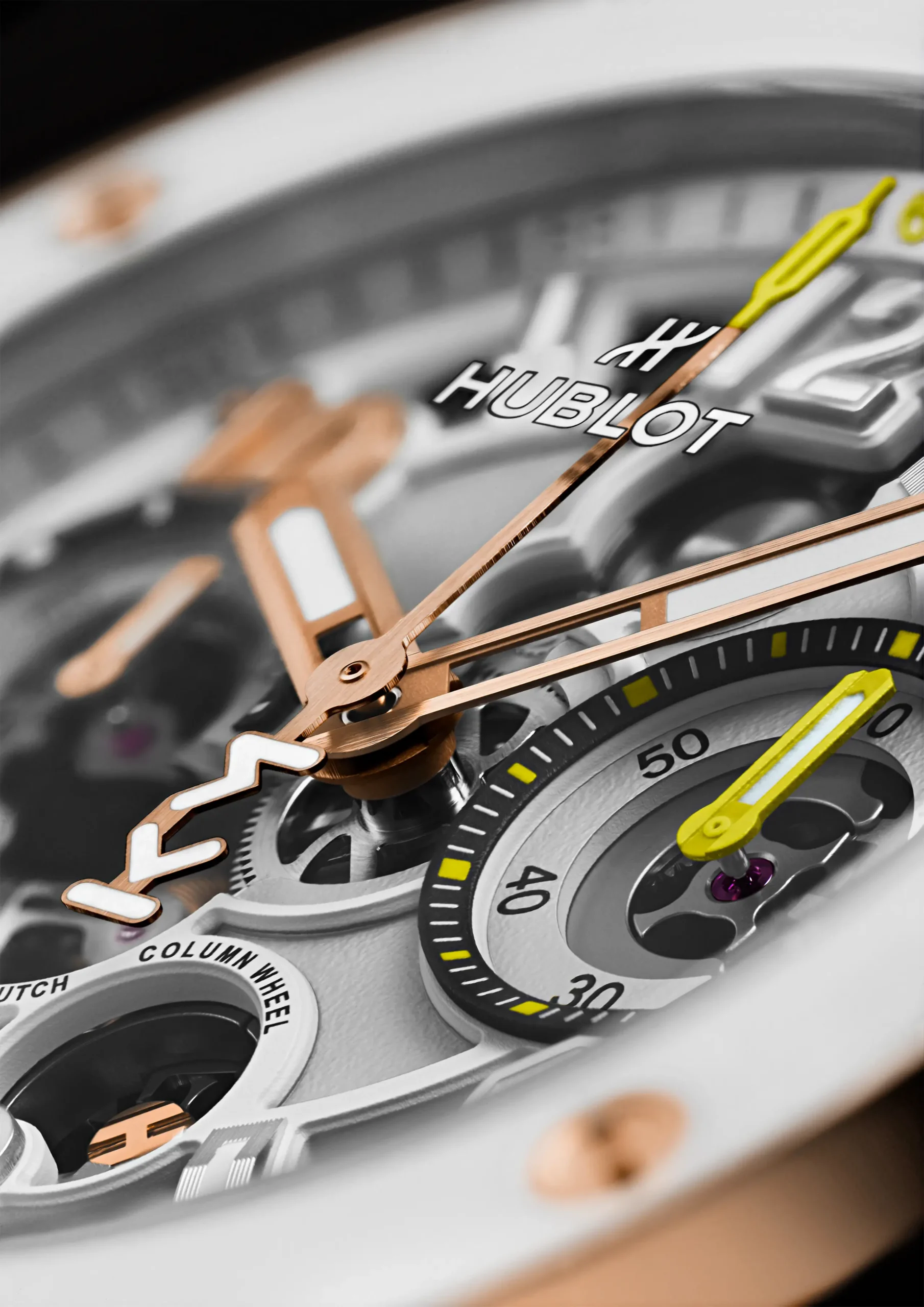 다이얼은 구조적인 미학이 돋보인다. 크로노그래프 무브먼트의 메커니즘을 드러낸 구조 위로 다양한 디테일을 균형감 있게 배치했다. 부분적으로 스켈레톤 처리한 핸즈는 아라비아 숫자와 바 인덱스를 가리키며, 그 안에는 슈퍼 루미노바를 채워 야간 가독성을 높였다. 3시 방향에는 60분 카운터, 9시 방향에는 스몰 세컨즈를 배치했다. 특히 3시 방향 카운터에는 10분 단위 마커와 핸드에 컬러 포인트를 더했으며, 이 컬러는 중앙 크로노그래프 초침 끝, 가장자리 스케일의 ‘60’과 ‘Flyback’ 문구, 하단 푸셔의 링 디테일까지 이어진다. 단, 올 블랙 모델은 예외다. 날짜창은 기존 유니코 모델의 3시 방향 대신 4시와 5시 방향 사이에 배치했다. 이는 오리지널 빅뱅의 디자인 요소를 계승한 것이다. 날짜를 가리키는 컬러 슈퍼루미노바 화살표 역시 눈에 띄는 디테일이다.