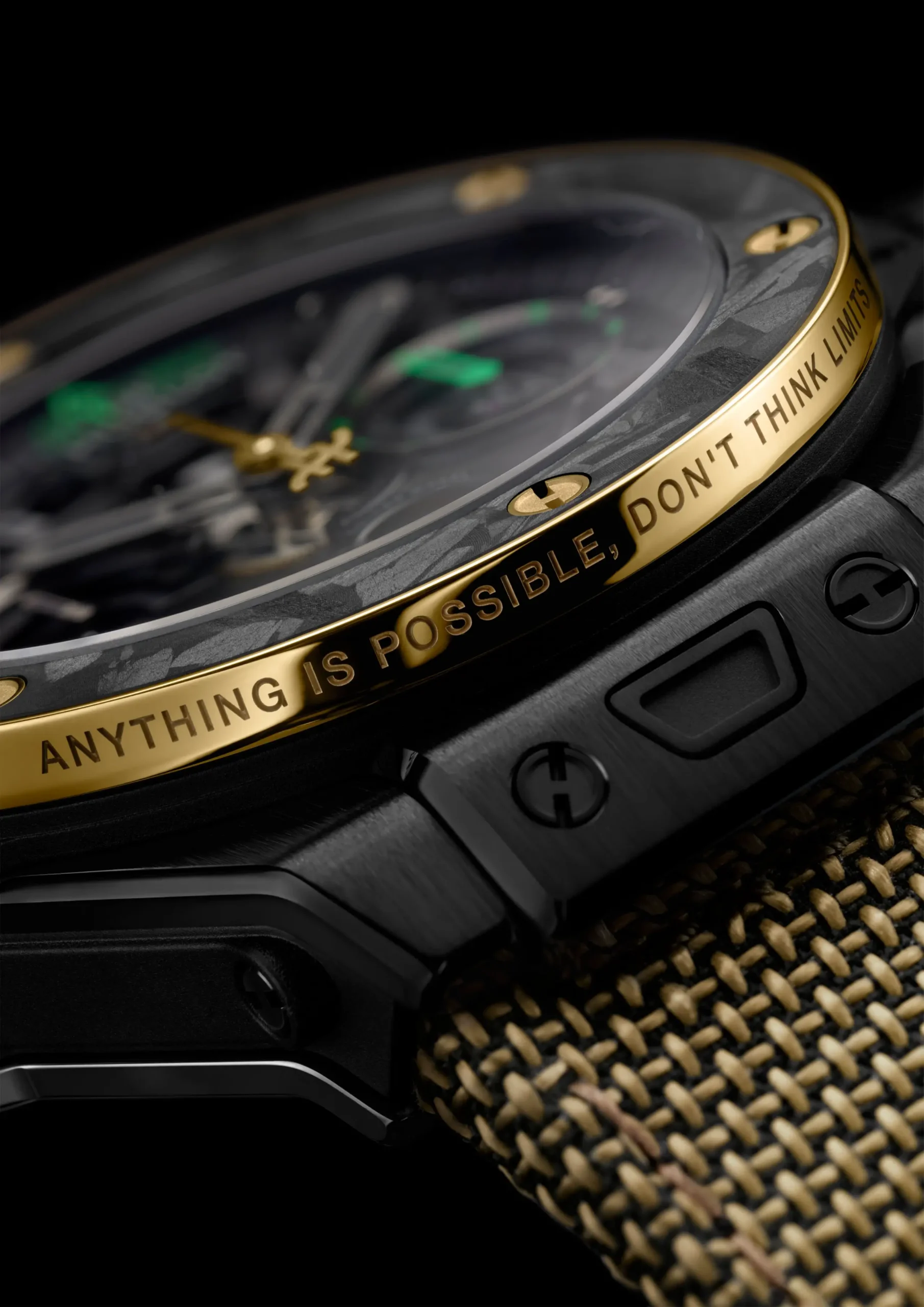 두 번째 모델은 ‘빅뱅 리로디드 우사인 볼트(Big Bang Reloaded Usain Bolt)’ 에디션이다. 지름 44mm의 블랙 세라믹과 카본을 결합한 케이스로 완성했다. 카본 소재 특유의 유니크한 패턴이 돋보이며, 여기에 골드와 그린, 옐로우 컬러 포인트를 더해 강렬한 이미지를 연출했다. 카본 베젤을 둘러싼 18K 옐로우 골드 링에는 우사인 볼트의 철학을 반영한 ‘Anything is possible, Don’t think limits’라는 메시지를 새겼다. 또한 6시에서 8시 사이 인덱스에는 6-5-8 숫자를 배치했는데, 이를 뒤집으면 그가 2019년 세운 100m 세계 기록 9.58초를 상징한다. 중앙 크로노그래프 초침은 그의 상징적인 포즈를 연상시키는 번개 모양으로 디자인했다. 케이스 백에는 두 개의 사파이어 크리스털 사이, 번개 모양 구조 안에 어린 시절 훈련하던 자메이카의 실제 흙을 담았다. 스트랩은 옐로우 골드 톤 패브릭과 카모플라주 패턴 러버 스트랩을 함께 구성했다.