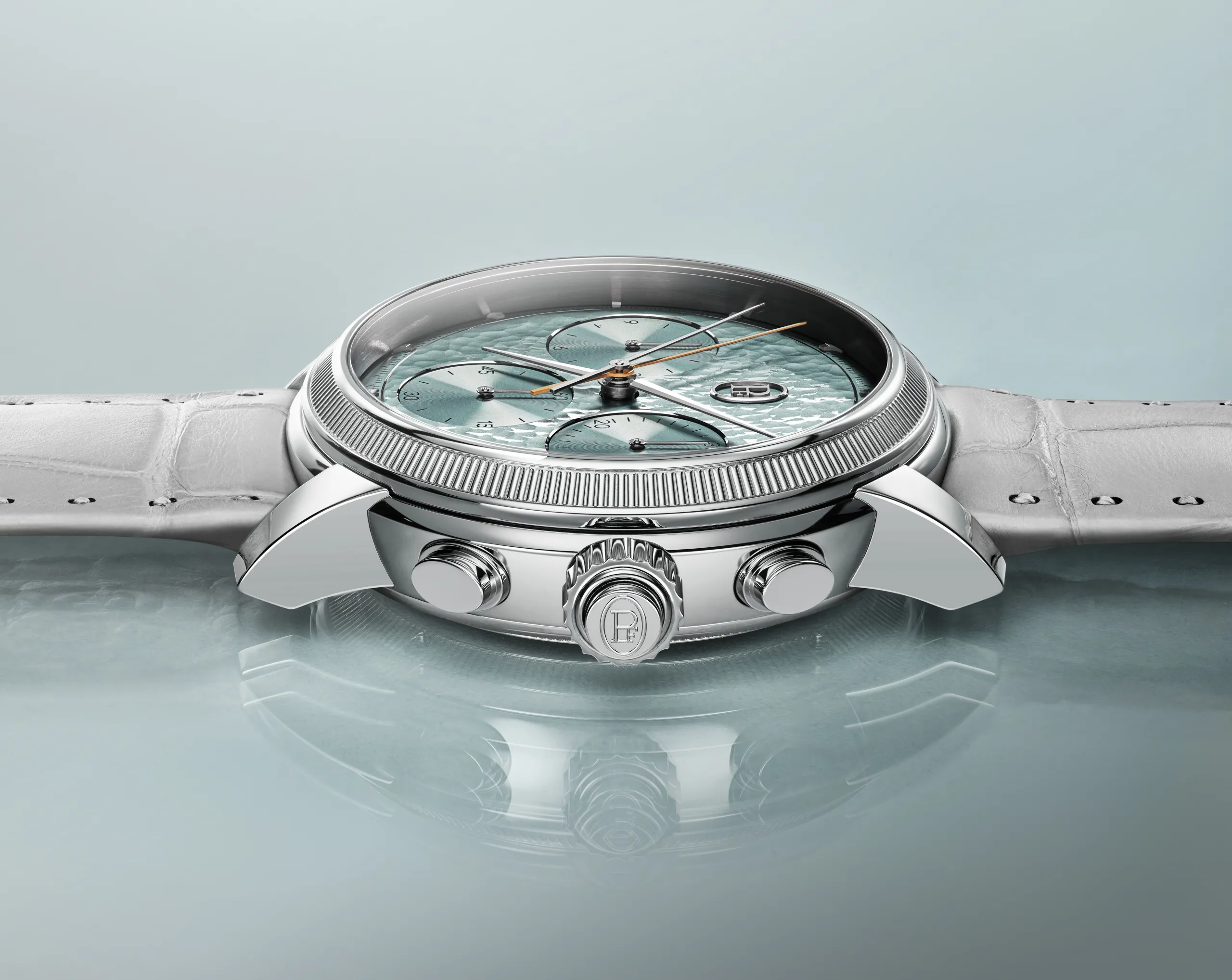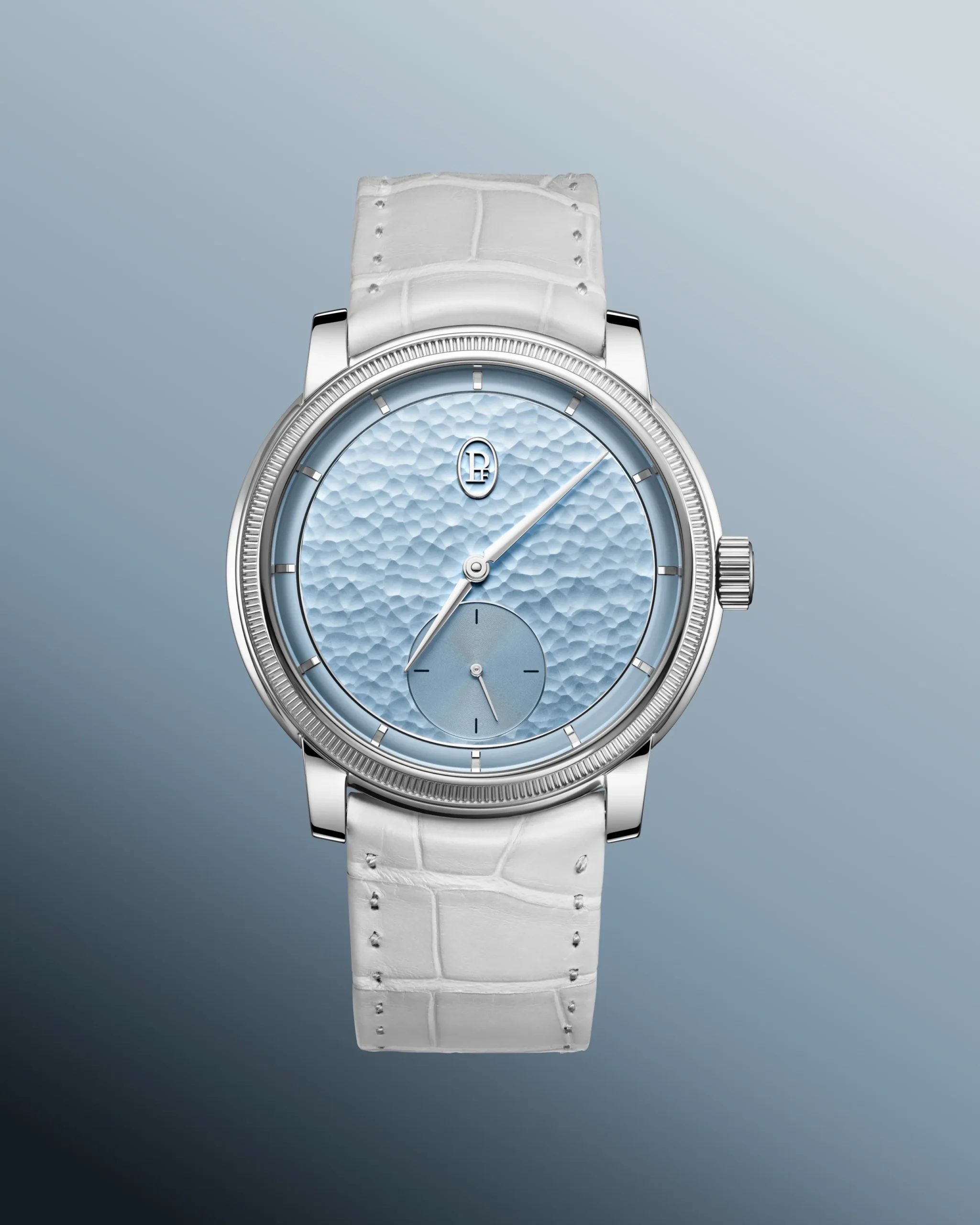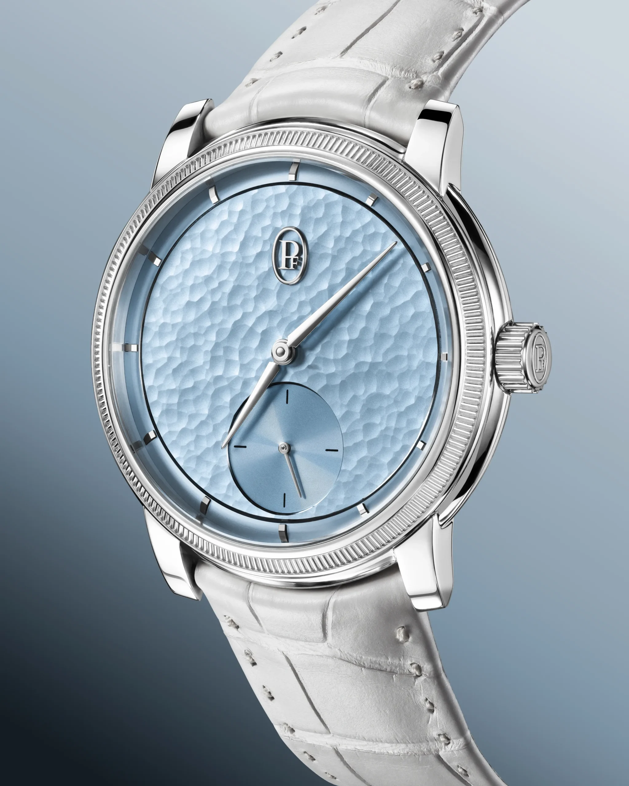 파르미지아니의 해머드 다이얼은 약 60개의 공정을 거쳐 완성된다. 창립 30주년을 맞아 등장한 이 새로운 시그니처는 유럽 은세공, 일본 공예 등 다양한 곳에서 발견되는 전통 금속 가공 기술이다. 장인이 직접 금속을 두드리며 형태를 만들고, 각 타격은 금속을 미세하게 변형시키면서도 완벽한 평면을 유지해야 한다. 완전히 수작업이기 때문에 당연히 리듬, 깊이, 밀도가 모두 달라진다. 결국, 동일한 다이얼은 존재하지 않는다. 이 과정에서 빛을 독특하게 확산시키는 표면이 만들어지고 다이얼은 하나의 살아있는 표면이 된다. 서브 다이얼은 아쥬레(Azure) 마감으로 대비를 이룬다. 다이아몬드 툴로 정밀하게 새긴 미세한 선들이 빛을 반사한다. 이 대비로 다이얼에 더욱 깊은 입체감과 명료함을 선사한다.