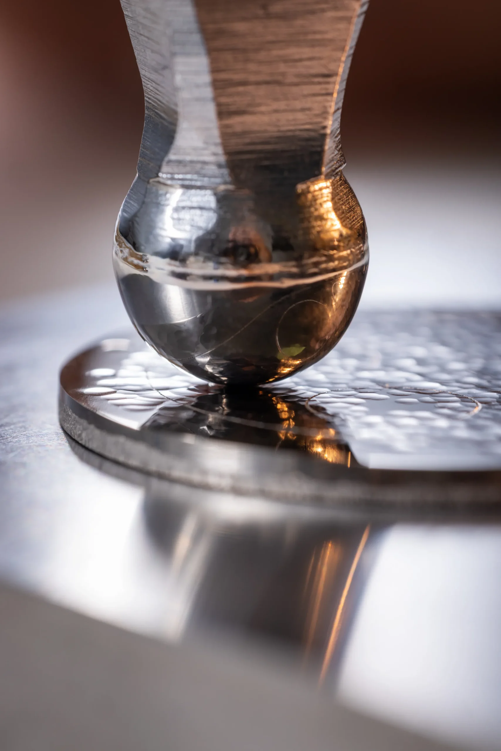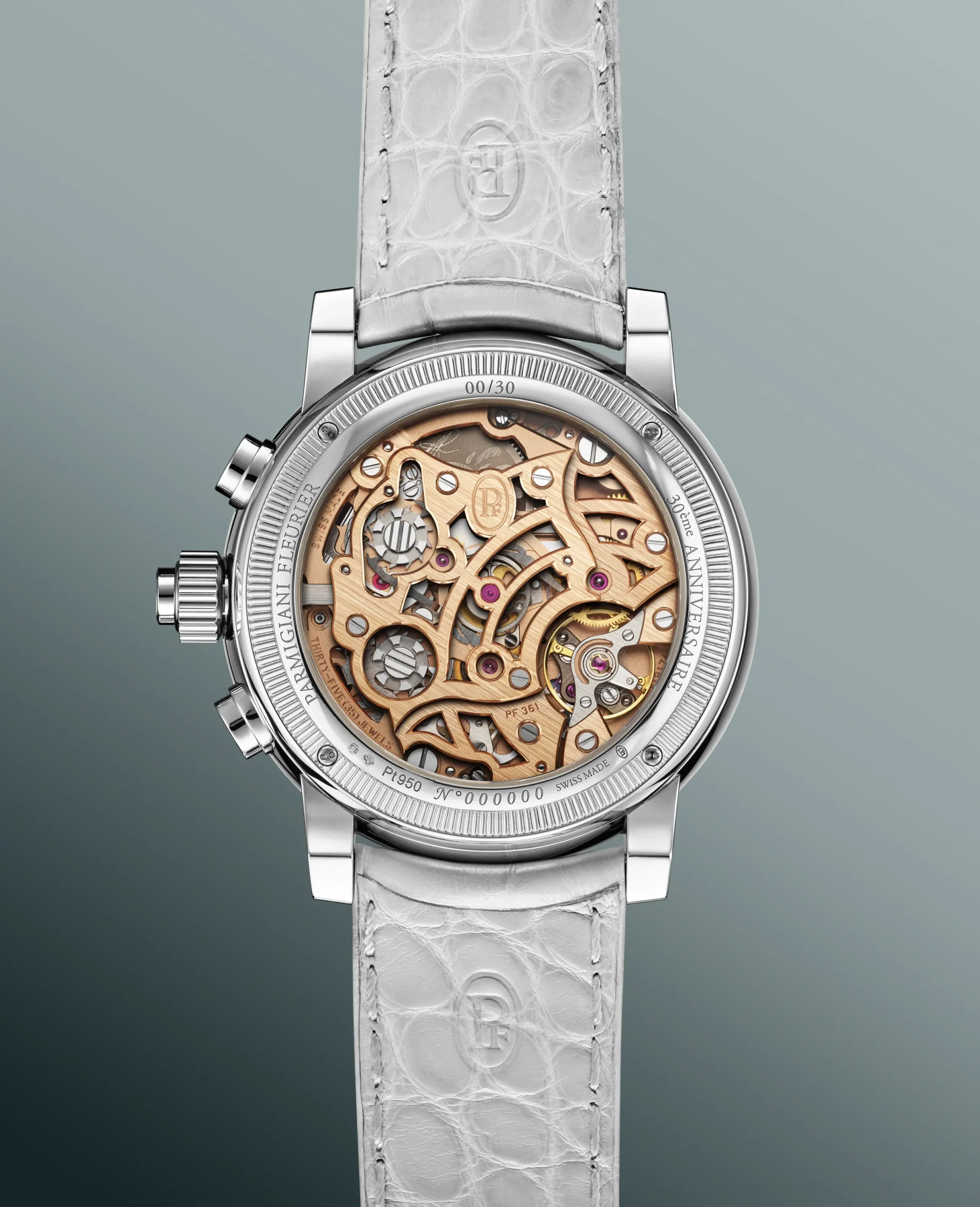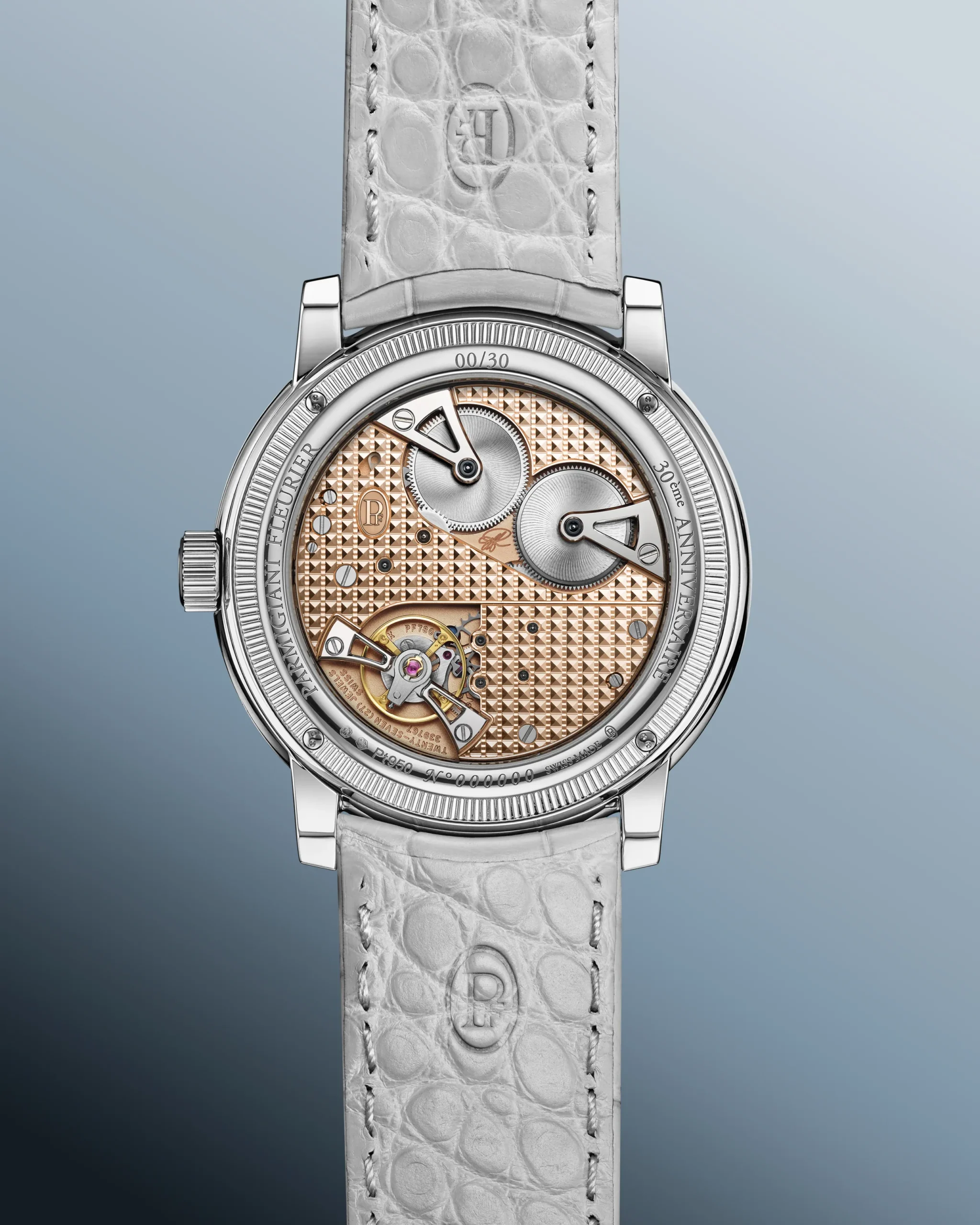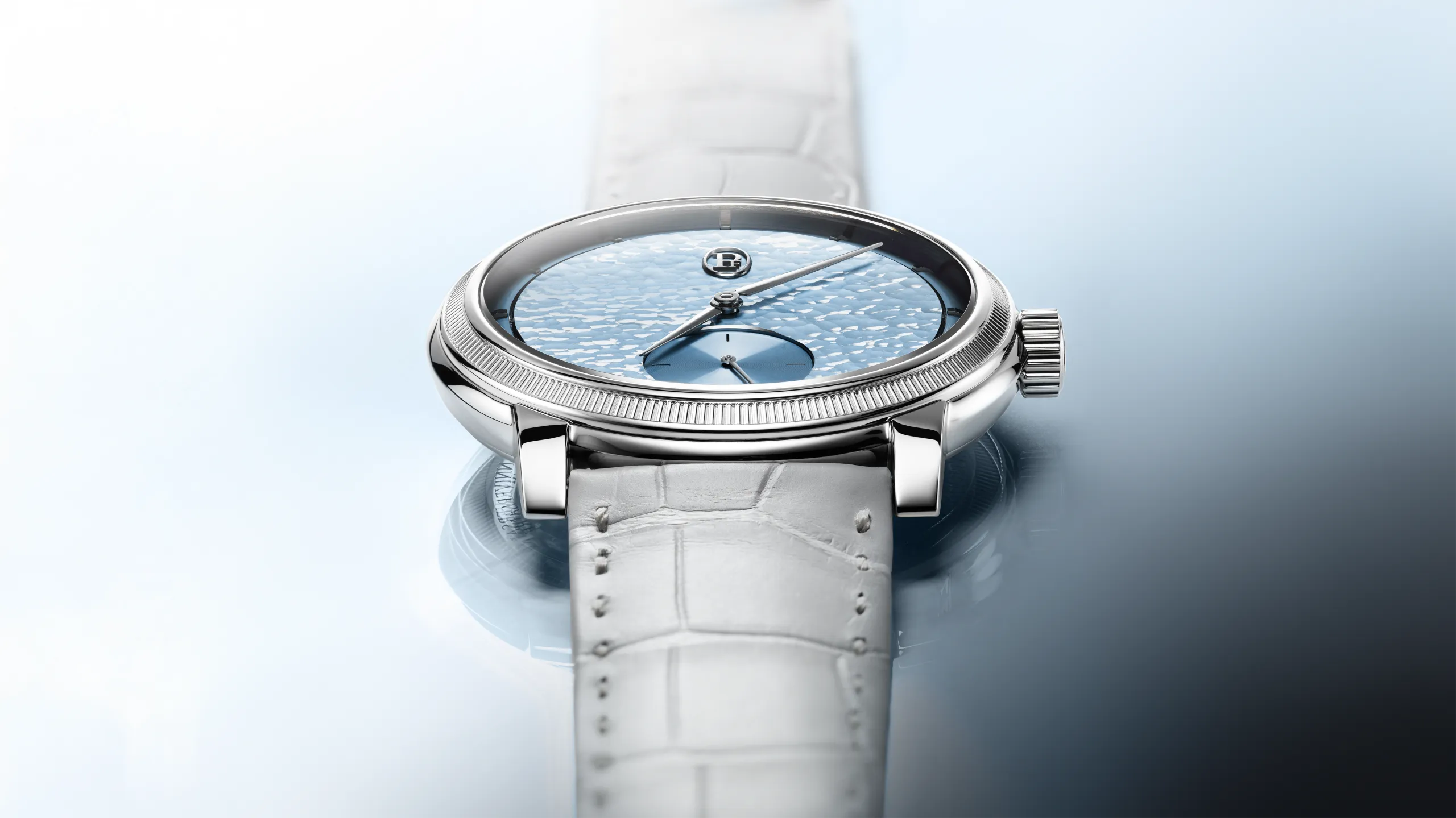 파르미지아니의 해머드 다이얼은 약 60개의 공정을 거쳐 완성된다. 창립 30주년을 맞아 등장한 이 새로운 시그니처는 유럽 은세공, 일본 공예 등 다양한 곳에서 발견되는 전통 금속 가공 기술이다. 장인이 직접 금속을 두드리며 형태를 만들고, 각 타격은 금속을 미세하게 변형시키면서도 완벽한 평면을 유지해야 한다. 완전히 수작업이기 때문에 당연히 리듬, 깊이, 밀도가 모두 달라진다. 결국, 동일한 다이얼은 존재하지 않는다. 이 과정에서 빛을 독특하게 확산시키는 표면이 만들어지고 다이얼은 하나의 살아있는 표면이 된다. 서브 다이얼은 아쥬레(Azure) 마감으로 대비를 이룬다. 다이아몬드 툴로 정밀하게 새긴 미세한 선들이 빛을 반사한다. 이 대비로 다이얼에 더욱 깊은 입체감과 명료함을 선사한다.