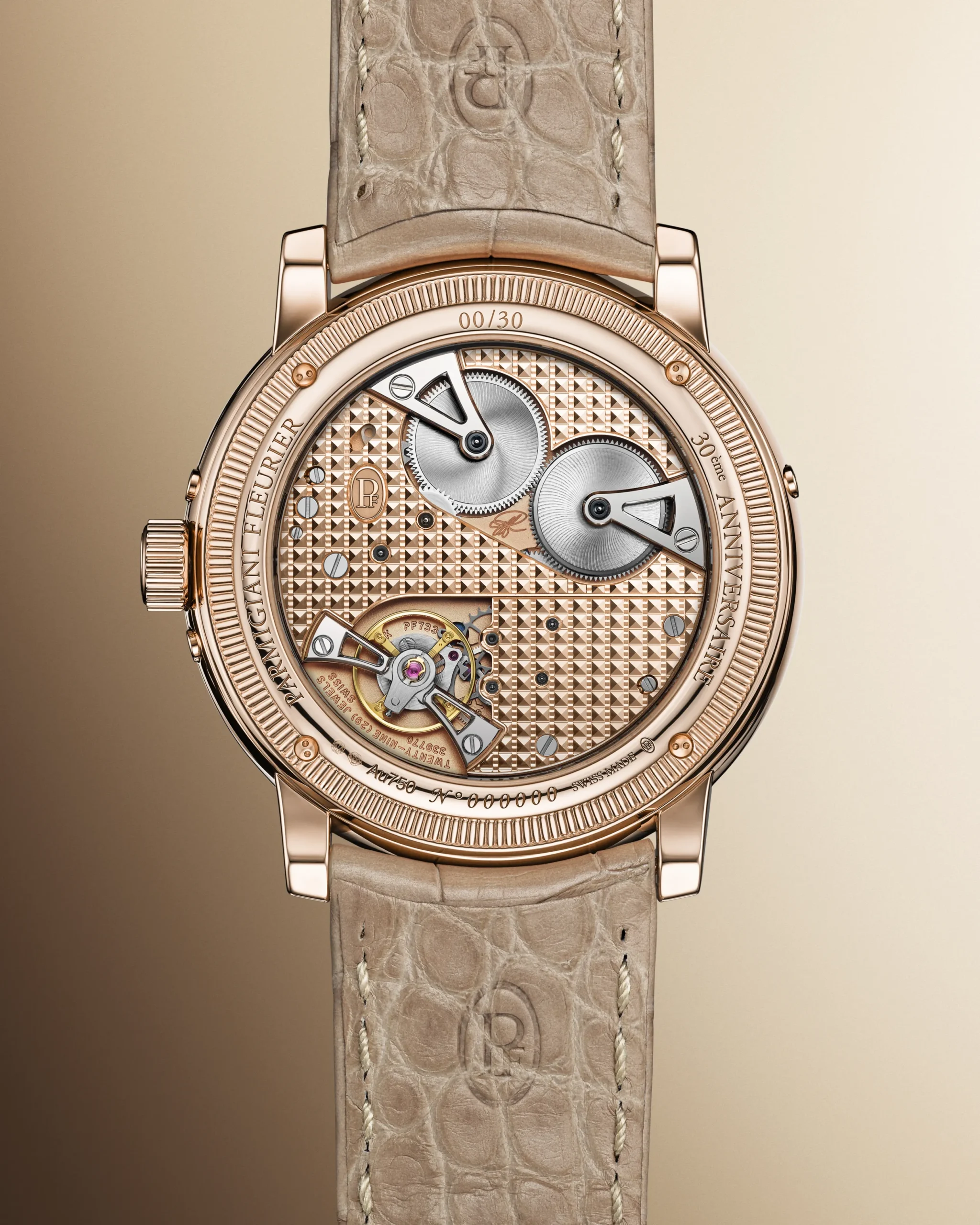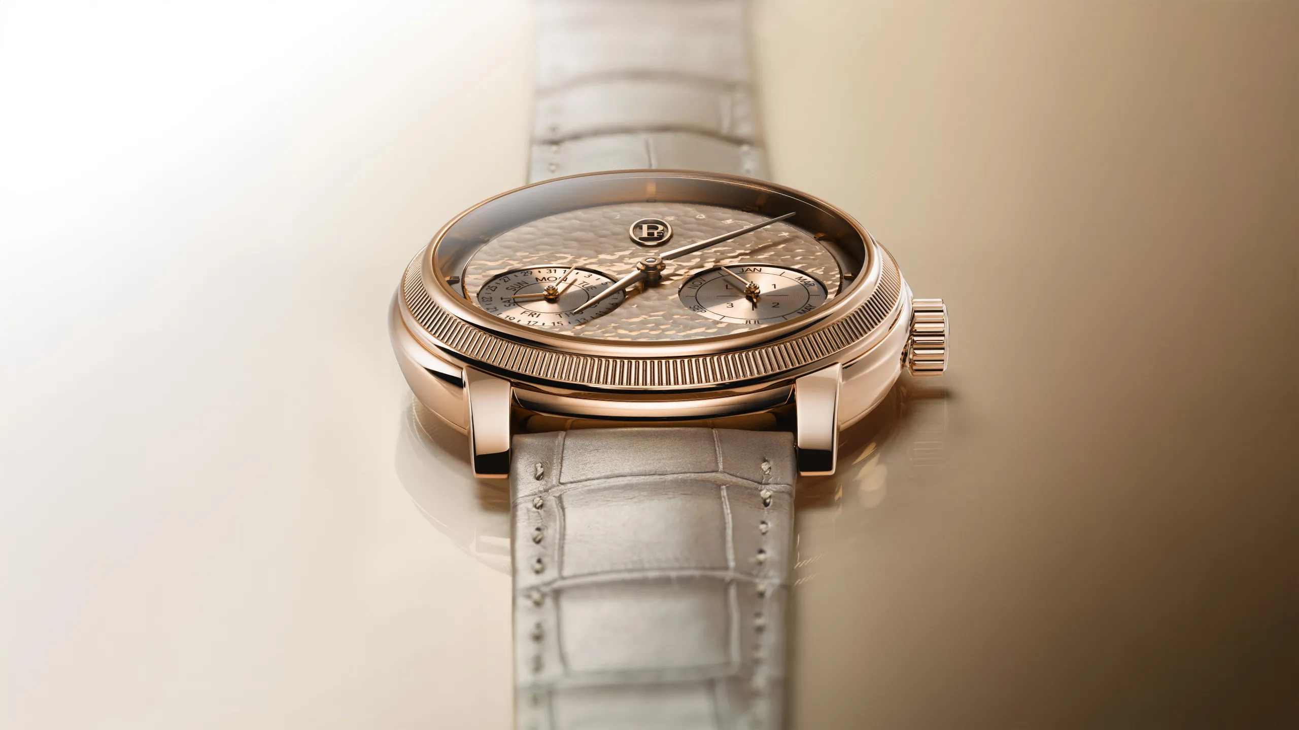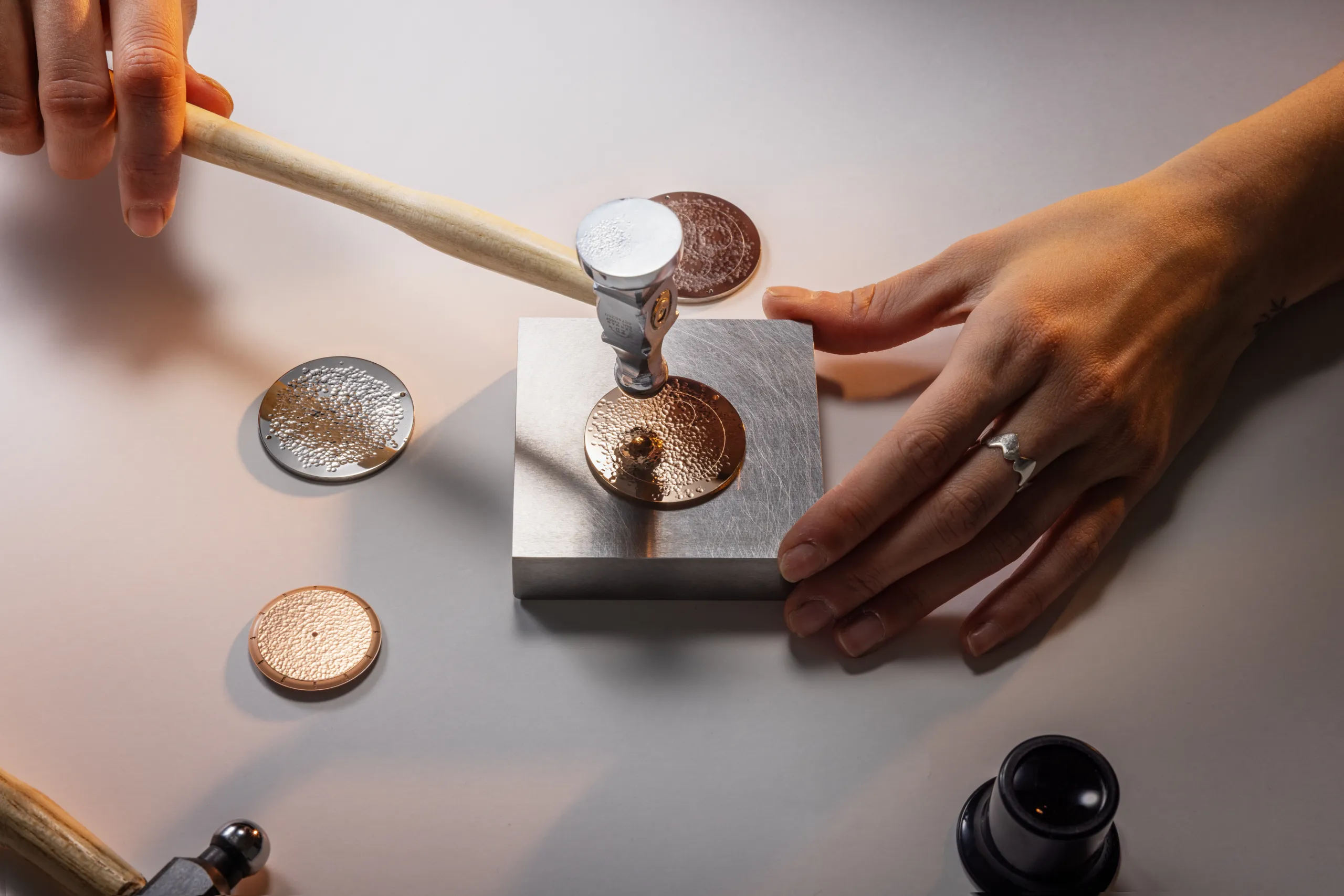 세 모델을 하나로 묶는 핵심은 명확하다. 고대 금속 공예에서 유래한 핸드 해머드(Hand-Hammered) 골드 다이얼의 부활. 그리고 마찬가지로 핸드 피니시로만 완성할 수 있는 높은 수준의 완성도를 지닌 골드 무브먼트다.