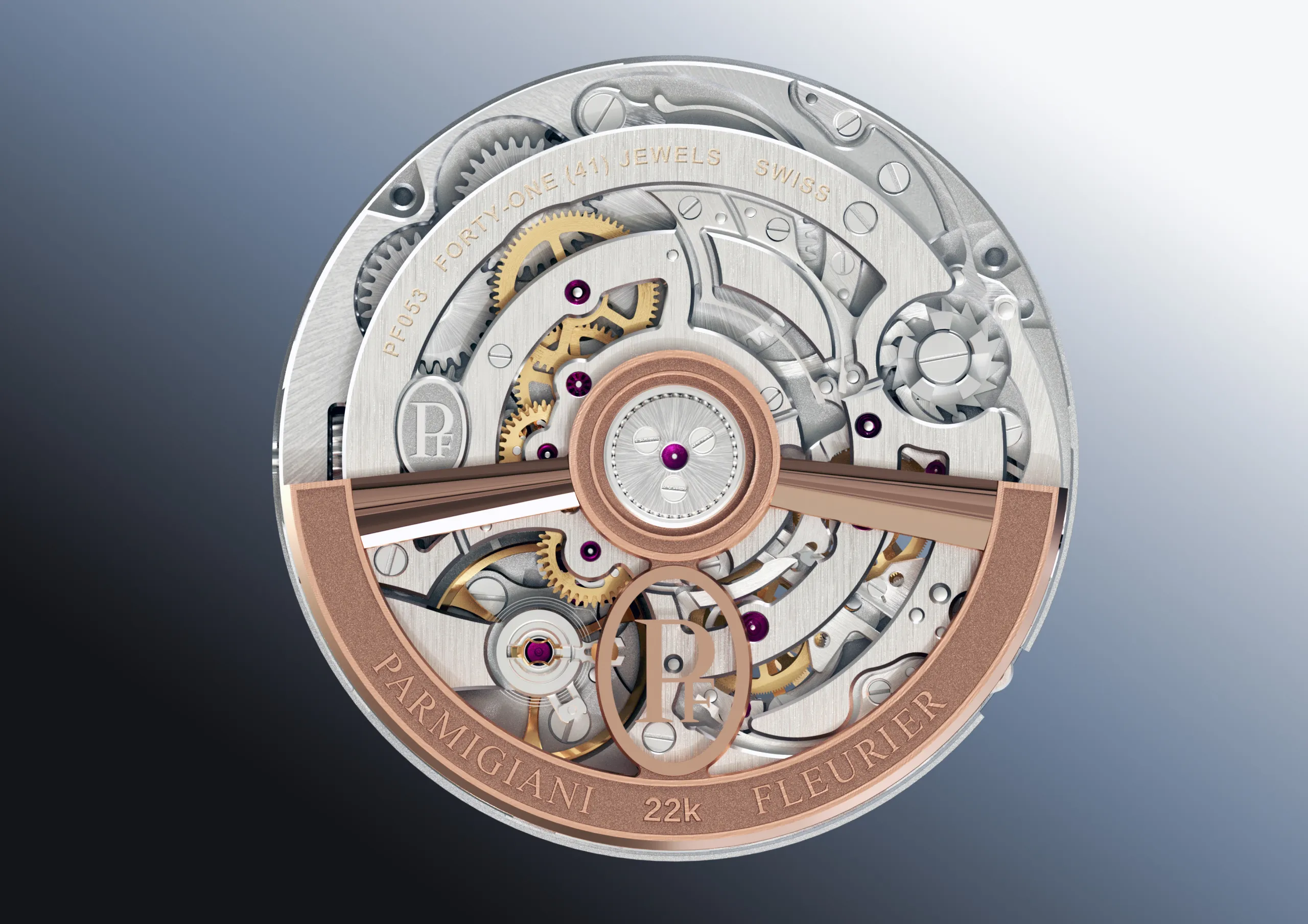 칼리버 PF053은 총 362개의 부품으로 구성된 인하우스 통합 크로노그래프 무브먼트다. 두께는 6.8mm, 진동수 28,800vph(4Hz), 파워리저브는 60시간을 제공한다. 트리플 클러치 구조로 핸즈의 중첩과 변환을 가능하게 하며, 모든 작동은 완벽한 동기화 속에서 이루어진다. 뛰어난 와인딩 효율을 위해 채택한 22K 로즈골드 로터, 오픈워크 브리지, 베벨링 마감 등 장식 역시 메종의 기준을 충실히 따르고 있다.