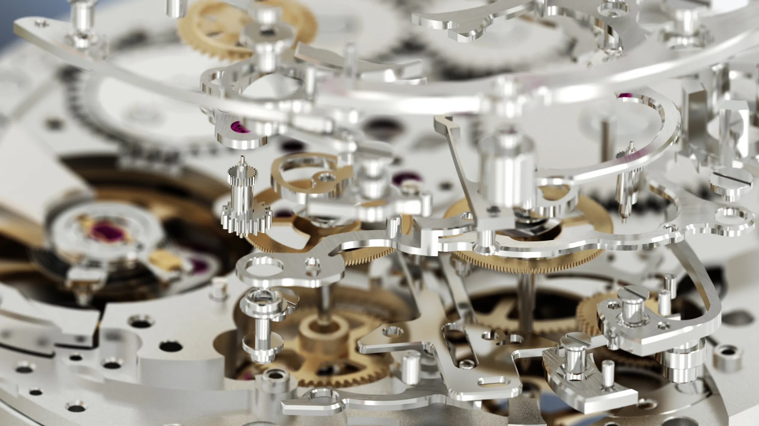 이 모델의 핵심은 완전히 새로운 크로노그래프 구조에 있다. 다이얼 중앙에는 총 5개의 동축 핸즈가 겹쳐져 있으며, 평소에는 일반적인 시·분·초를 표시한다. 하지만 스탑워치 작동 시에는 이를 위해 숨어 있던 핸즈가 즉시 전개되며 크로노그래프 시·분·초를 측정하고, 나머지 두 개의 핸즈는 여전히 기존의 시간을 유지한다. 즉, 하나의 다이얼 위에서 두 개의 시간이 완벽하게 공존하는 구조다. 이 시스템은 수년에 걸쳐 개발된 결과이며, 기존 크로노그래프의 개념을 근본적으로 다시 설계한 사례다.