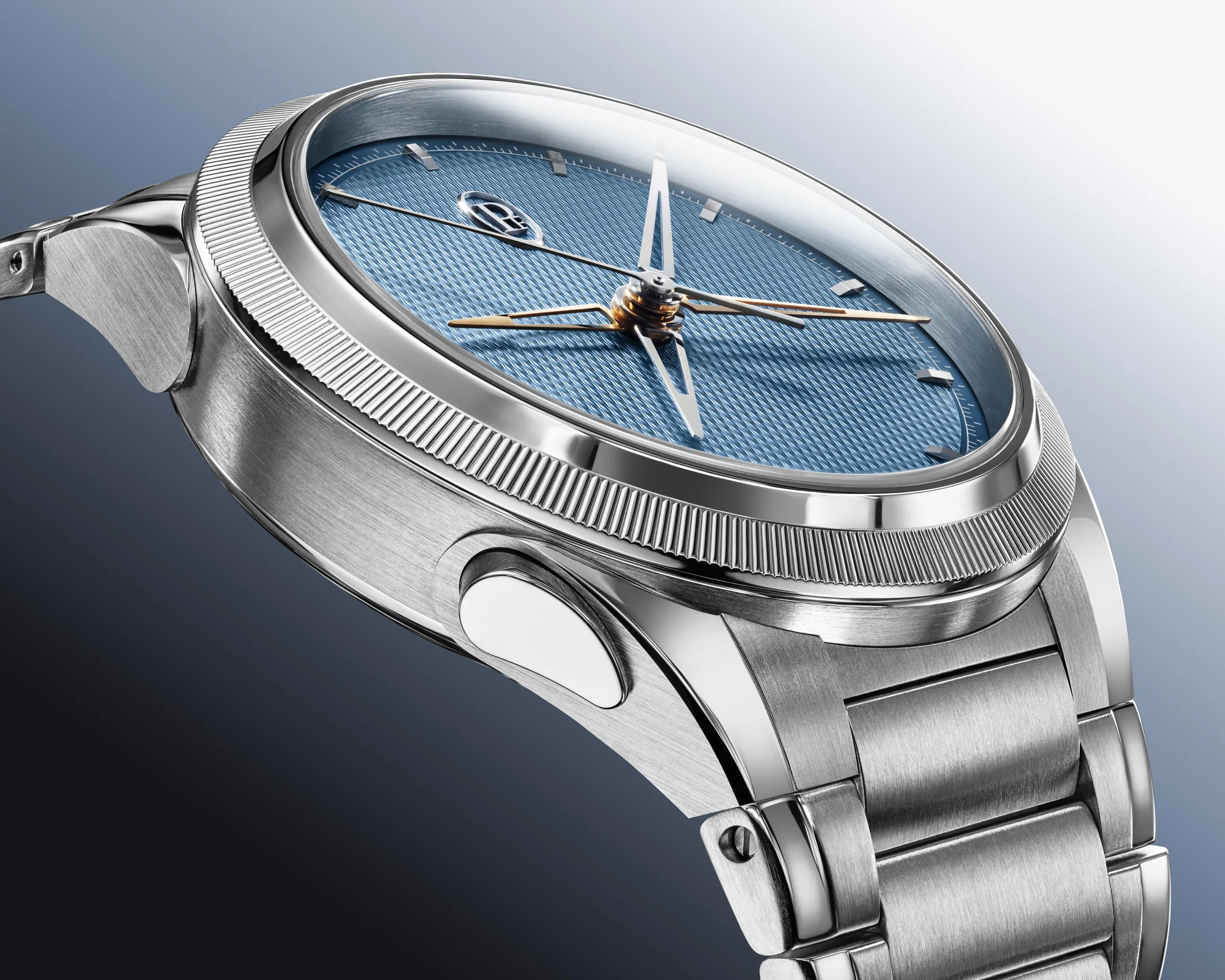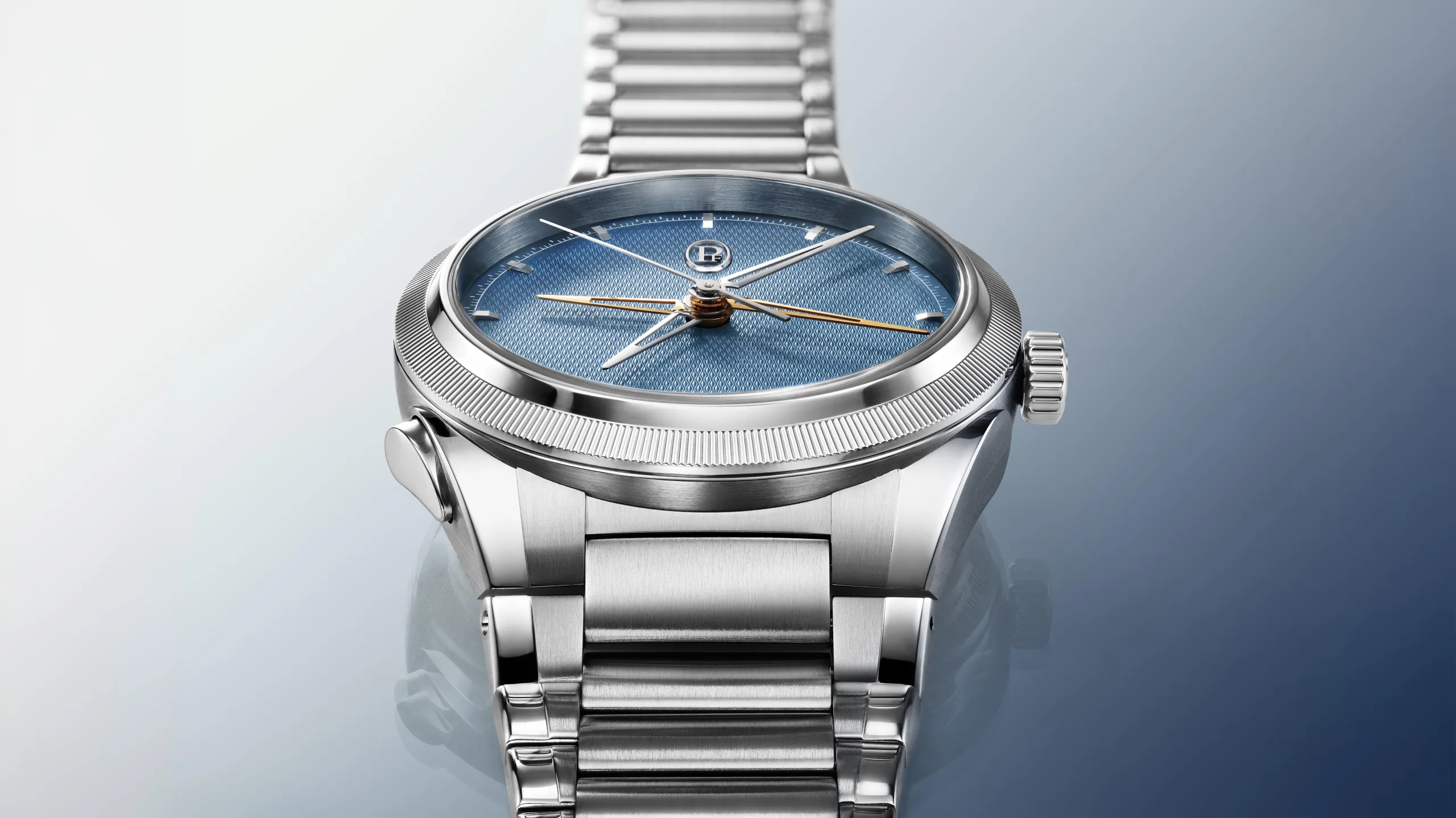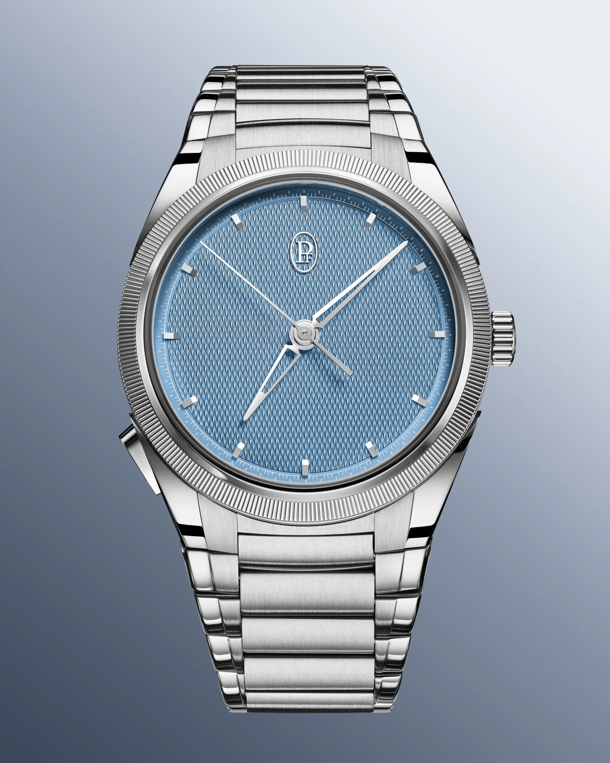 다이얼은 톤다 PF 특유의 미학을 따른다. 미네랄 블루 컬러 위에 그레인 도르주 기요셰가 더해지며, 빛에 따라 깊이와 질감이 살아 움직인다. 플래티넘으로 제작한 널링 베젤과 일체형 브레이슬릿은 케이스와 자연스럽게 이어지며, 전체적인 균형을 완성한다. 이 시계의 존재감은 과시가 아닌 정제된 침묵이다.