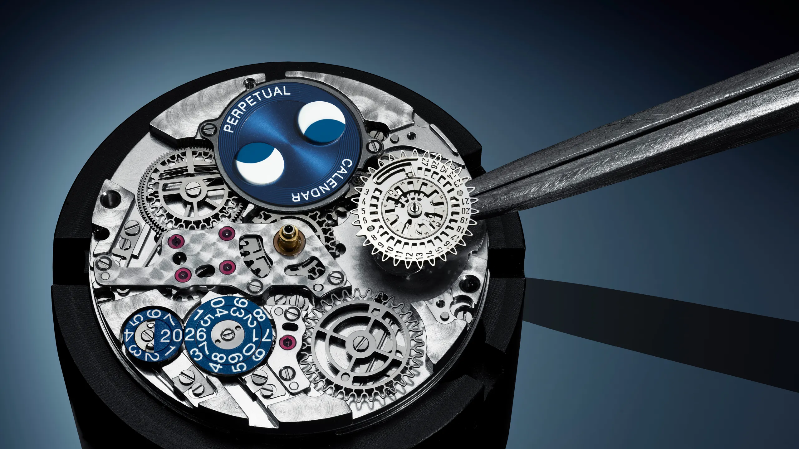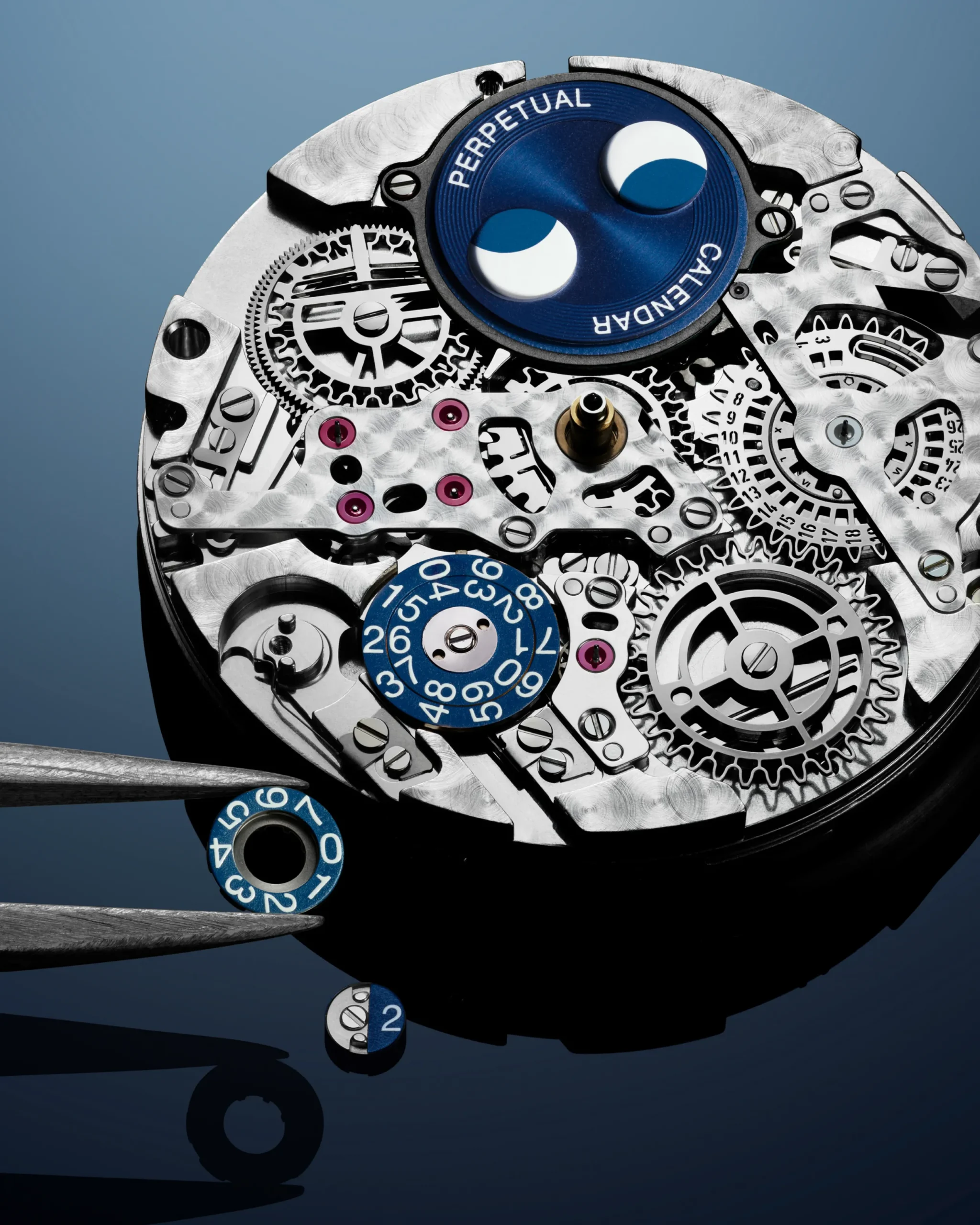이번 프로셋 기술의 핵심은 전방과 후방 양방향으로 캘린더를 조정할 수 있는 구조다. 기존 퍼페추얼 캘린더가 보정 버튼이나 별도의 크라운 포지션 변경을 요구했던 것과 달리, 프로셋은 같은 크라운 포지션에서 시간을 맞추듯 직관적으로 캘린더를 앞뒤로 조정할 수 있다. 여러 개의 기능적 레이어와 돌출·내장 방식의 플렉서블 핑거를 갖춘 기어 구조를 적용한 덕분이다. 특허 출원된 이 설계는 각 디스플레이를 하루 단위로 정밀하게 이동시킬 수 있다.