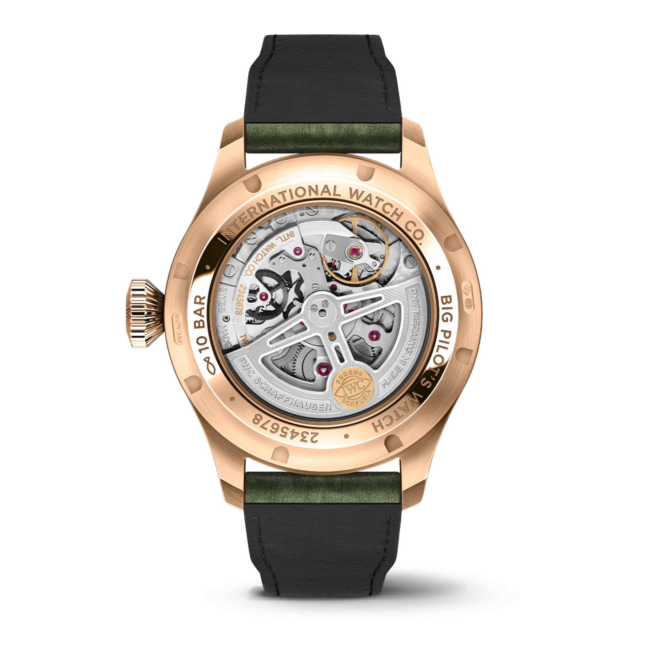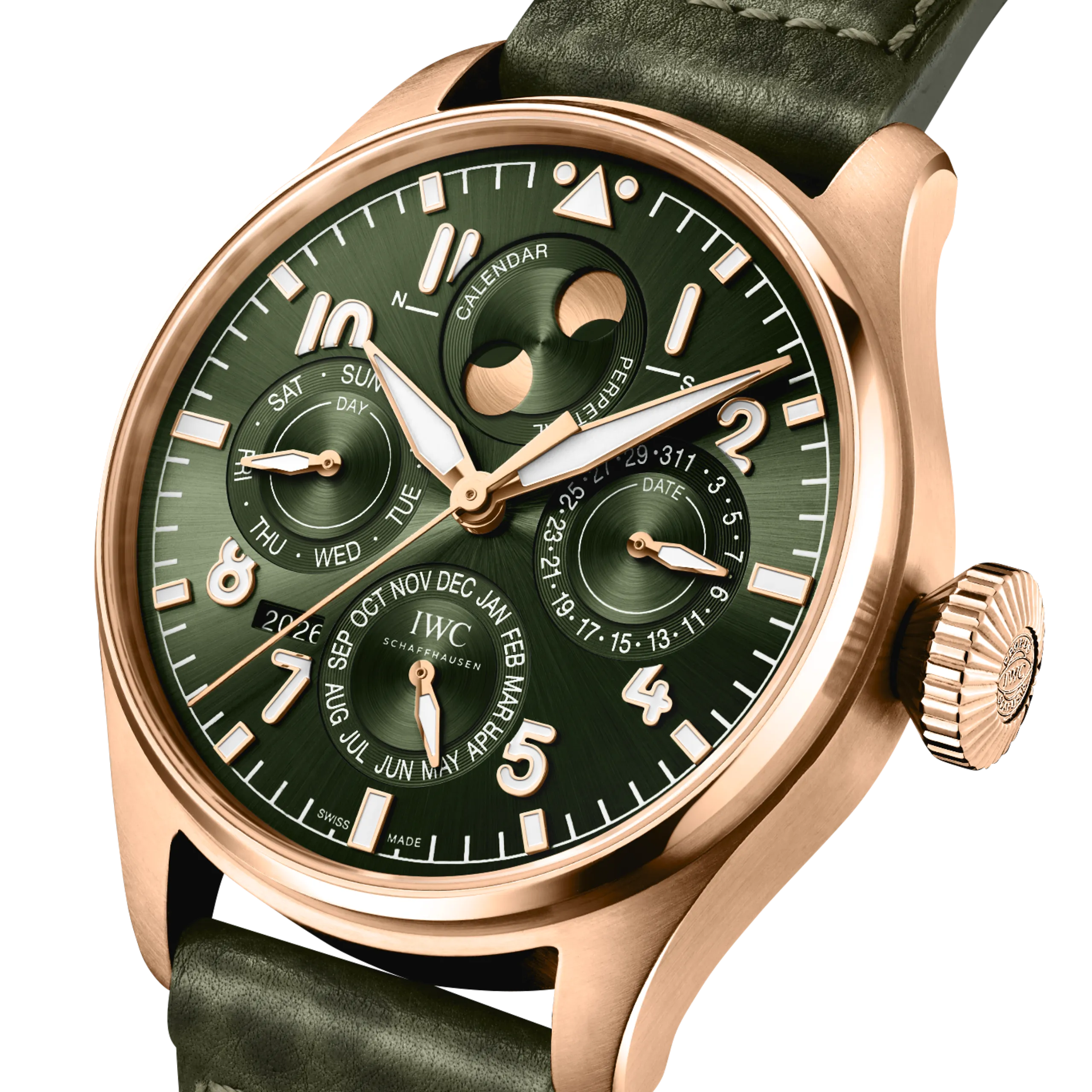 빅 파일럿 워치 퍼페추얼 캘린더 프로셋 골드 모델(Ref. IW329602)은 직경 42mm의 18K 5N 골드 케이스 및 크라운으로 구성된다. 다크 올리브 그린 다이얼에 골드 아플리케 인덱스와 골드 도금 핸즈가 조화를 이루며, 올리브 그린 버팔로 레더 스트랩과 18K 5N 골드 핀 버클이 장착된다.