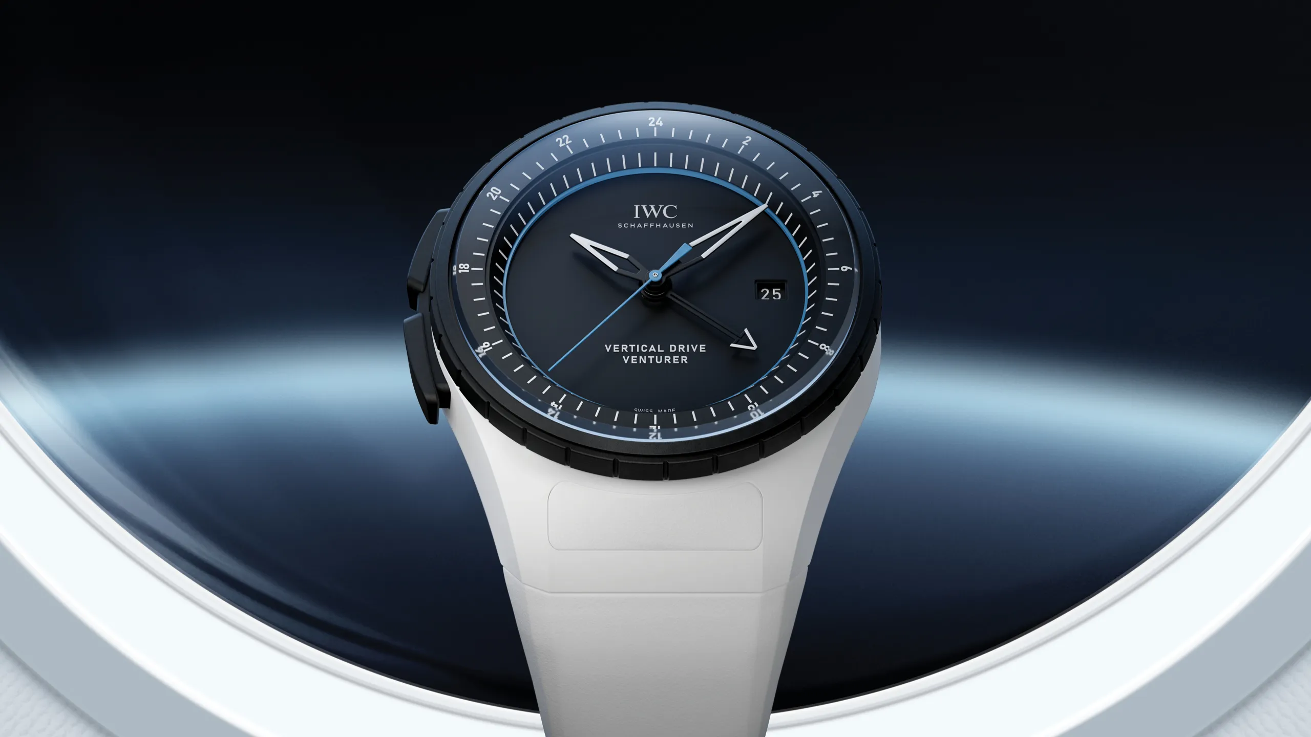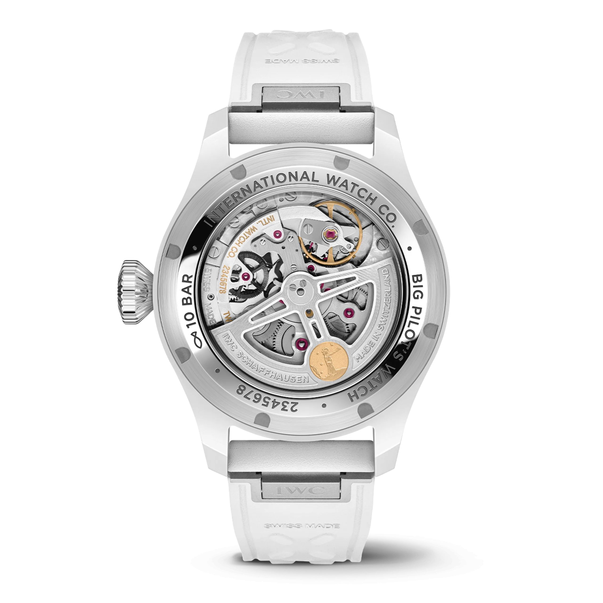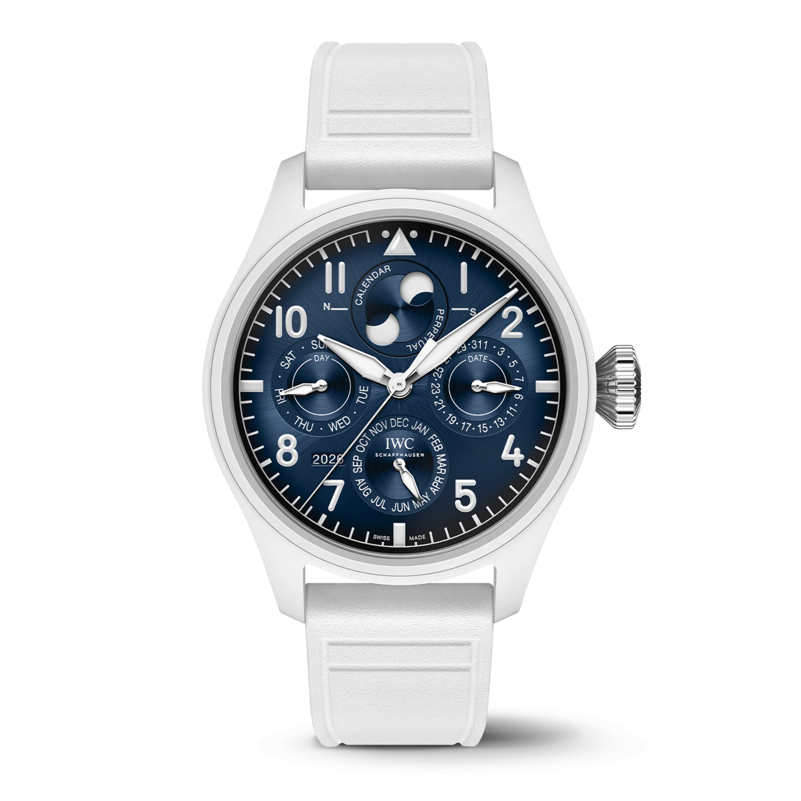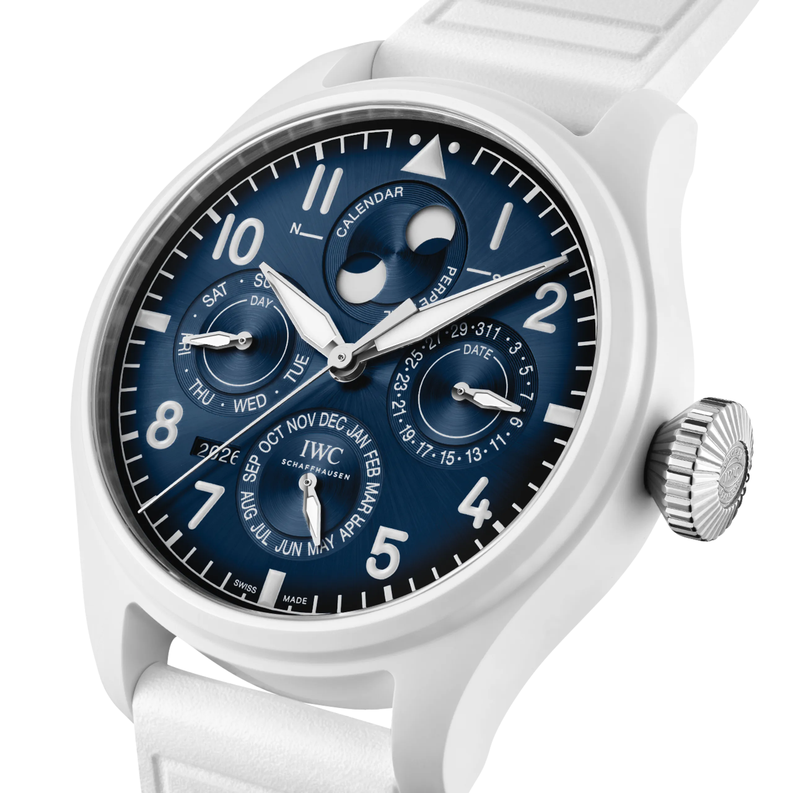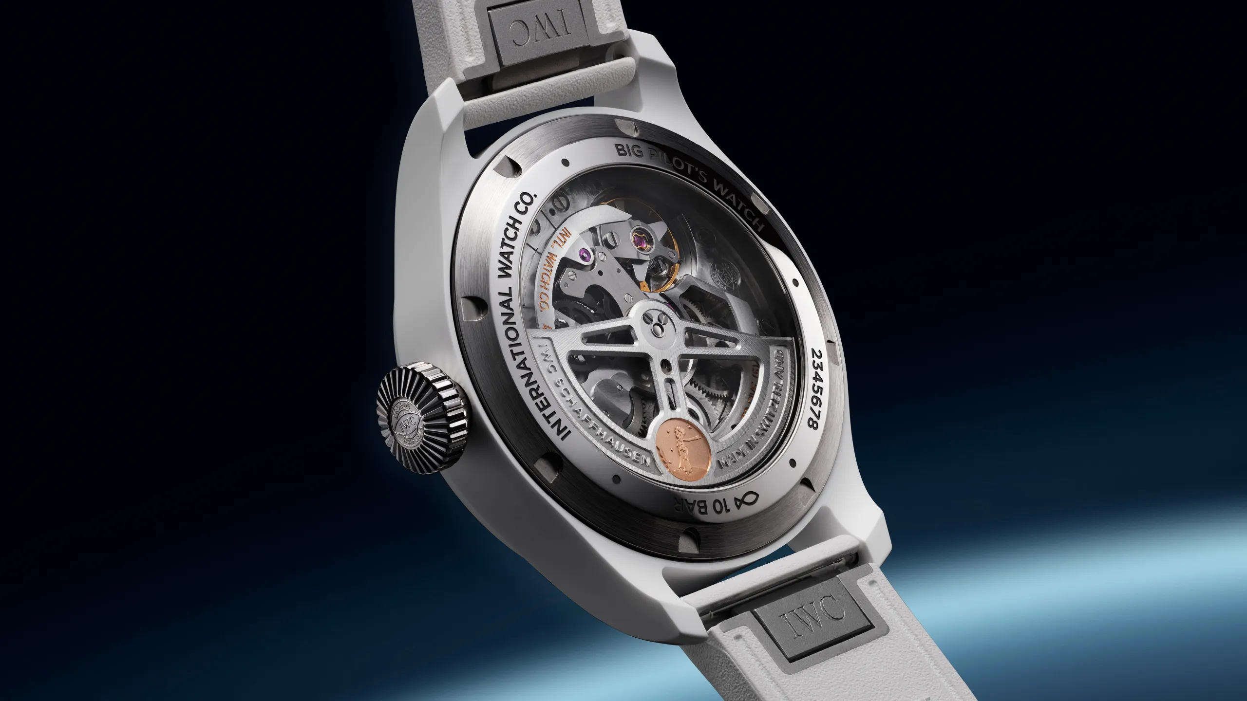 빅 파일럿 워치 퍼페추얼 캘린더 프로셋 어린 왕자 화이트 세라믹 모델(Ref. IW339601)은 직경 42.9mm의 화이트 산화지르코늄 세라믹 케이스에 그라데이션 딥 블루 다이얼을 조합했다. 숫자와 인덱스는 화이트 컬러로 프린팅했고, 핸즈는 로듐 도금에 슈퍼 루미노바®를 채웠다. 스트랩은 EasX-CHANGE® 시스템이 적용된 화이트 러버 스트랩이 체결된다.